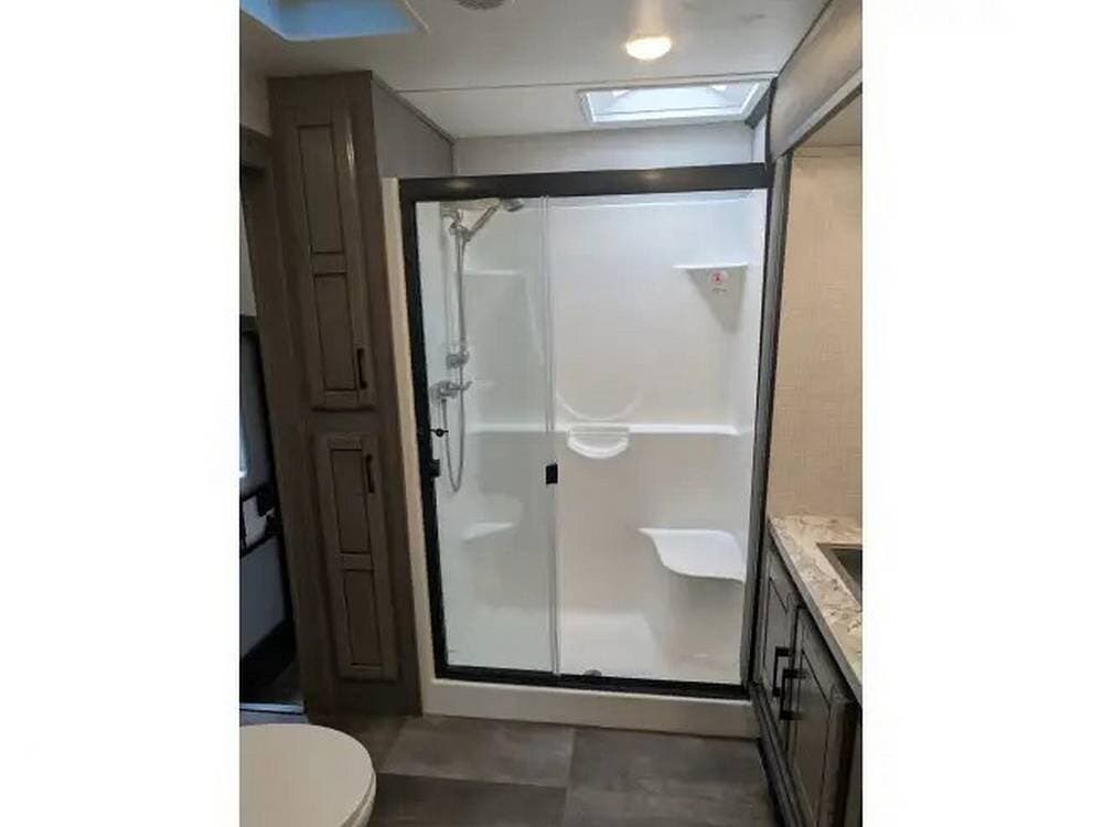 The master suite offers a peaceful retreat with a king-size bed, ample wardrobe space, and direct access to a beautifully finished bathroom with a large walk-in shower, double vanity, and washer/dryer hookups. Premium materials, soft lighting, and thoughtful details are found throughout the coach, showcasing CrossRoads' commitment to quality and comfort.