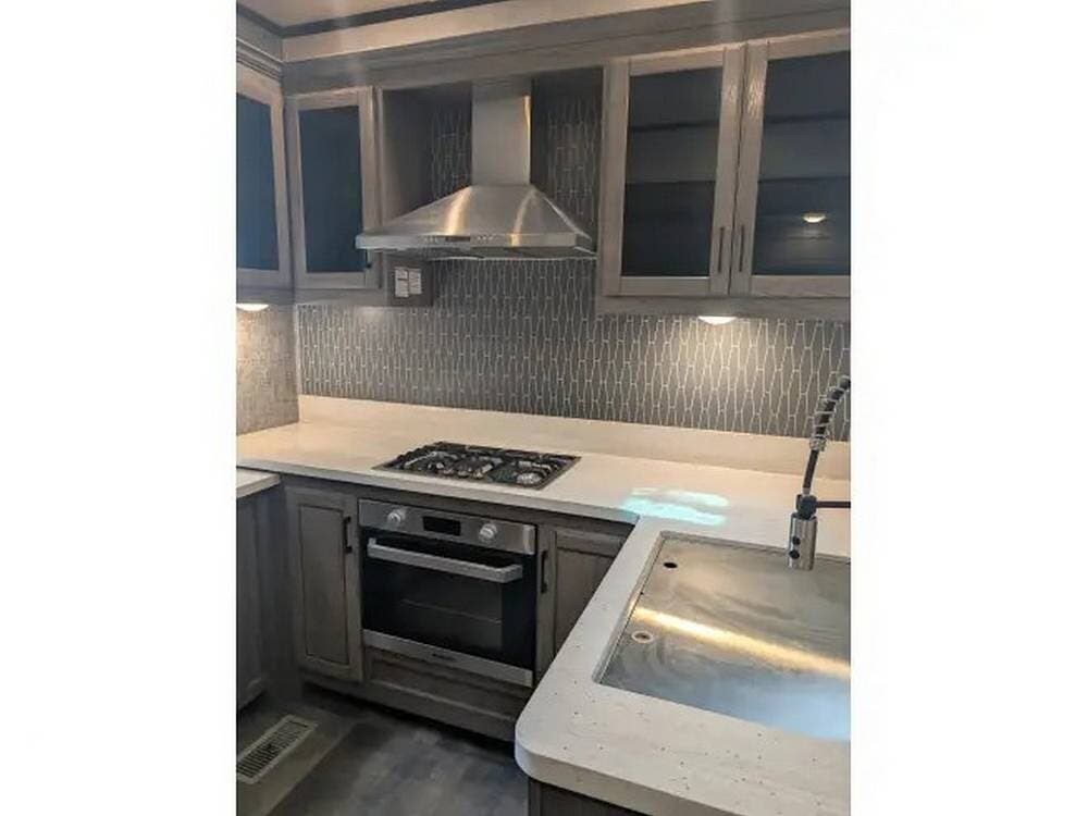 The kitchen is a chef's dream, equipped with solid-surface countertops, a large island with a deep farmhouse sink, residential stainless-steel appliances, and a generous pantry. Whether you're preparing a quick breakfast or a full dinner, this kitchen makes cooking on the road a pleasure.