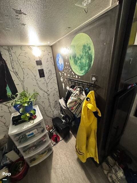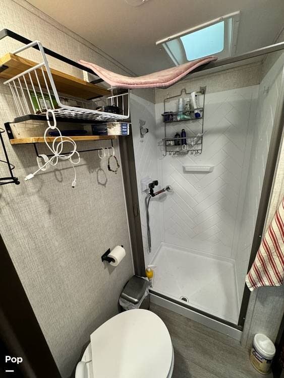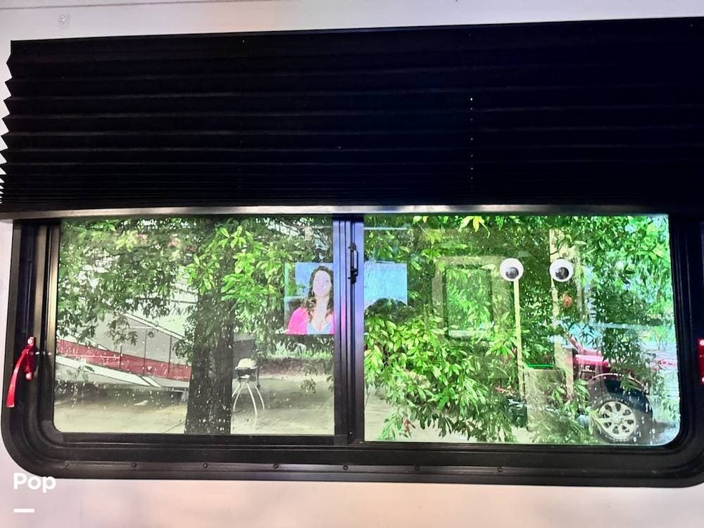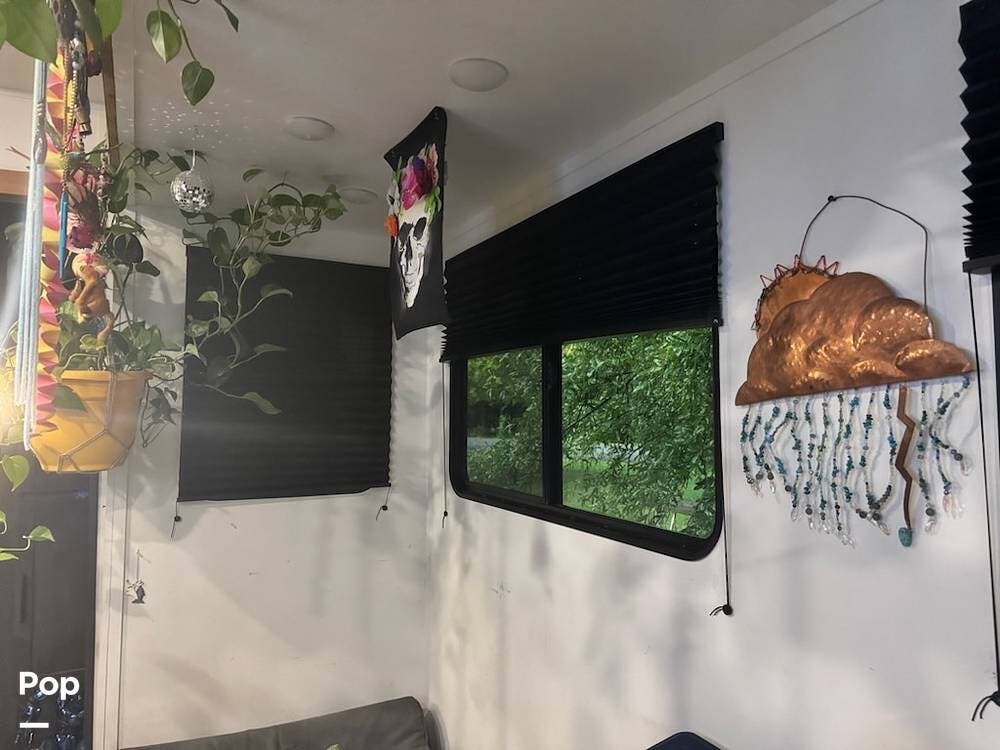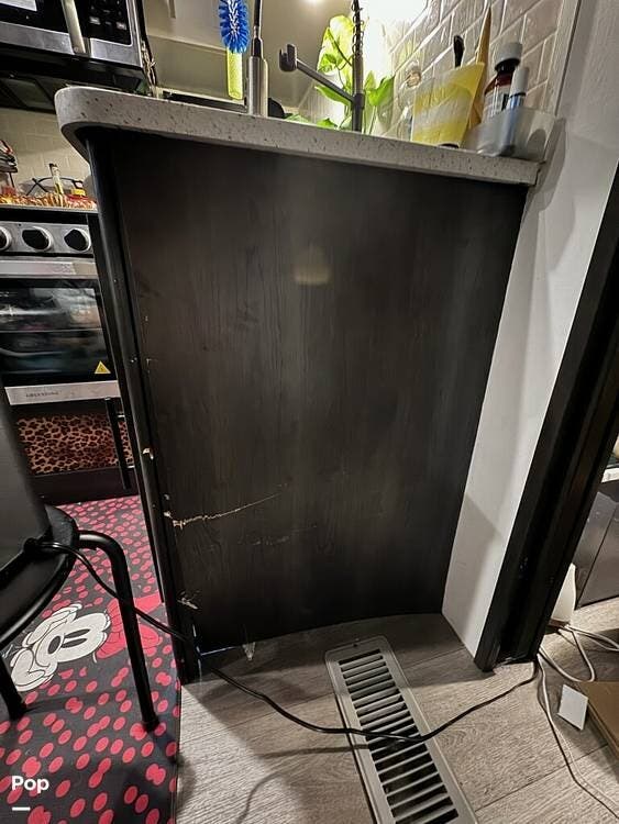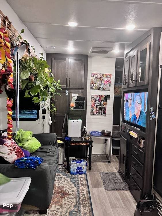 The RV is used and is currently being lived in full-time. It has one slide that opens up the living space and dining area.