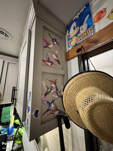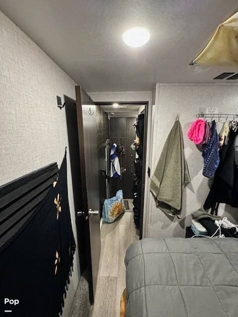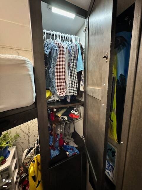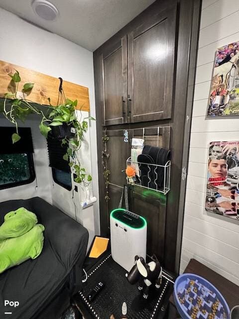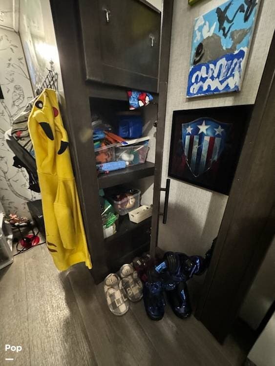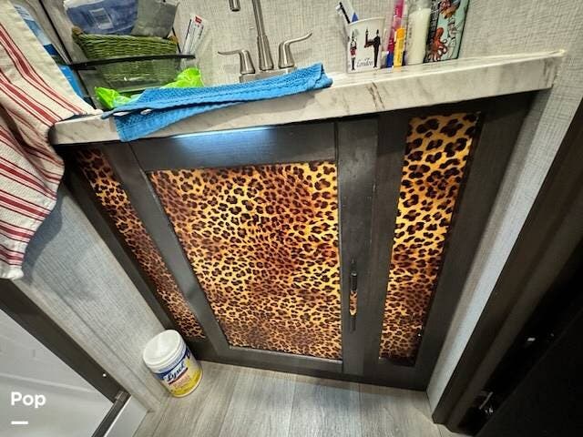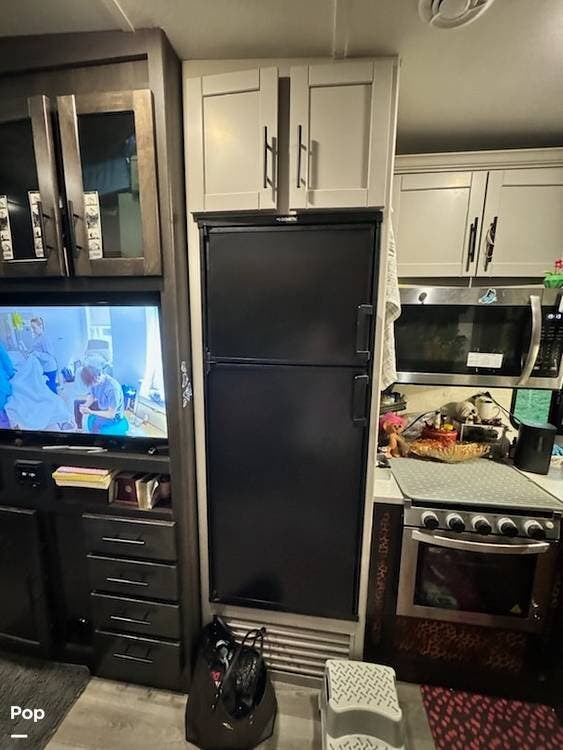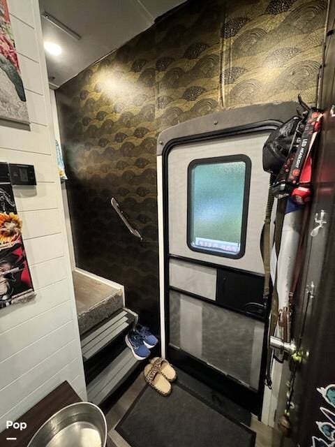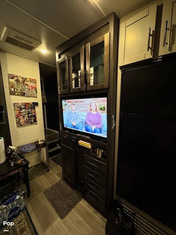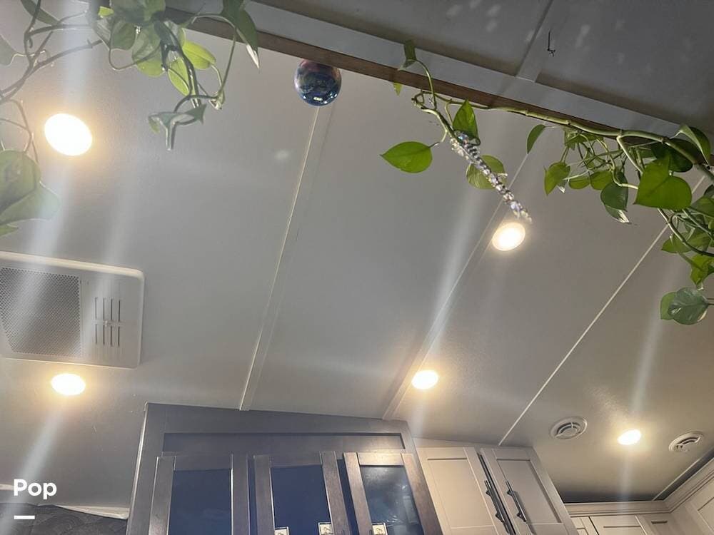 The RV offers plenty of storage inside and out and has an outdoor kitchen with a fridge and gas cook grill.