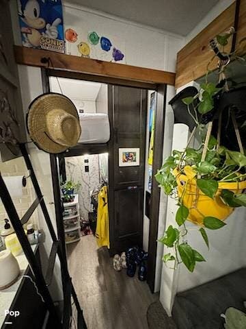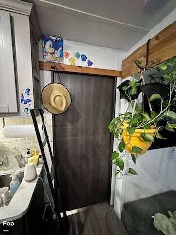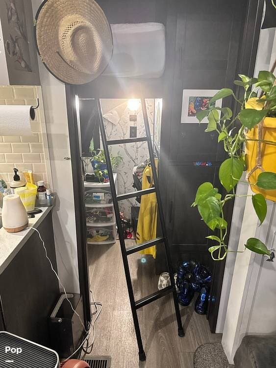 The bathroom is next to the master bedroom at the steps, just off the kitchen area. It has a nice shower, vanity, and toilet.