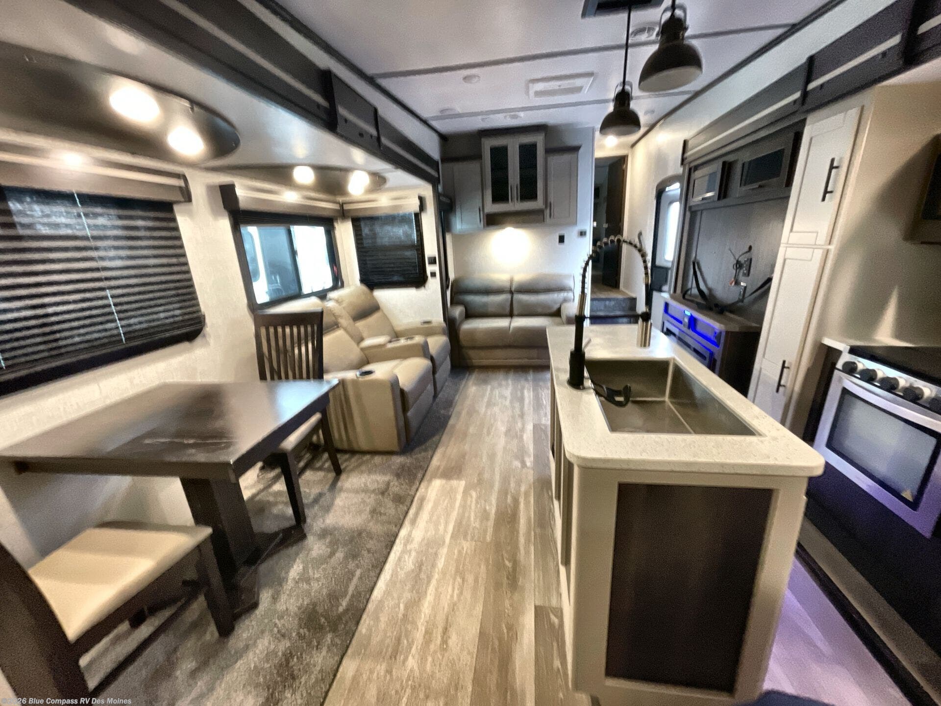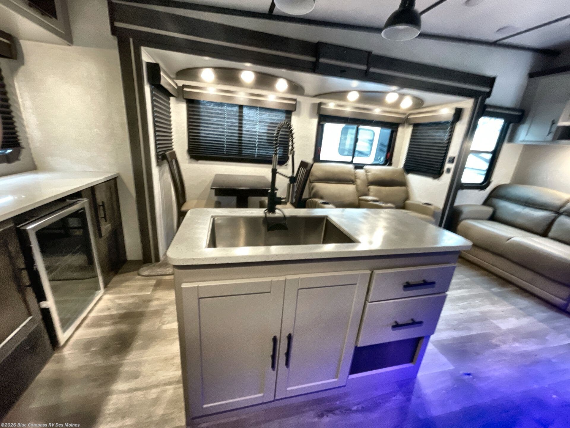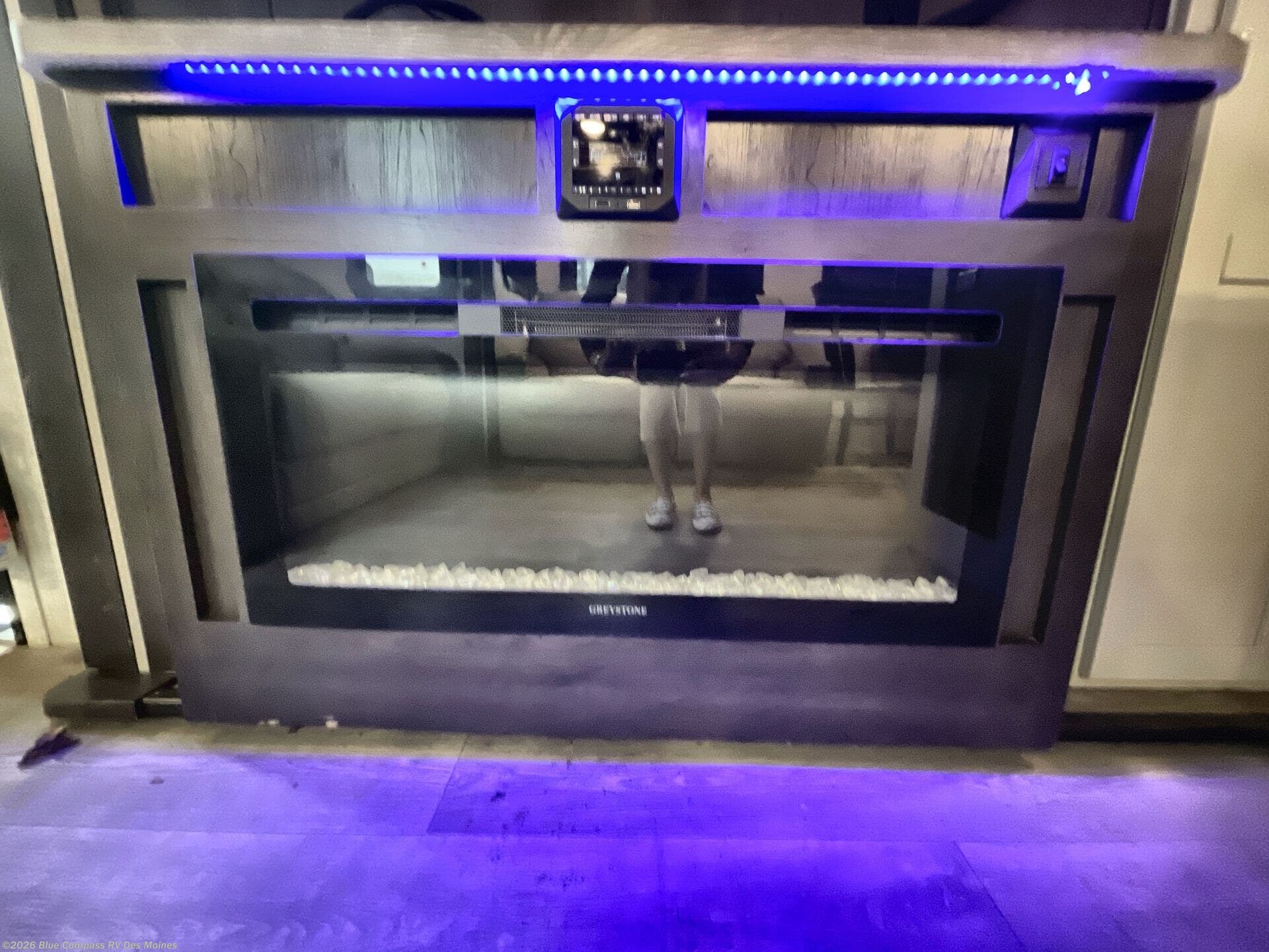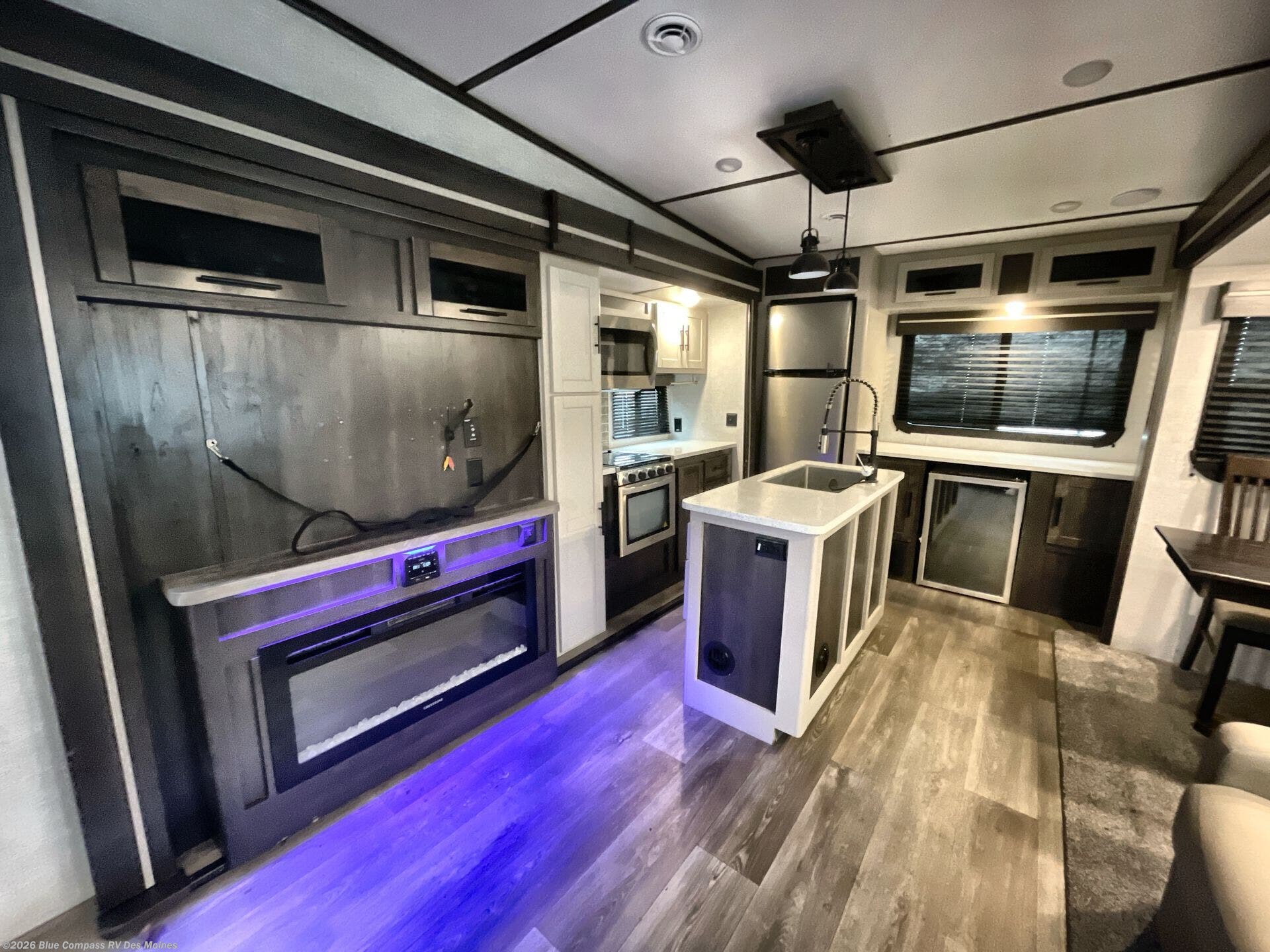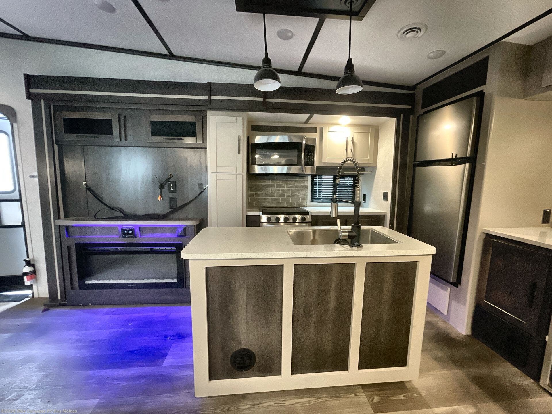 This fifth wheel features at-home comforts for relaxing vacations. The theater seats are directly across from the entertainment center and fireplace for a cozy evening indoors, and the dual opposing slides here create an open floor plan. The chef of the family will love cooking in the rear kitchen that includes plenty of counter space, a kitchen island, plus a pantry for dry goods and snacks. This model also includes an outdoor kitchen to grill the catch-of-the-day on, and the power awning with LED lights will be the perfect place to relax under. The dual entry bath will create a front master bedroom you are sure to love. Here, the queen bed will provide a great night's rest, and you'll find extra storage space within the slide out!