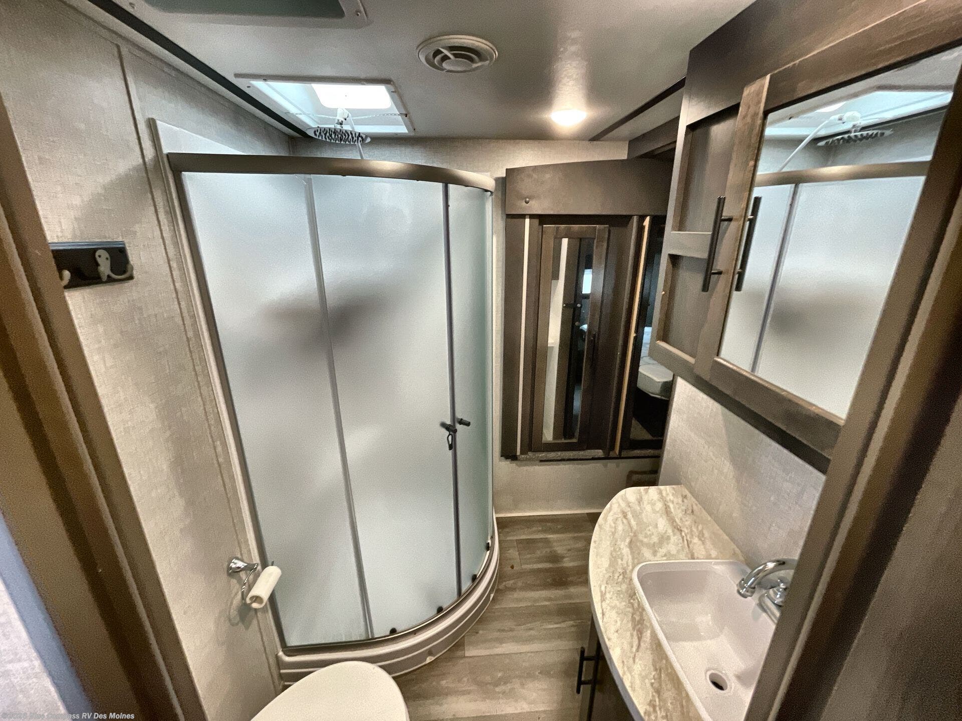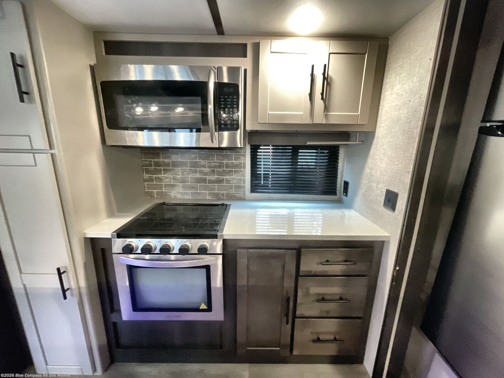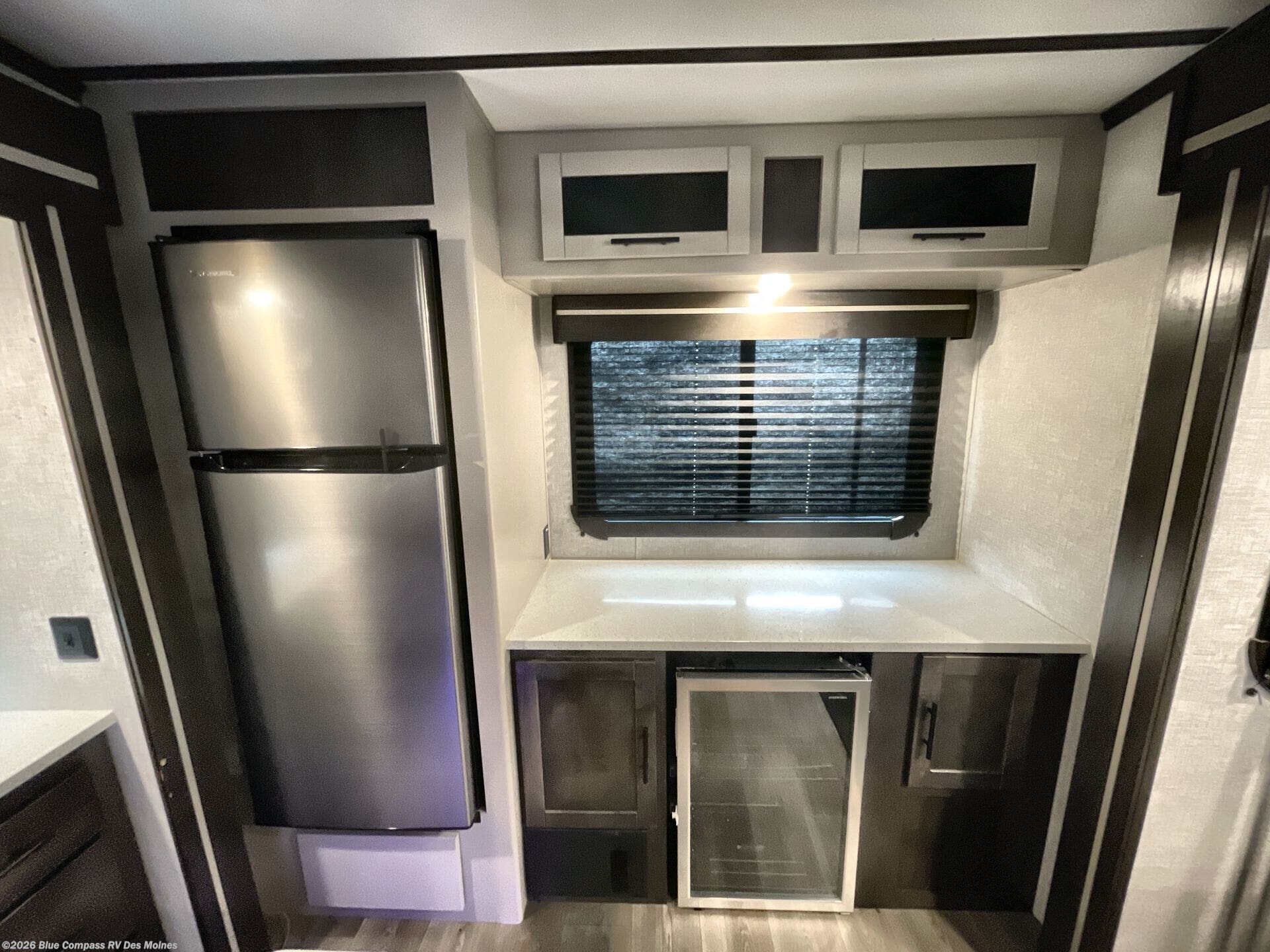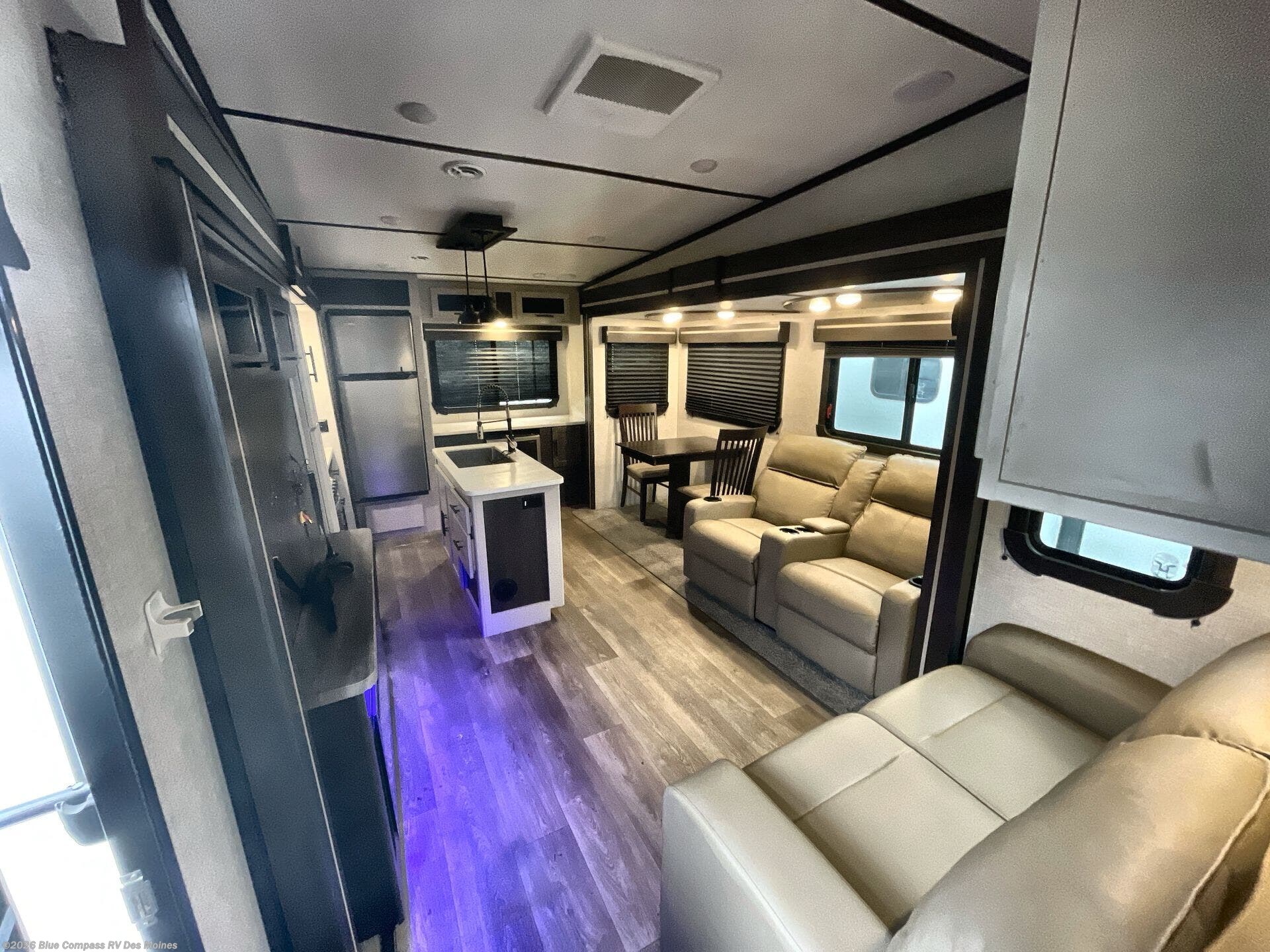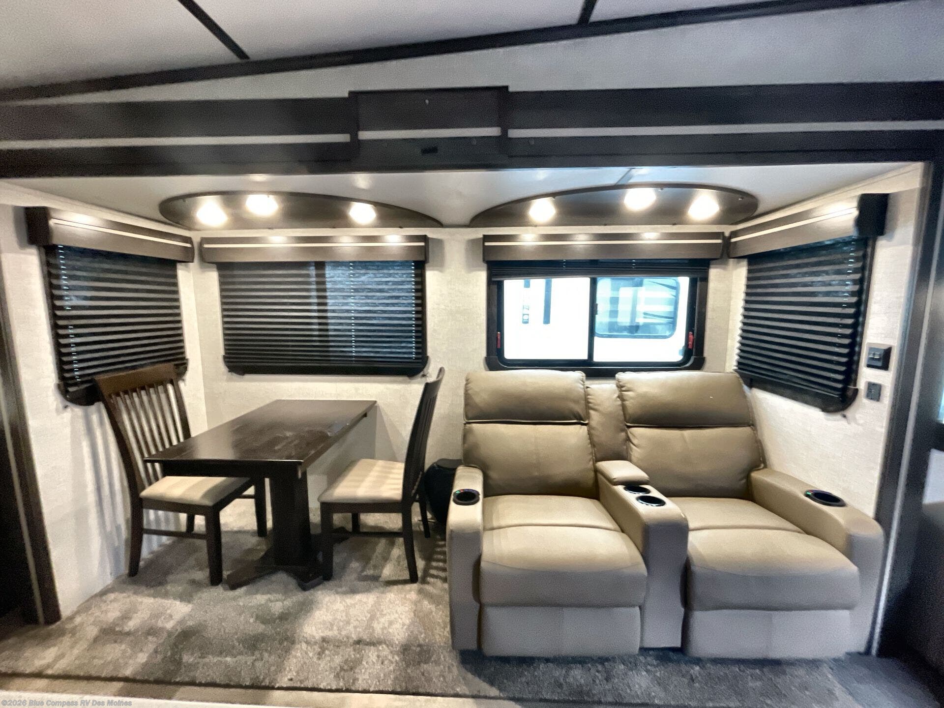 This fifth wheel features at-home comforts for relaxing vacations. The theater seats are directly across from the entertainment center and fireplace for a cozy evening indoors, and the dual opposing slides here create an open floor plan. The chef of the family will love cooking in the rear kitchen that includes plenty of counter space, a kitchen island, plus a pantry for dry goods and snacks. This model also includes an outdoor kitchen to grill the catch-of-the-day on, and the power awning with LED lights will be the perfect place to relax under. The dual entry bath will create a front master bedroom you are sure to love. Here, the queen bed will provide a great night's rest, and you'll find extra storage space within the slide out!