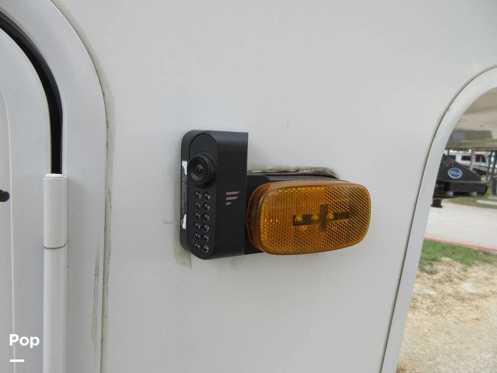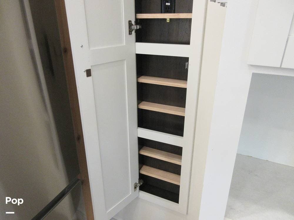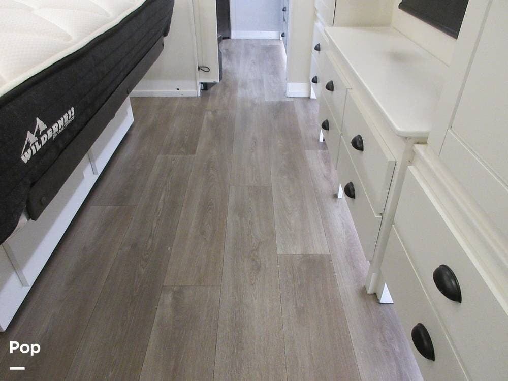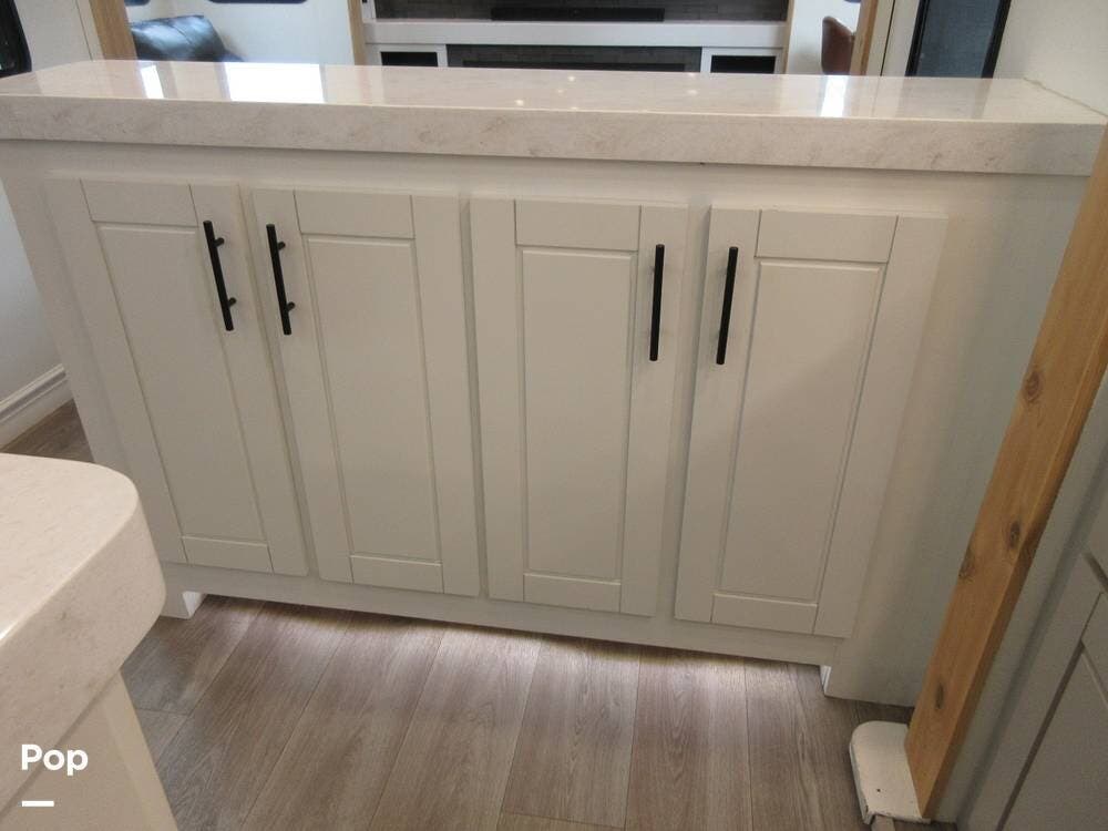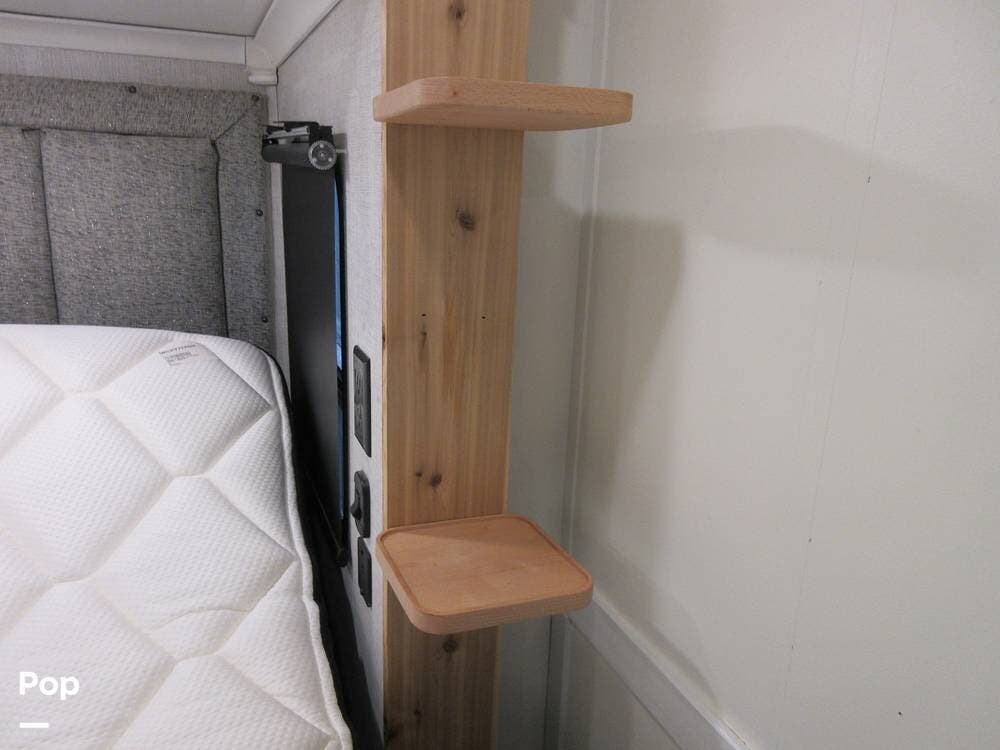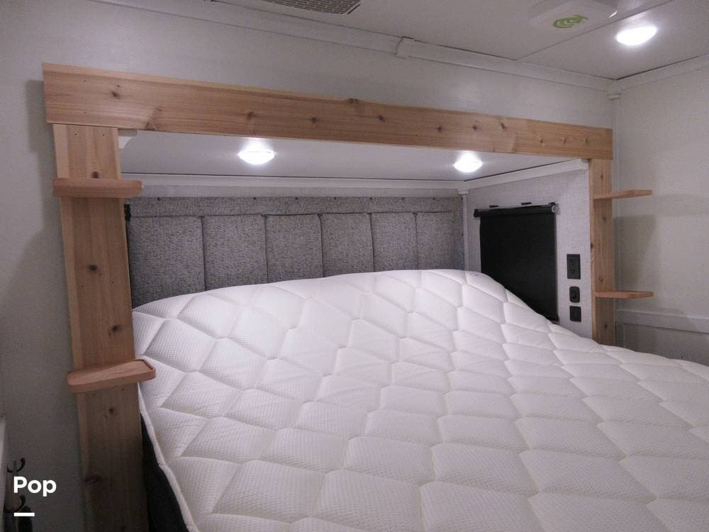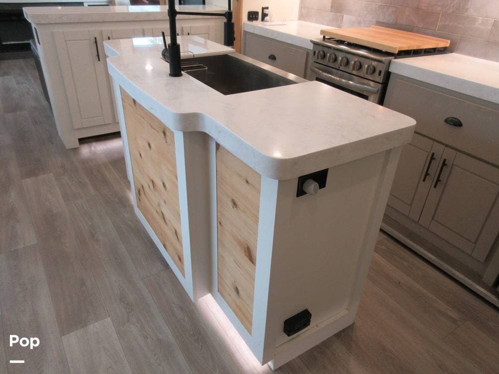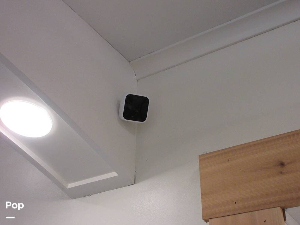 This Redwood has improvements that set it apart from other models. The interior was painted white, and the slide-out, island, and door trim pieces were replaced with natural cedar wood. Blink Security Cameras were installed in several locations to monitor the RV when no one is home. The kitchen had a larger microwave, soft-close drawer hardware, and motion-sensor inner cabinet lights. The bathroom faucets were upgraded and the toilet was outfitted with a bidet. In the bedroom, a soundbar with a subwoofer, a custom leather wall hanger for remote controls, and small trim shelves were added.