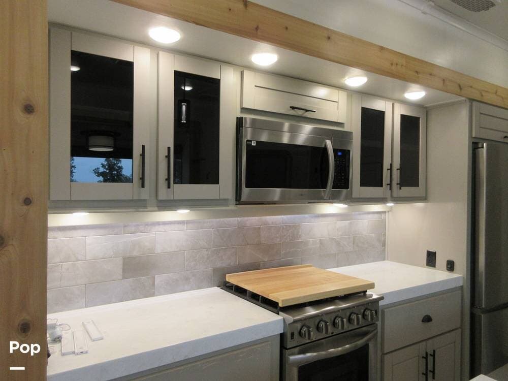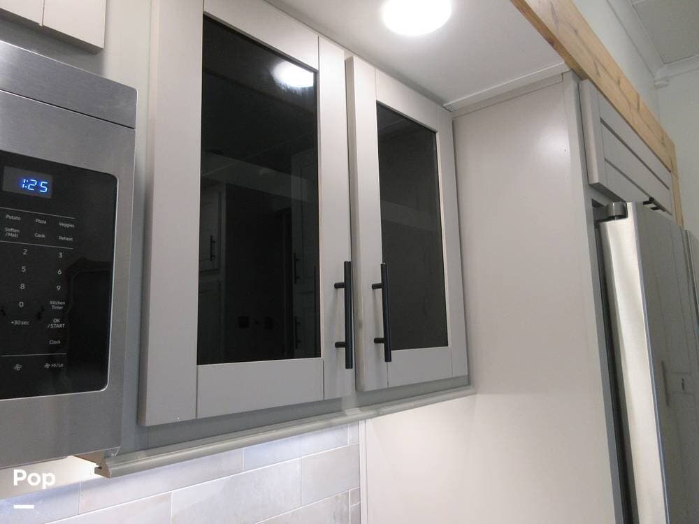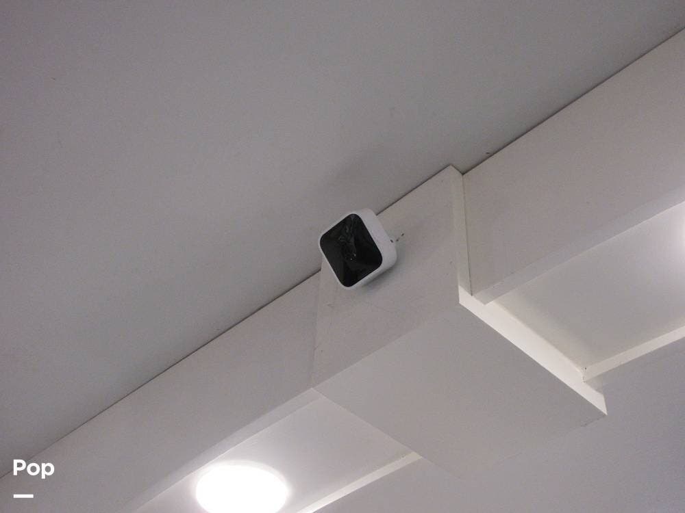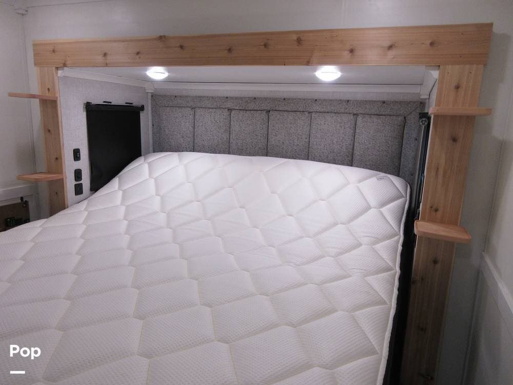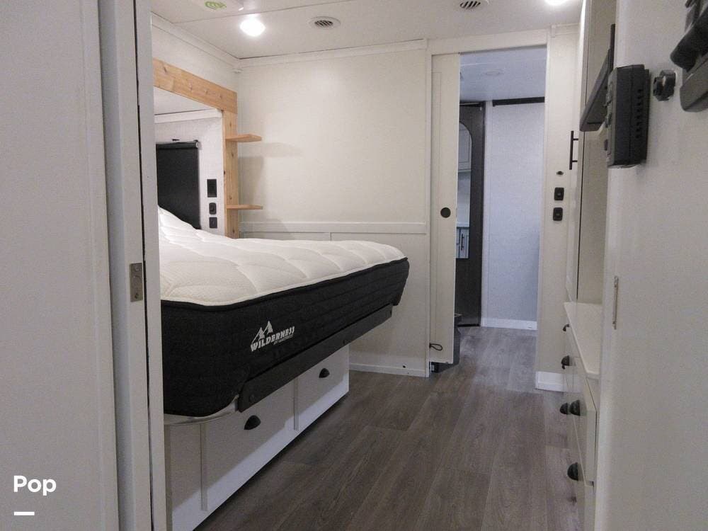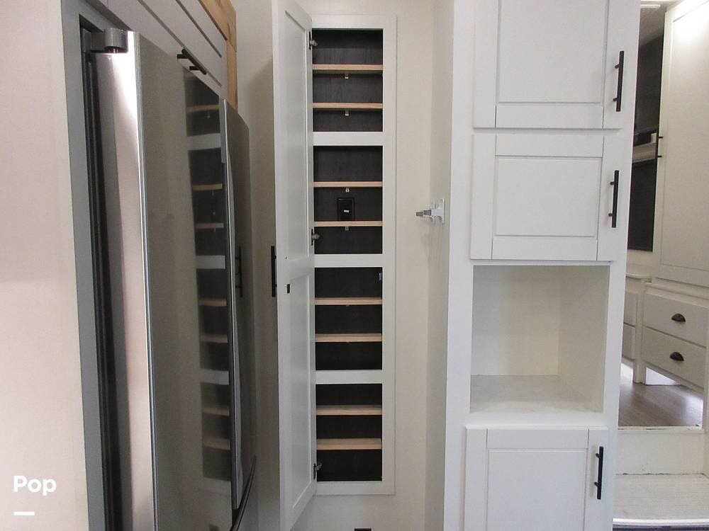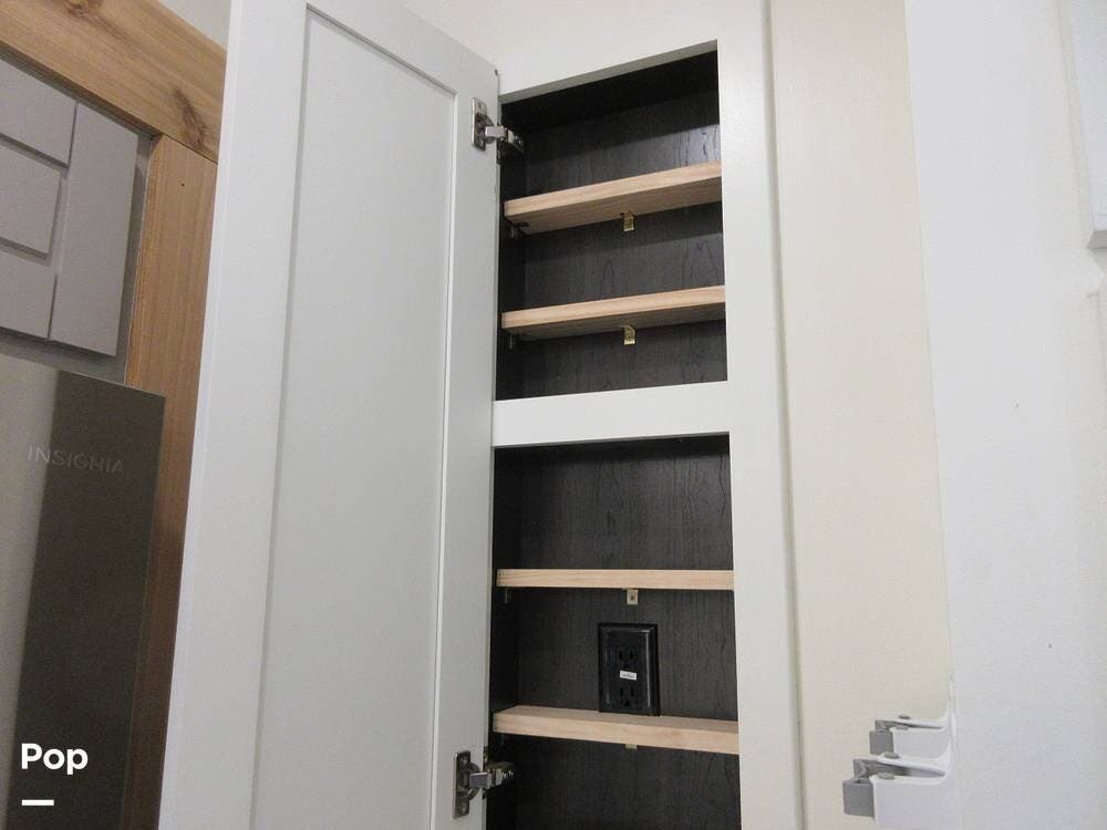 This Redwood has improvements that set it apart from other models. The interior was painted white, and the slide-out, island, and door trim pieces were replaced with natural cedar wood. Blink Security Cameras were installed in several locations to monitor the RV when no one is home. The kitchen had a larger microwave, soft-close drawer hardware, and motion-sensor inner cabinet lights. The bathroom faucets were upgraded and the toilet was outfitted with a bidet. In the bedroom, a soundbar with a subwoofer, a custom leather wall hanger for remote controls, and small trim shelves were added.