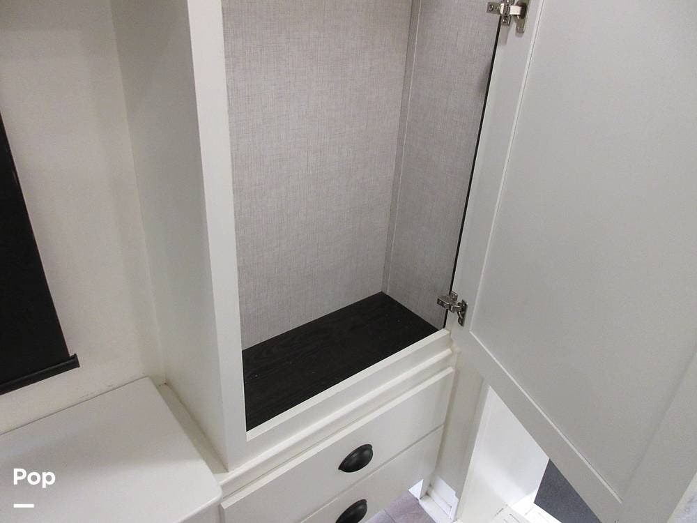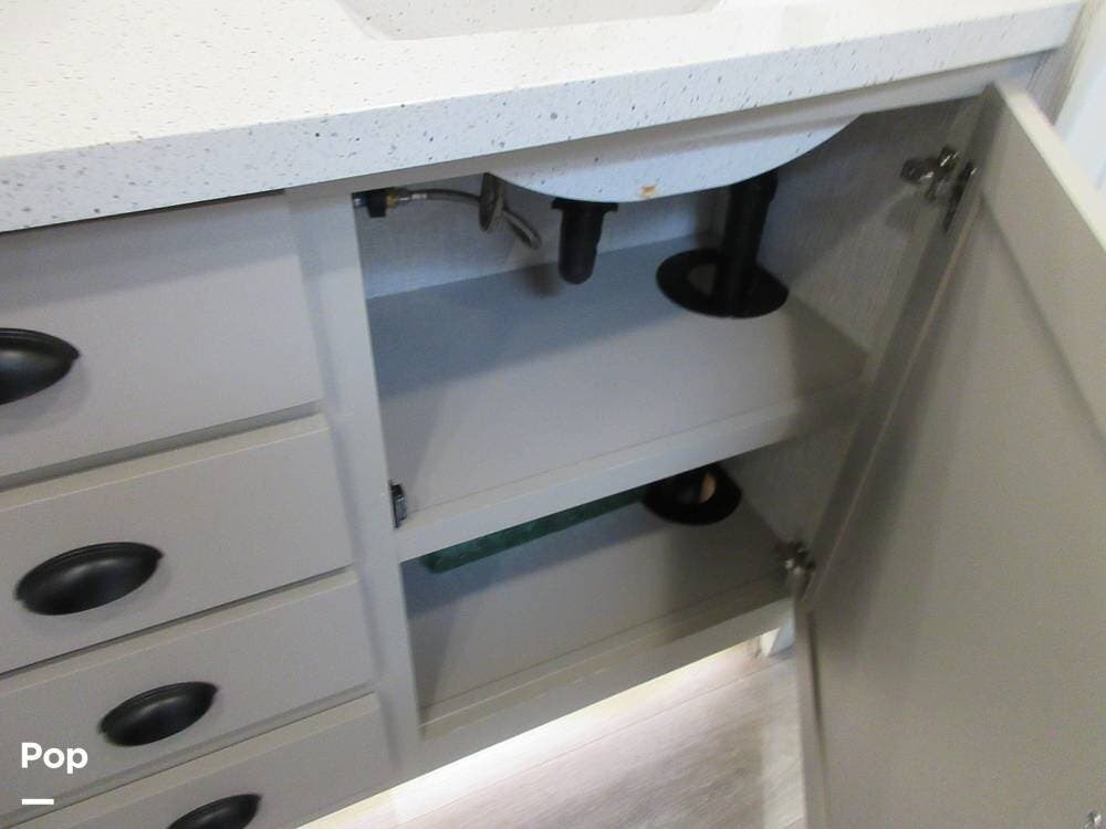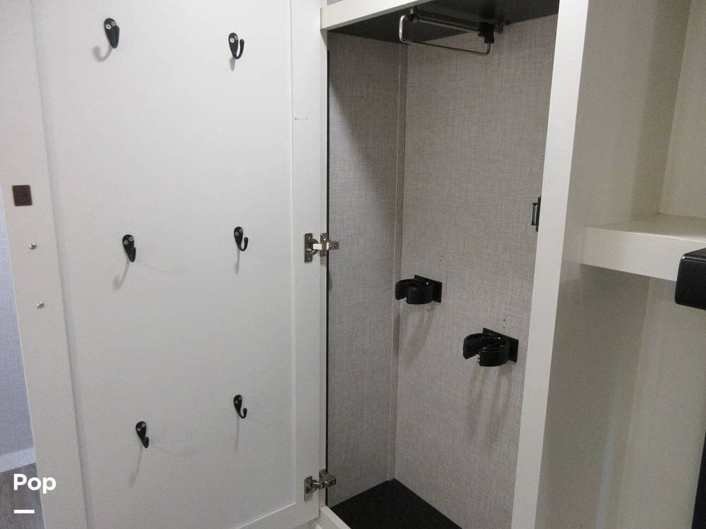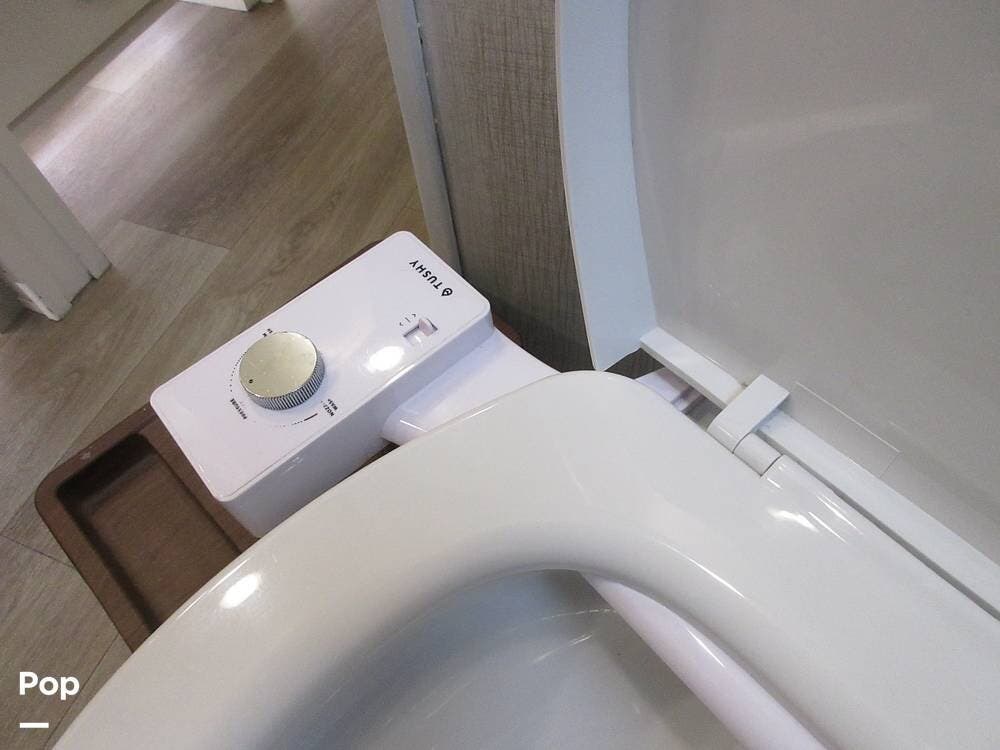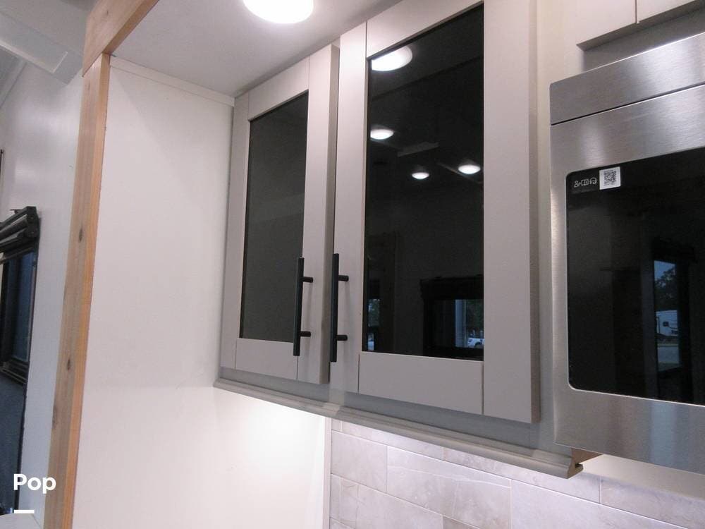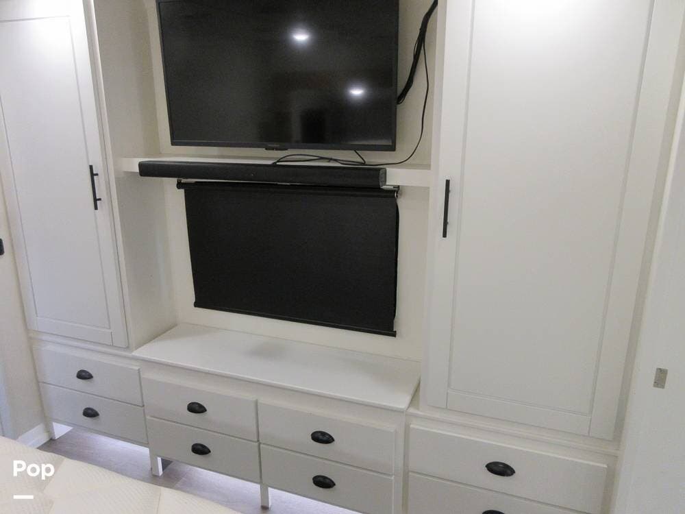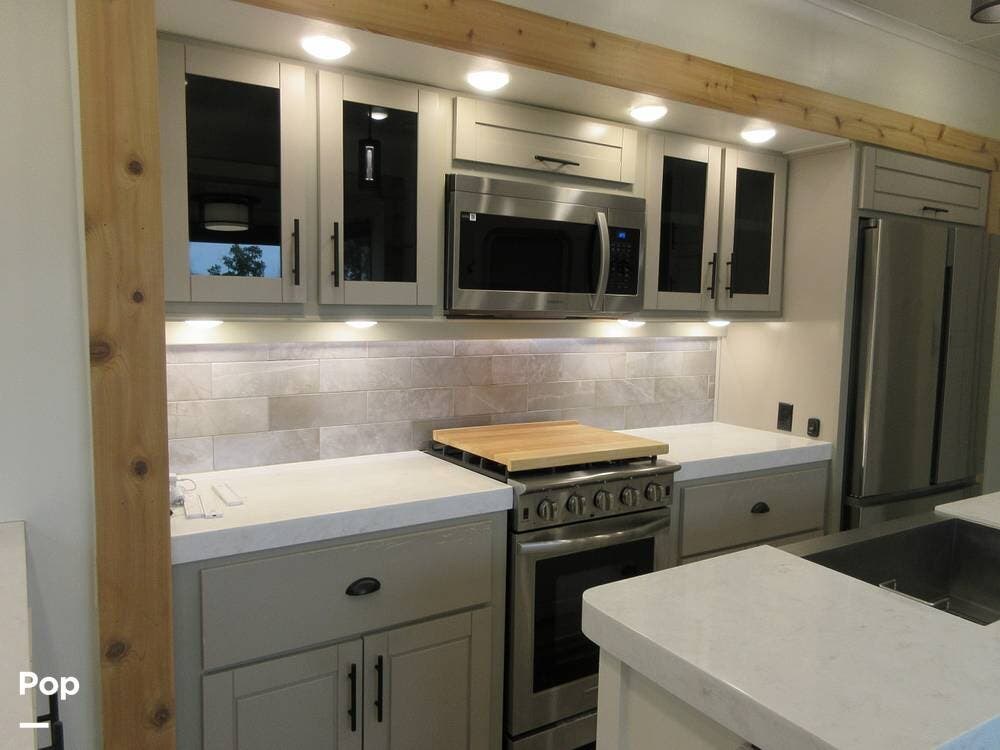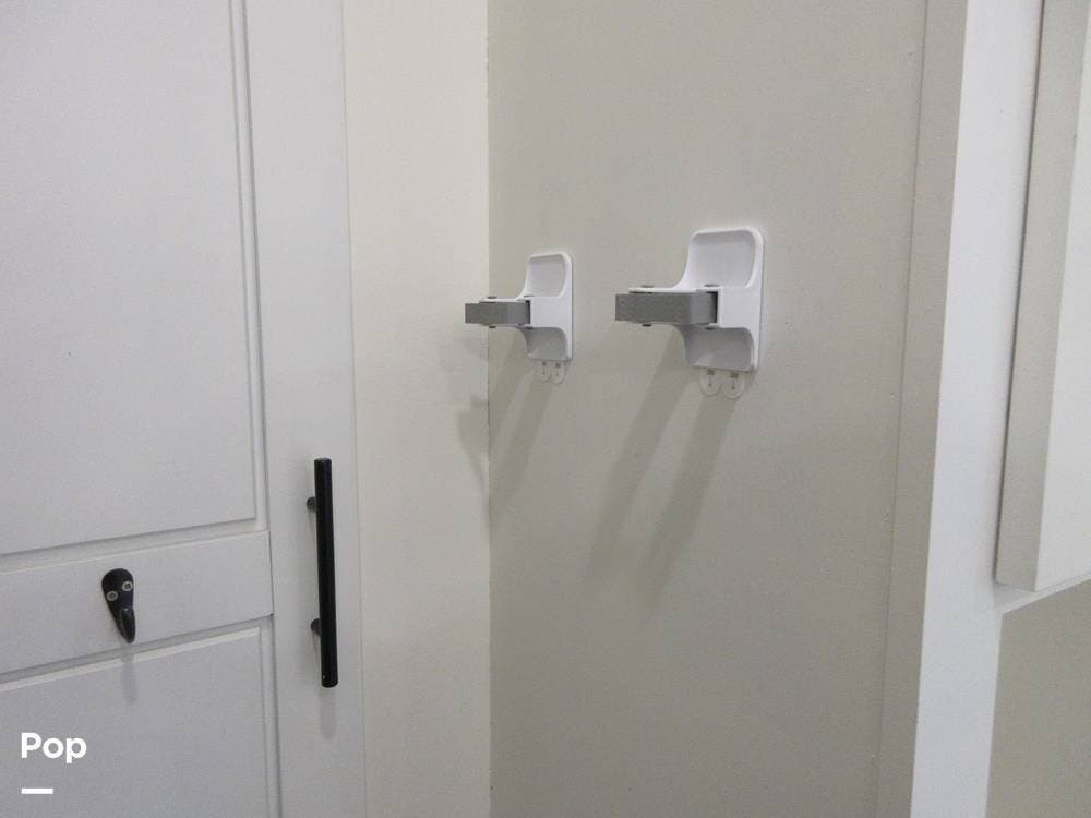 This Redwood has improvements that set it apart from other models. The interior was painted white, and the slide-out, island, and door trim pieces were replaced with natural cedar wood. Blink Security Cameras were installed in several locations to monitor the RV when no one is home. The kitchen had a larger microwave, soft-close drawer hardware, and motion-sensor inner cabinet lights. The bathroom faucets were upgraded and the toilet was outfitted with a bidet. In the bedroom, a soundbar with a subwoofer, a custom leather wall hanger for remote controls, and small trim shelves were added.