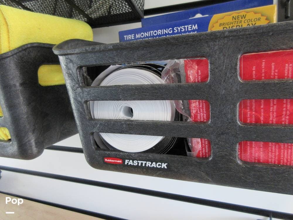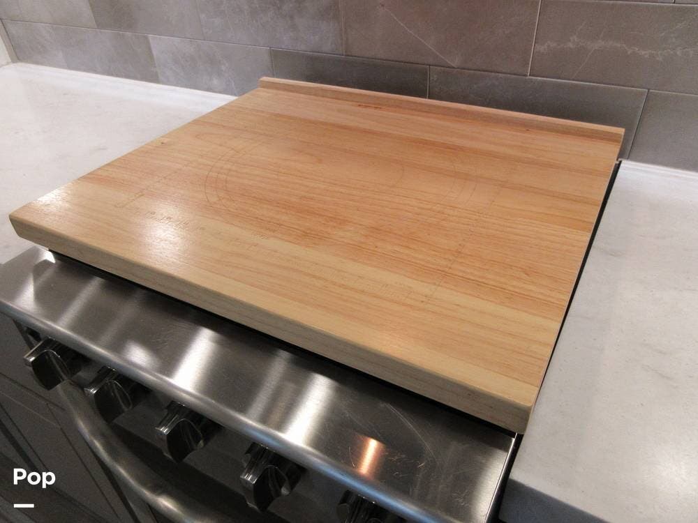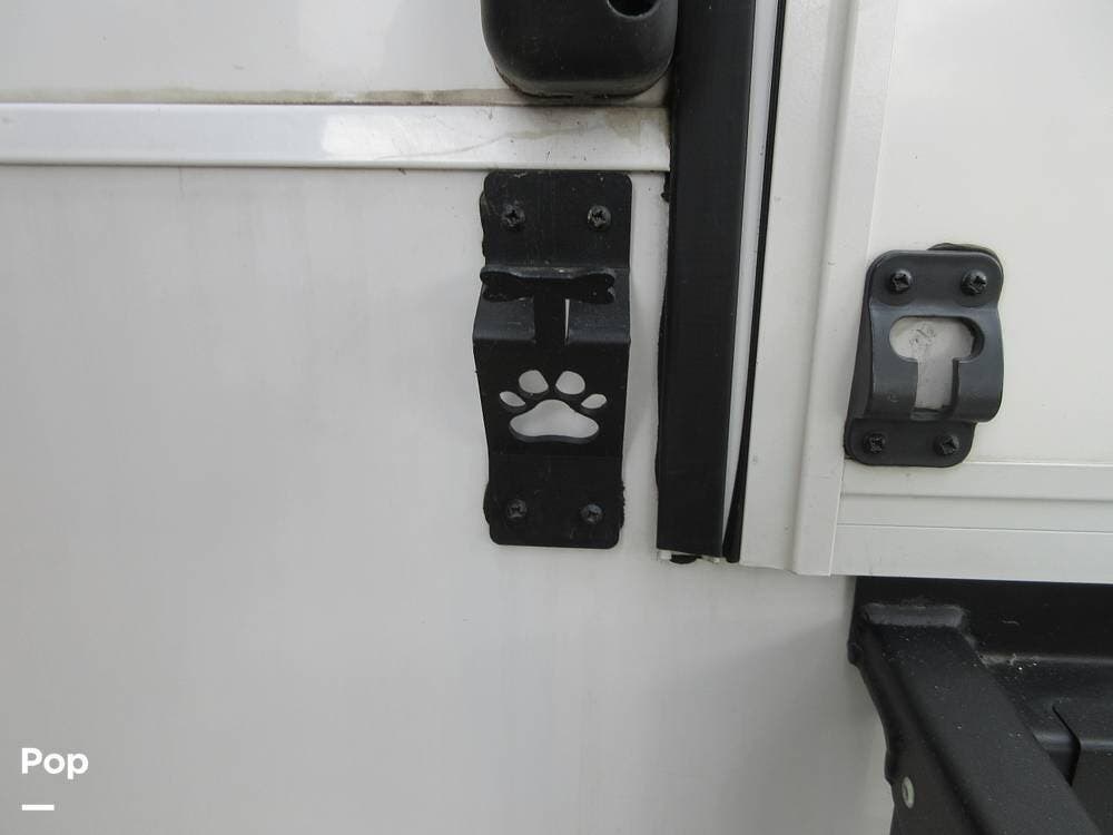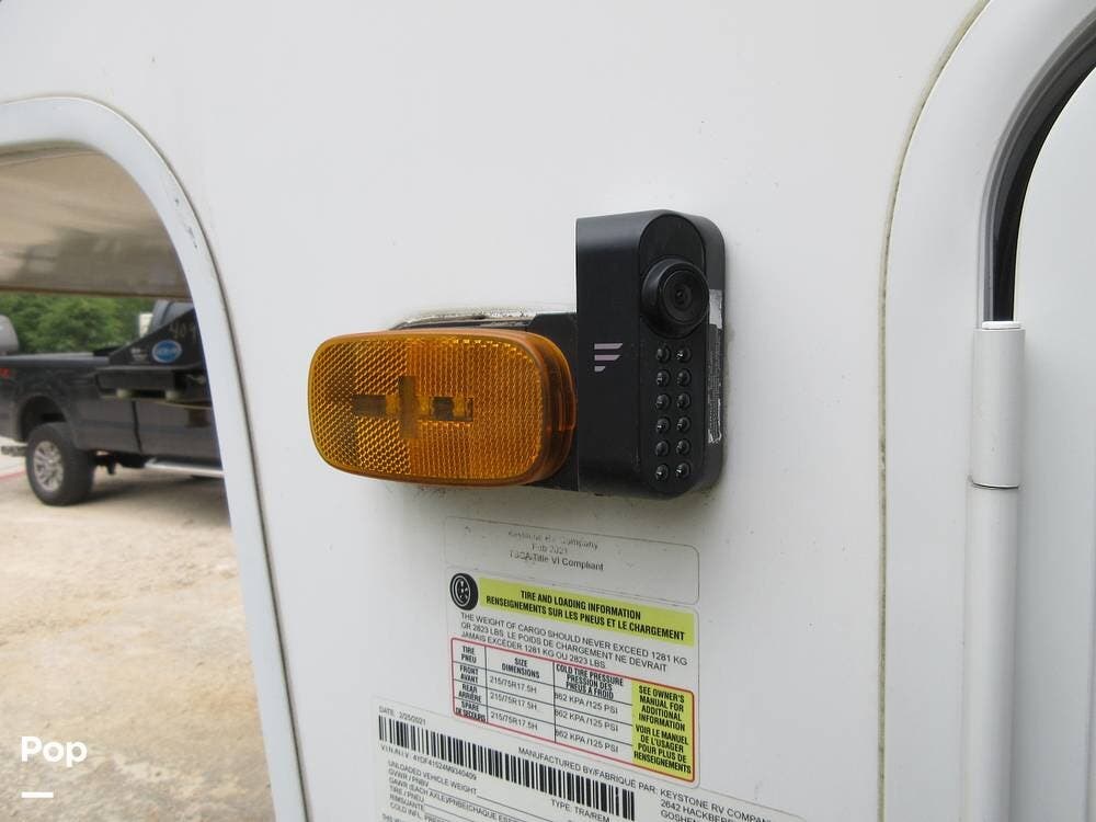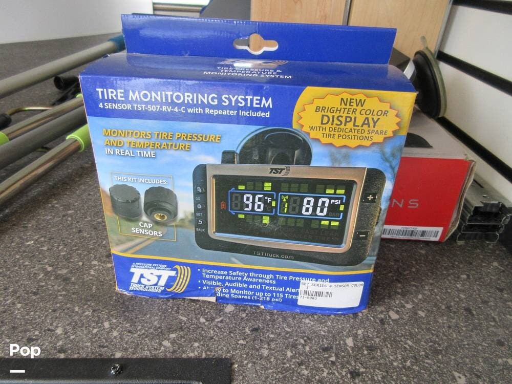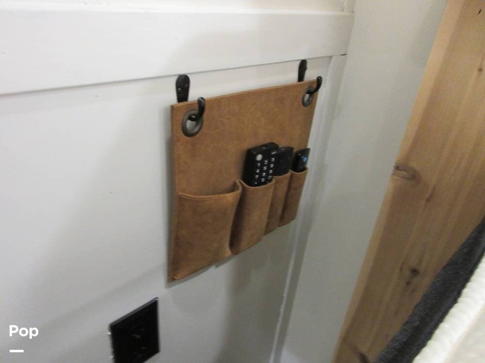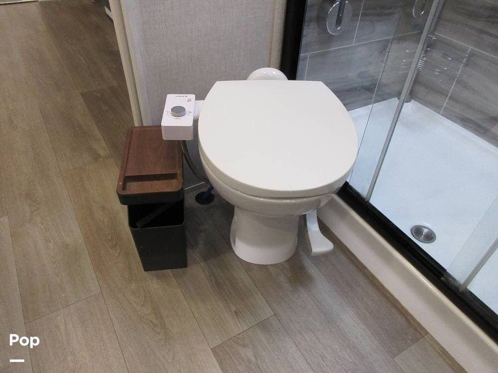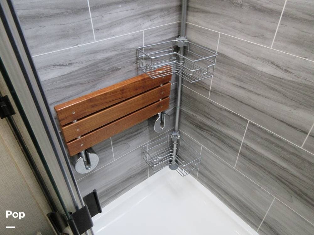 This Redwood has improvements that set it apart from other models. The interior was painted white, and the slide-out, island, and door trim pieces were replaced with natural cedar wood. Blink Security Cameras were installed in several locations to monitor the RV when no one is home. The kitchen had a larger microwave, soft-close drawer hardware, and motion-sensor inner cabinet lights. The bathroom faucets were upgraded and the toilet was outfitted with a bidet. In the bedroom, a soundbar with a subwoofer, a custom leather wall hanger for remote controls, and small trim shelves were added.