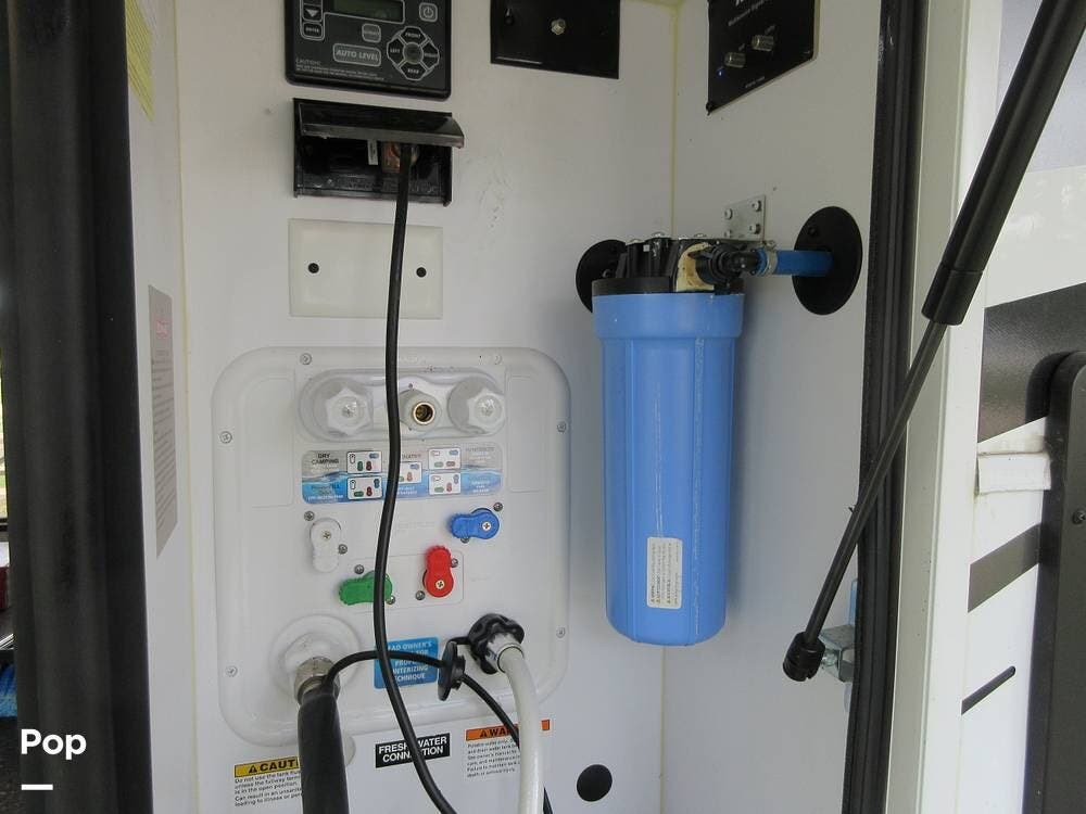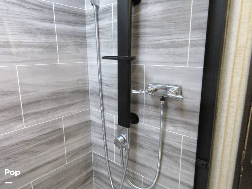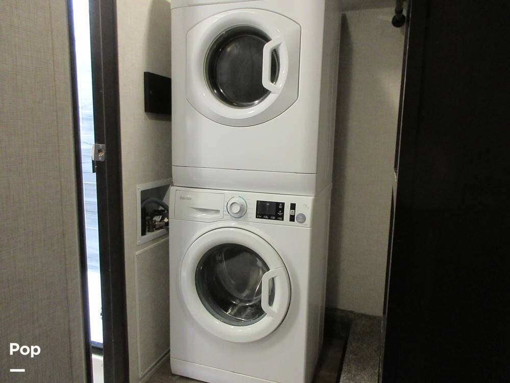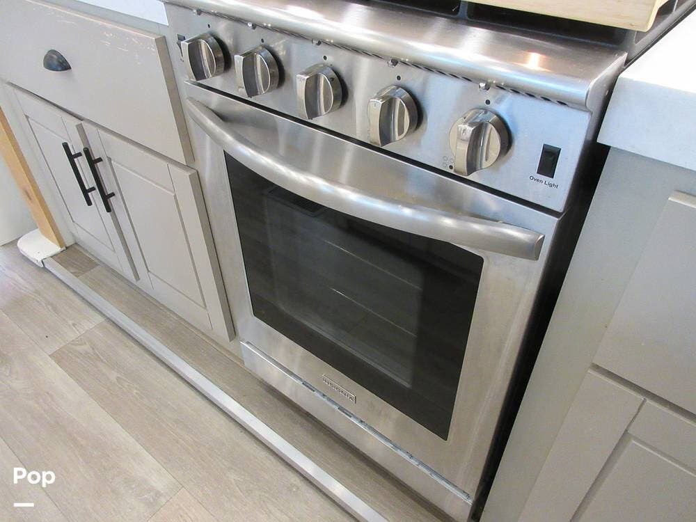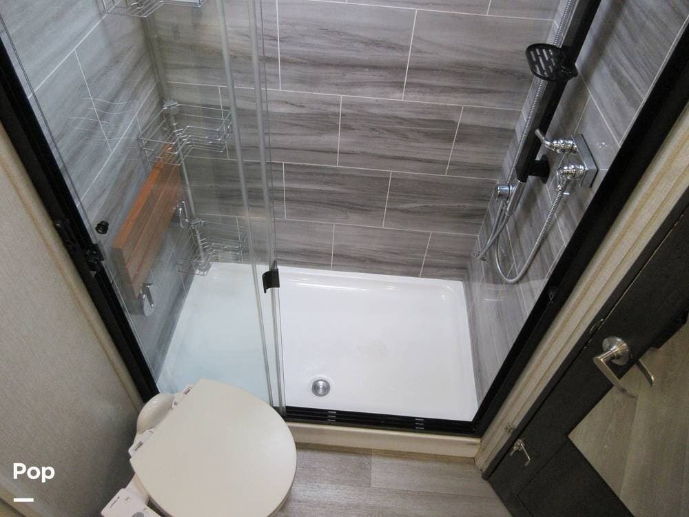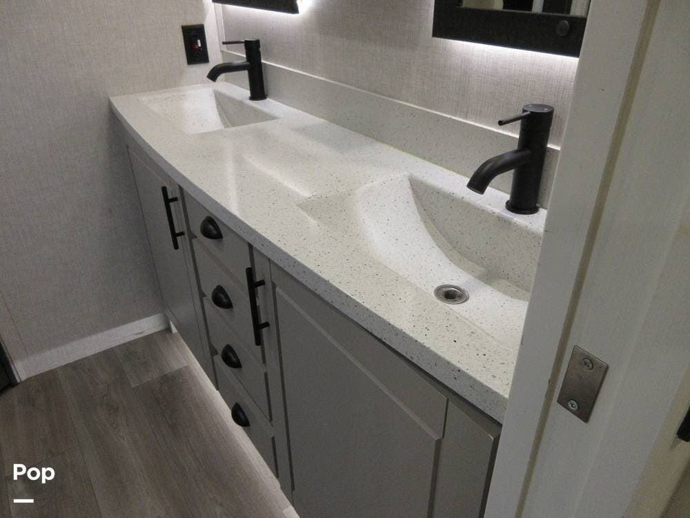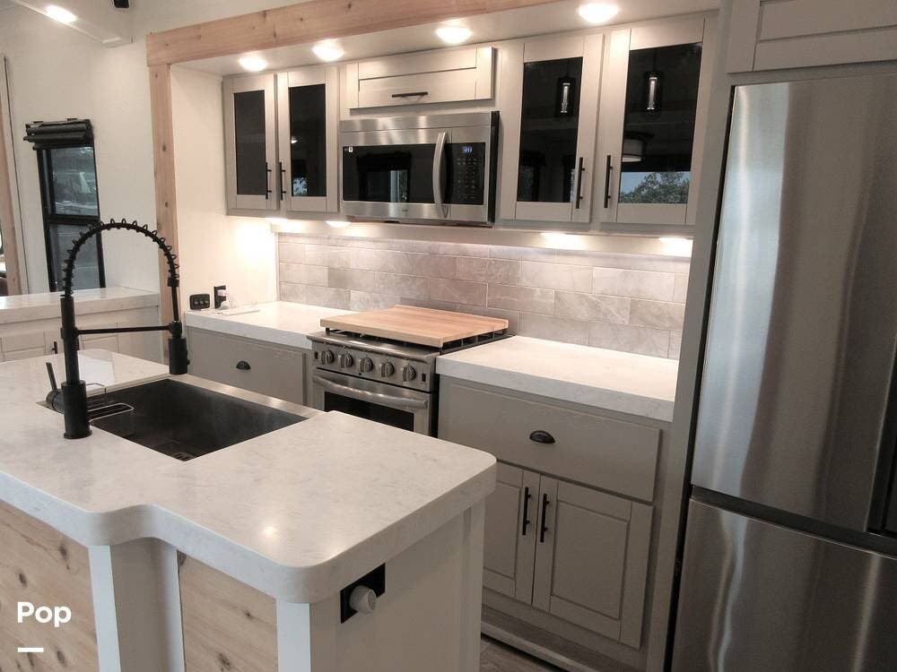 This Redwood model has hydraulic leveling, side and backup cameras, and will perform well in any RV park with 50 amp service. If you wander off the grid, this RV has you covered with a 62-gallon fresh water tank, an 82-gallon gray tank, a 44-gallon waste tank, and two 30-lb propane tanks. This RV also has a Zamp solar connection if you want to add a panel later.