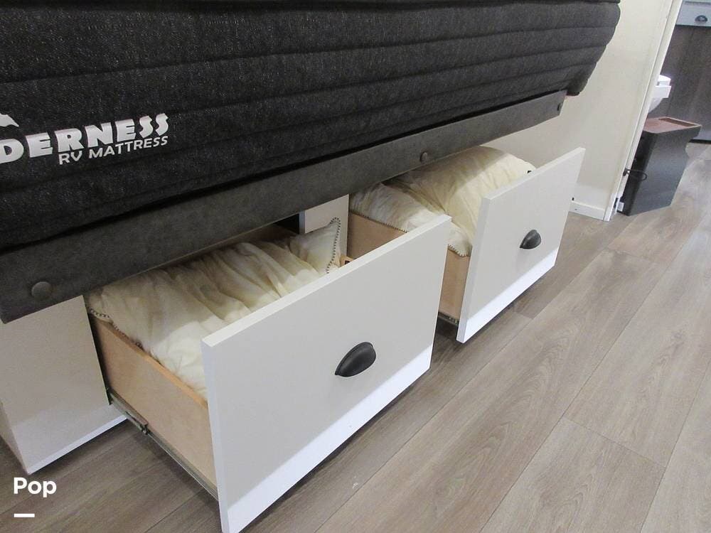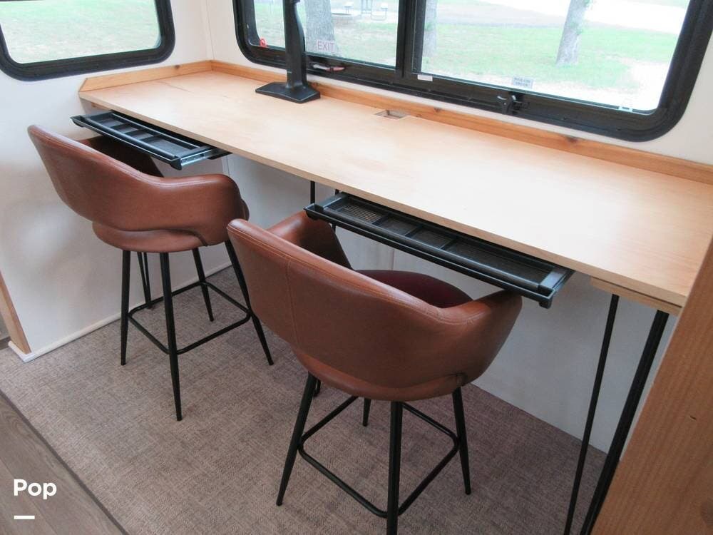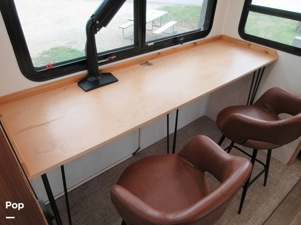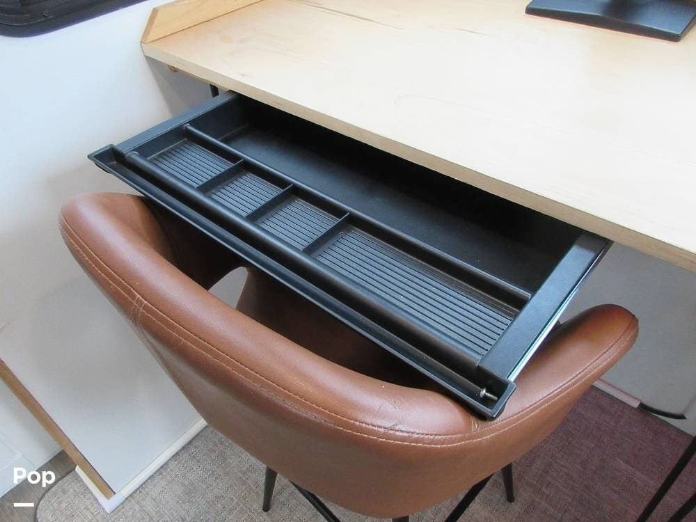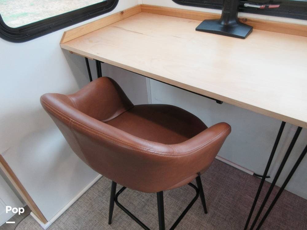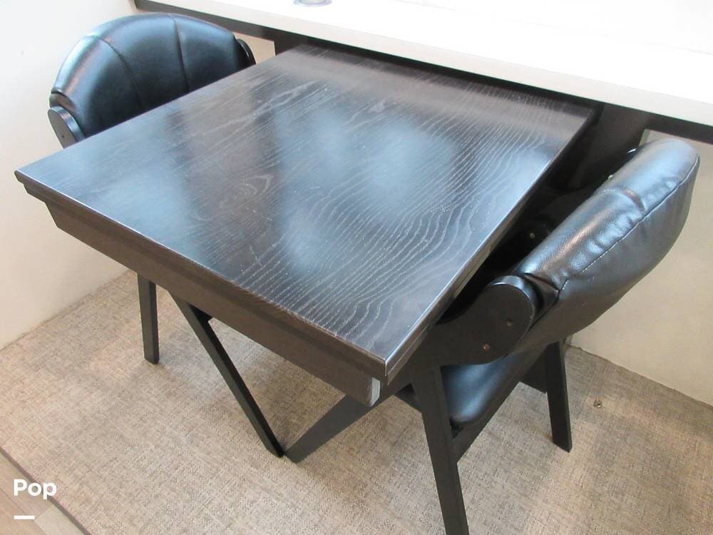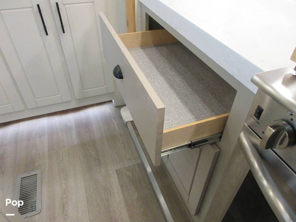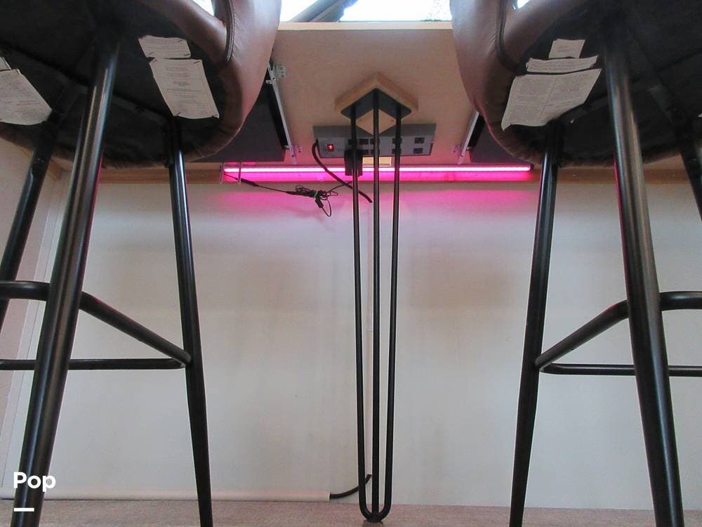 Do you work from home? This Redwood has a custom desk with two chairs in the living area. Install your favorite screen onto the articulating monitor arm, and plug it into the hidden power strip underneath the tabletop. Attached to the desk are two sliding drawers and a multiple-color lighting system.