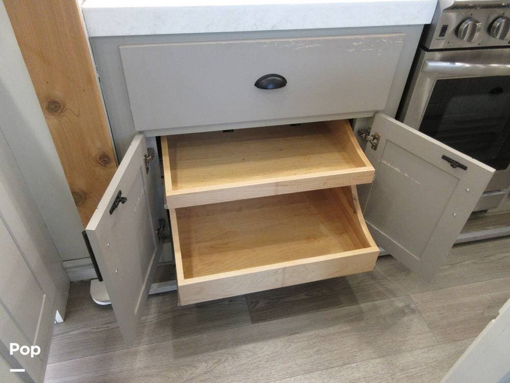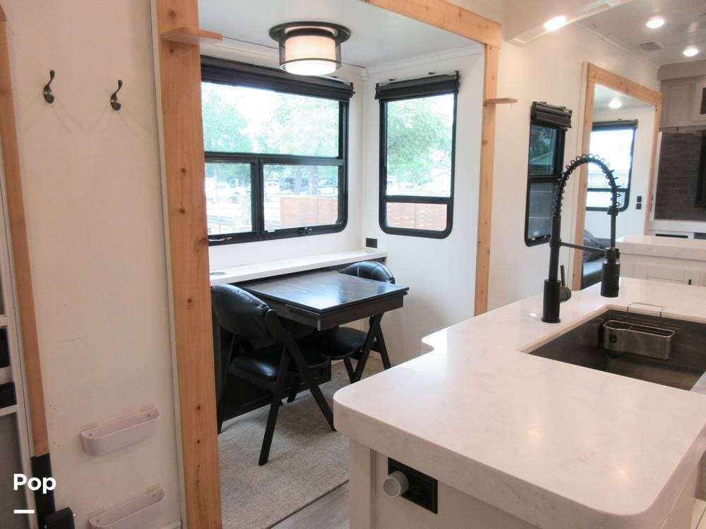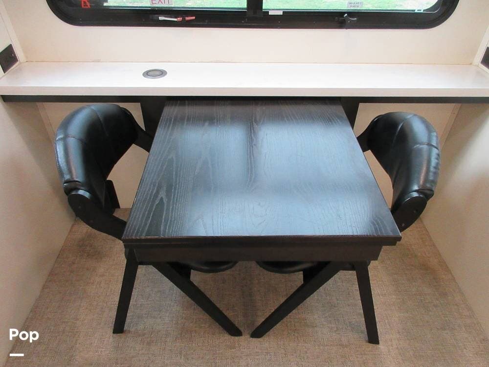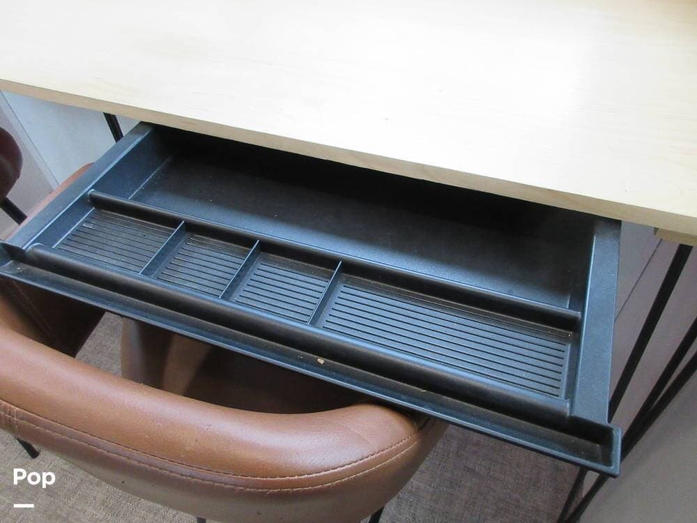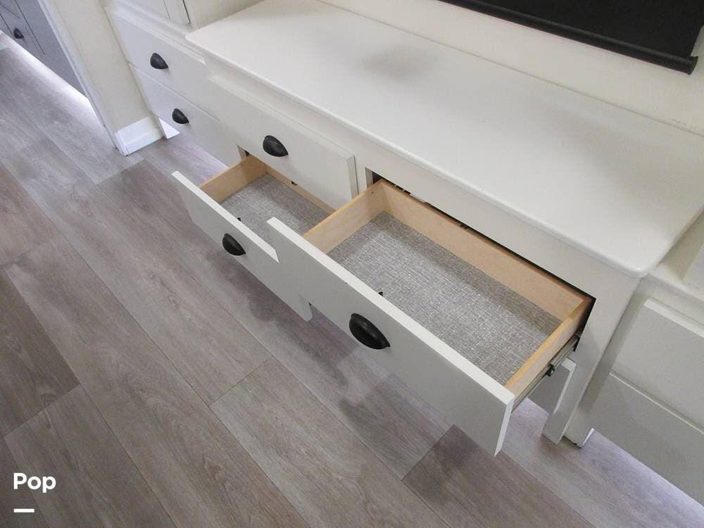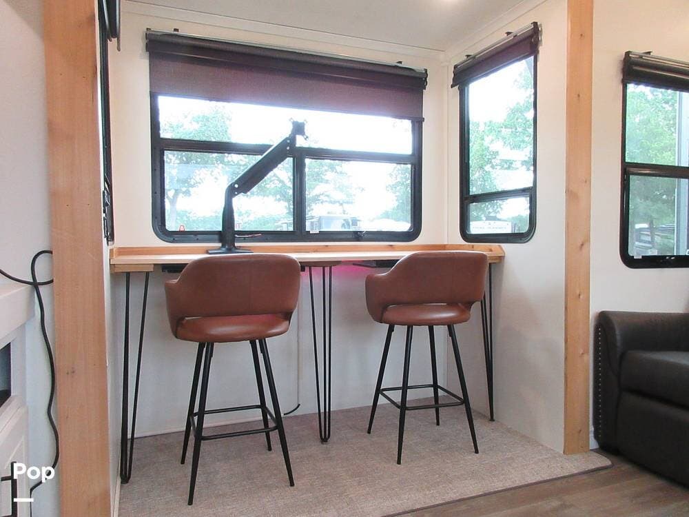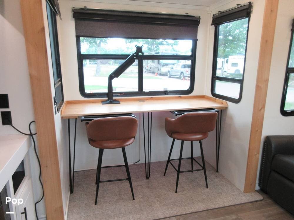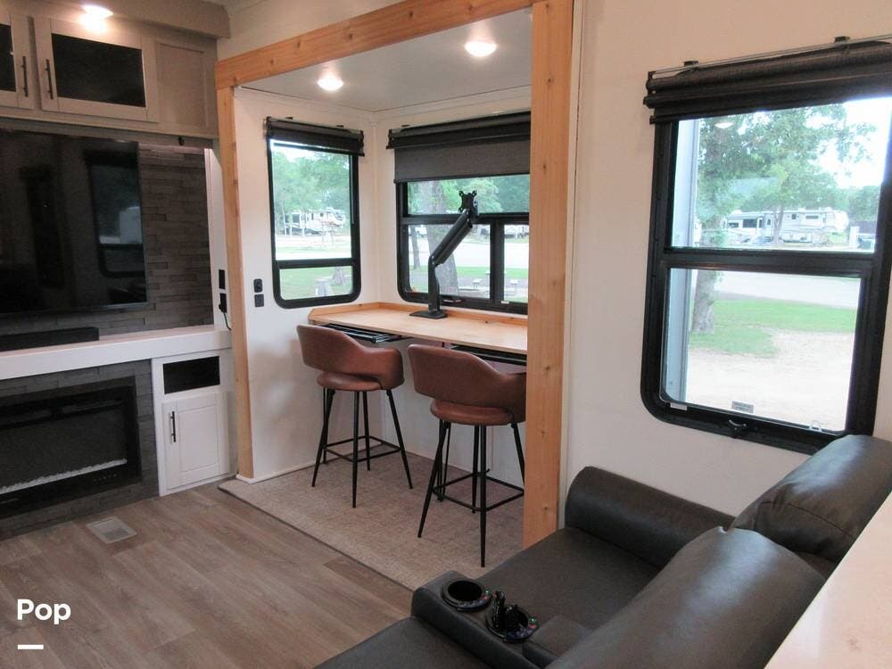 Do you work from home? This Redwood has a custom desk with two chairs in the living area. Install your favorite screen onto the articulating monitor arm, and plug it into the hidden power strip underneath the tabletop. Attached to the desk are two sliding drawers and a multiple-color lighting system.