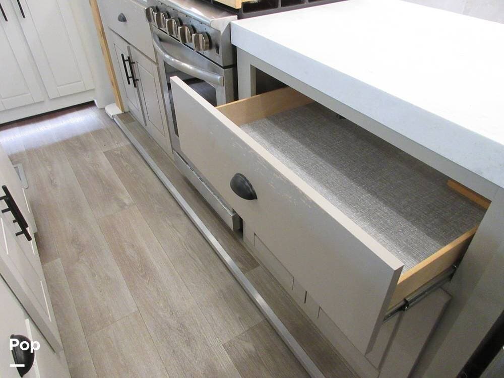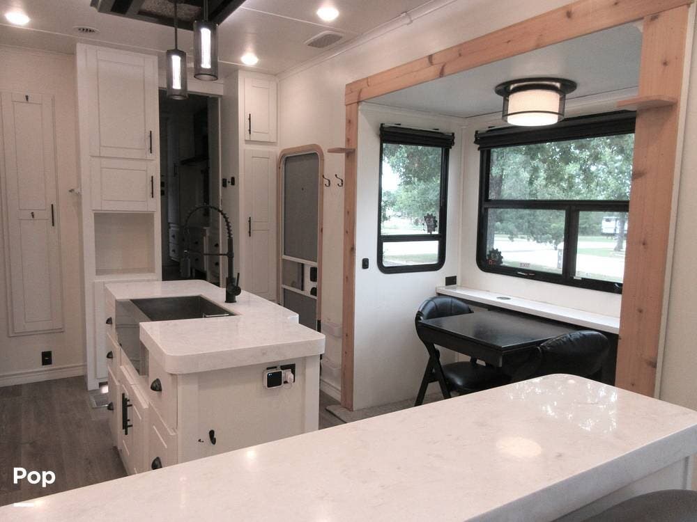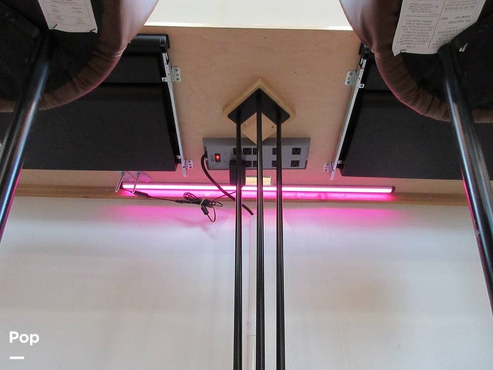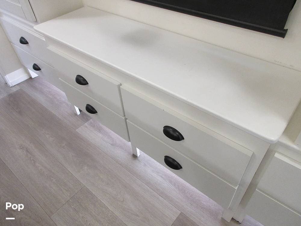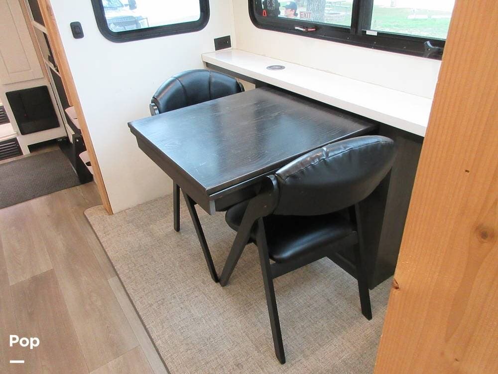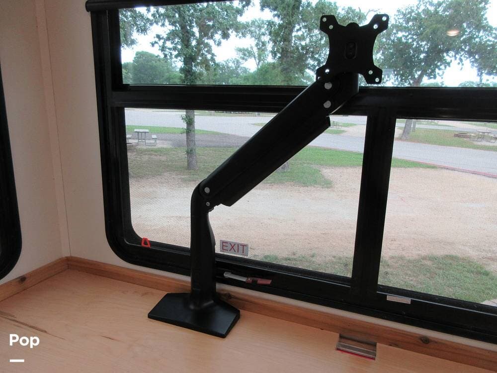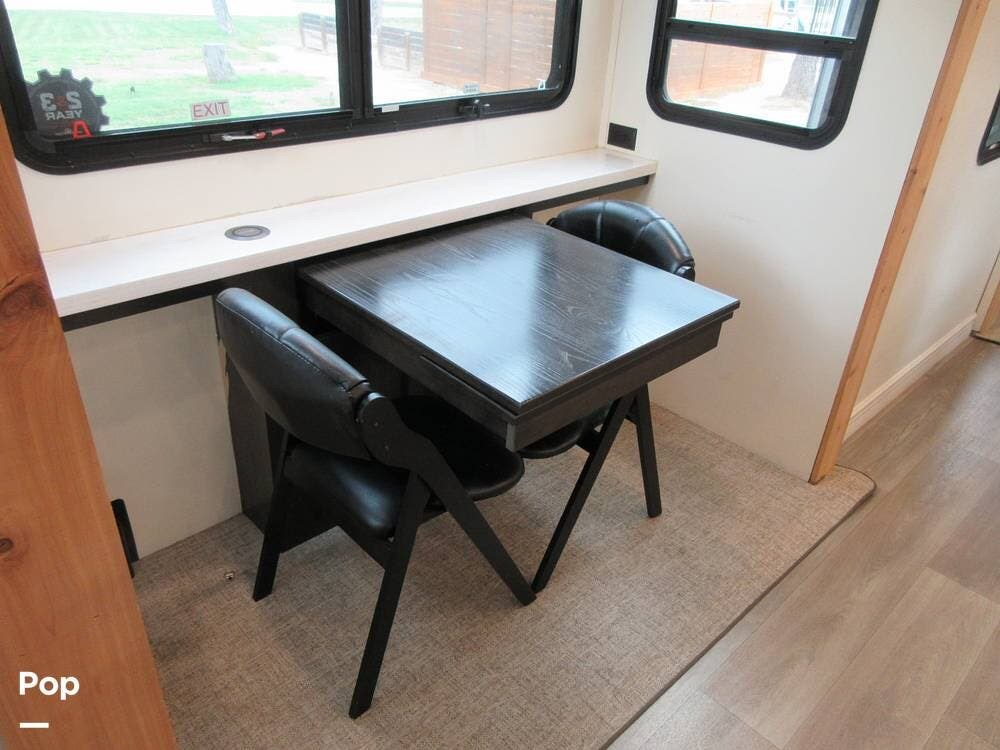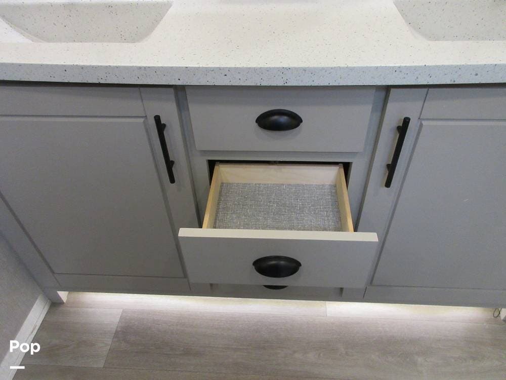 Do you work from home? This Redwood has a custom desk with two chairs in the living area. Install your favorite screen onto the articulating monitor arm, and plug it into the hidden power strip underneath the tabletop. Attached to the desk are two sliding drawers and a multiple-color lighting system.