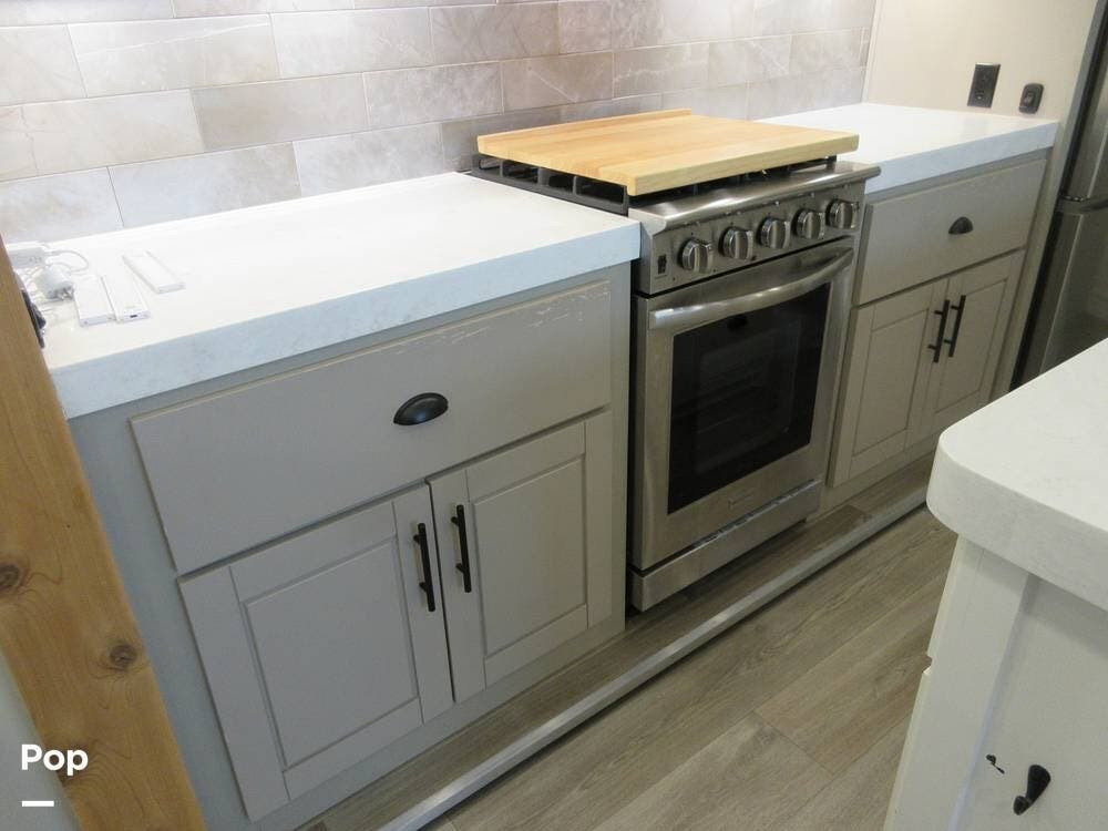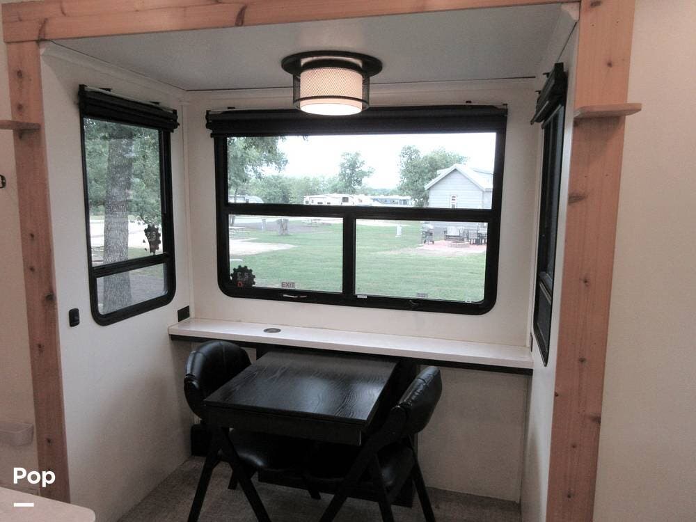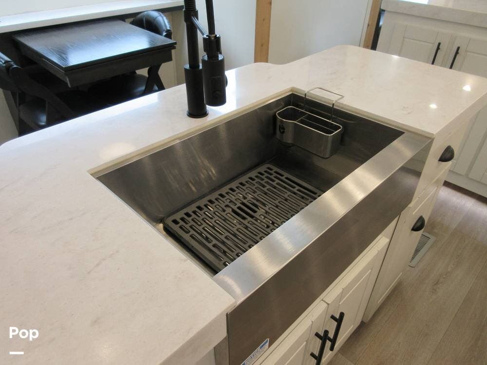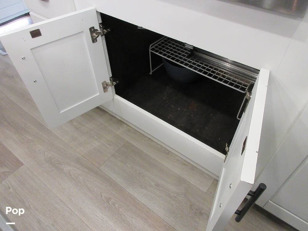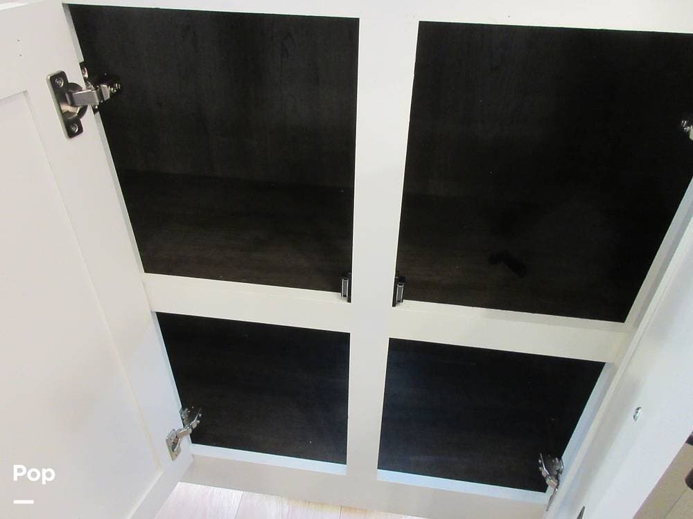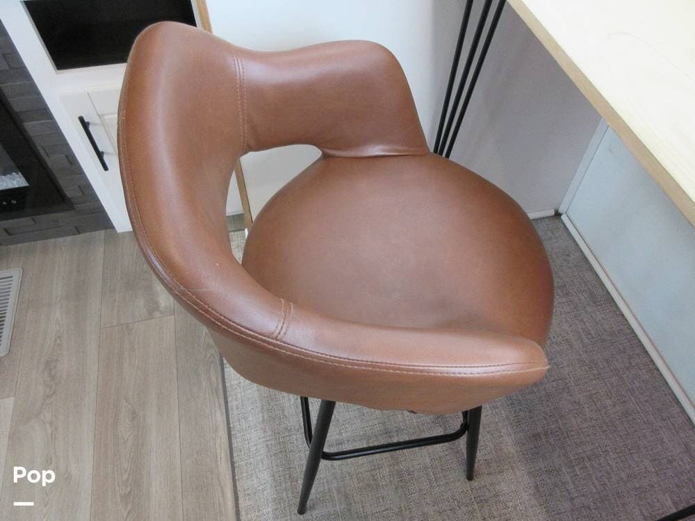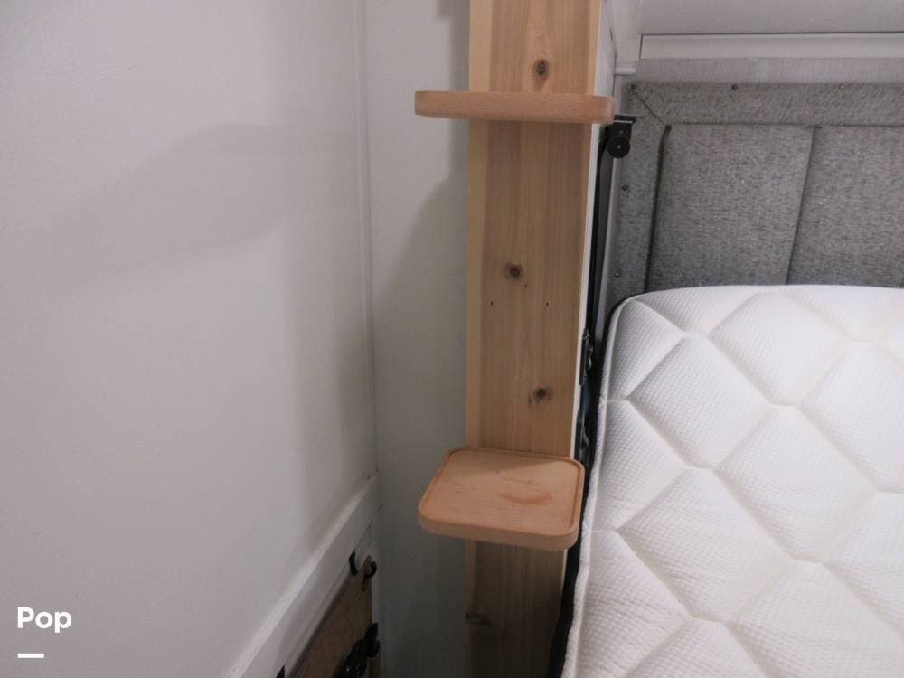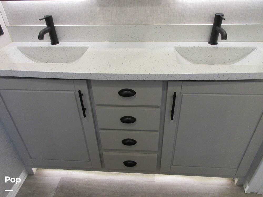 Do you work from home? This Redwood has a custom desk with two chairs in the living area. Install your favorite screen onto the articulating monitor arm, and plug it into the hidden power strip underneath the tabletop. Attached to the desk are two sliding drawers and a multiple-color lighting system.
