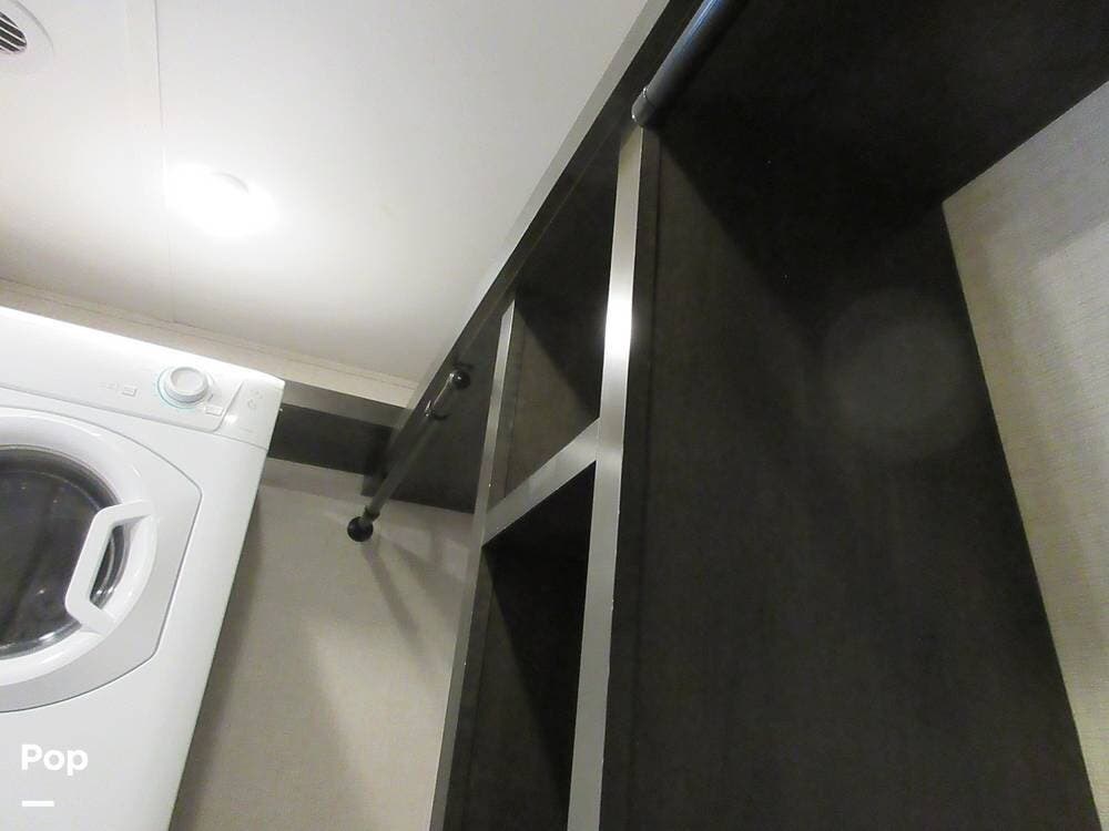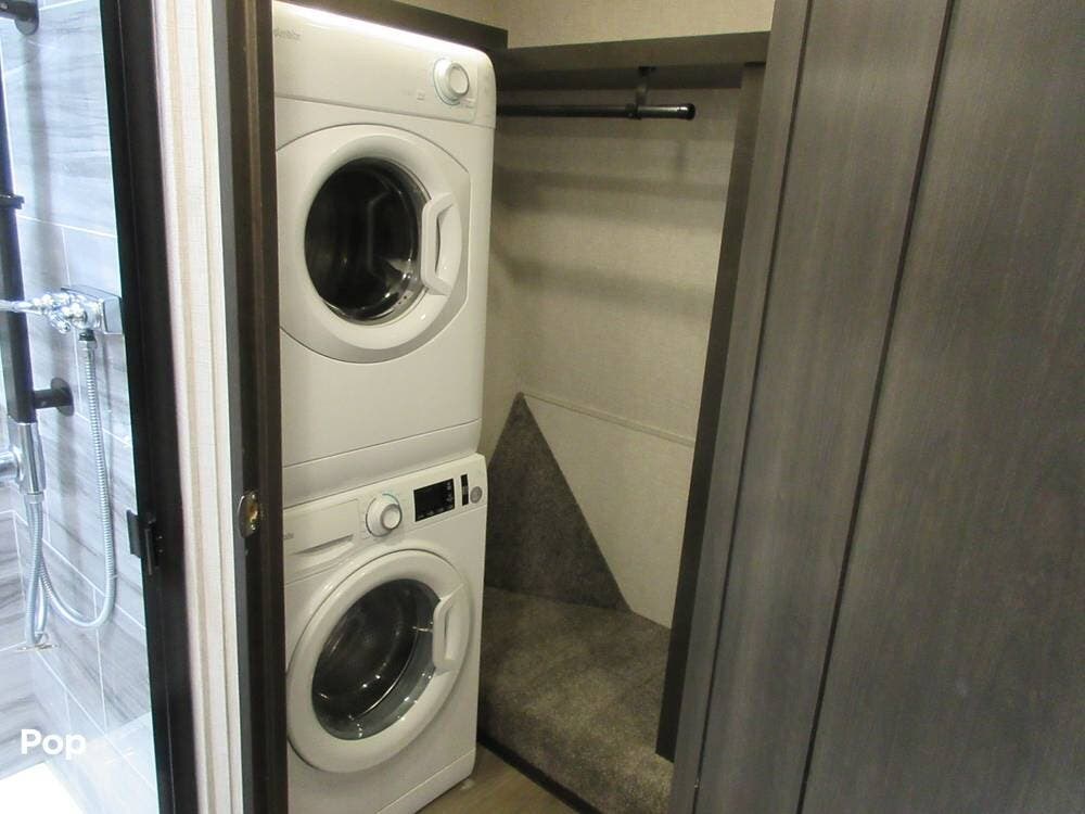 And when it's time to pick up your wardrobe in the morning, the stackable washer and dryer in the rear closet will clean and prepare your belongings.