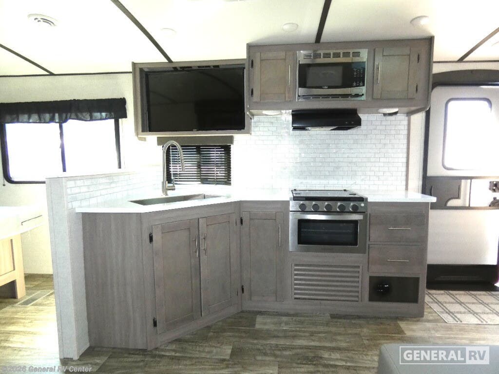 Nothing says luxury like a king bed in the front bedroom, plus a slide out for added interior space. Your crew can relax on the tri-fold sofa and chaise lounge before heading off to find a trail or two. There is a convenient shoe storage and pet station for your furry friends, and the dual wardrobes can store all your clothes for the week. Freshen up in the full bath that includes a shower skylight, then head to the kitchen to prepare a meal on the glass top range or use the handy stainless steel microwave. This model also includes a pantry just as you enter the unit, plus plenty of overhead compartments for all your belongings! The lightweight Sunset Trail travel trailers by CrossRoads RV include EZ lube axles, laminated sidewalls, secure stance entry steps, plus an exterior convenience center to make each camping trip enjoyable. The gas oven, stainless steel microwave, and refrigerator allow you to cook and store food during your trip to the lake, and the stainless steel farmhouse sink will make clean-up a breeze. These models feature solid wood drawer construction and LED lights for an open and bright living space.
