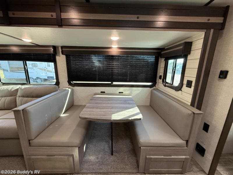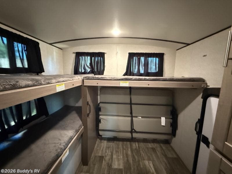 Everyone will have a great time camping in this travel trailer! From the rear private bunkhouse with a 60" fold-up sofa below a 28" x 64" flip-up bunk, a set of 28" x 74" bunk beds, and a wardrobe to the outside kitchen which even has a refrigerator to keep your beverage cold while you cook. There is a front private bedroom with a king bed that has wardrobes on either side and an overhead cabinet above it to store your items. The kids can even bring a friend or two along to sleep on the 80" x 42" XL booth dinette and the tri-fold sofa. The full bathroom has a 30" x 36" shower and a linen closet so everyone can stay squeaky clean!