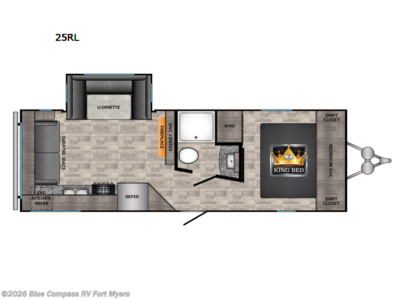 You will feel right at home in this travel trailer that can comfortably sleep four people each night. Once you arrive at your destination, set up the power awning and grab a cold drink from the outside refrigerator. You can then stretch your legs on a trail or two and easily clean up in the full bath when you return. The theater seats sit directly across from the entertainment center and fireplace for easy viewing, and the chef of your group will have all the appliances needed to create a home-cooked meal. You'll love the front private bedroom that includes a king bed, dual shirt closets, plus overhead space to store your things!