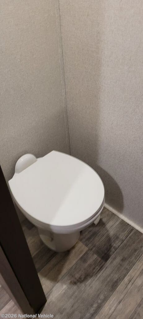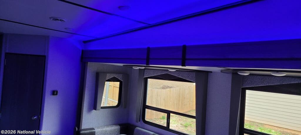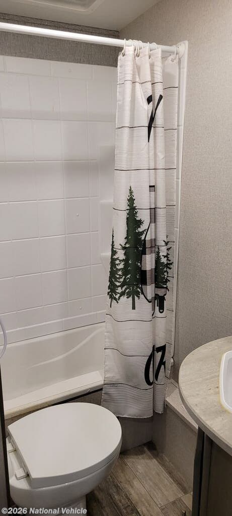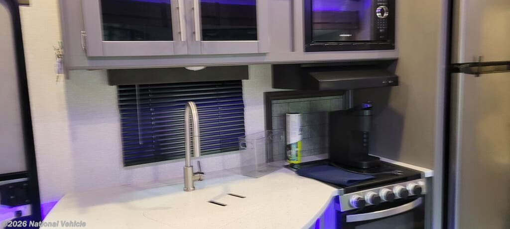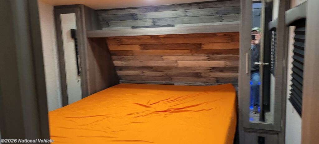 One of the highlights of this model is the rear double-over-double bunkhouse, providing excellent sleeping space for kids, guests, or extra storage when needed. At the front of the coach, the private master suite features a walk-around queen bed, overhead cabinetry, and wardrobe storage for extended stays. The spacious bathroom includes a large shower, vanity, and additional storage for everyday essentials.