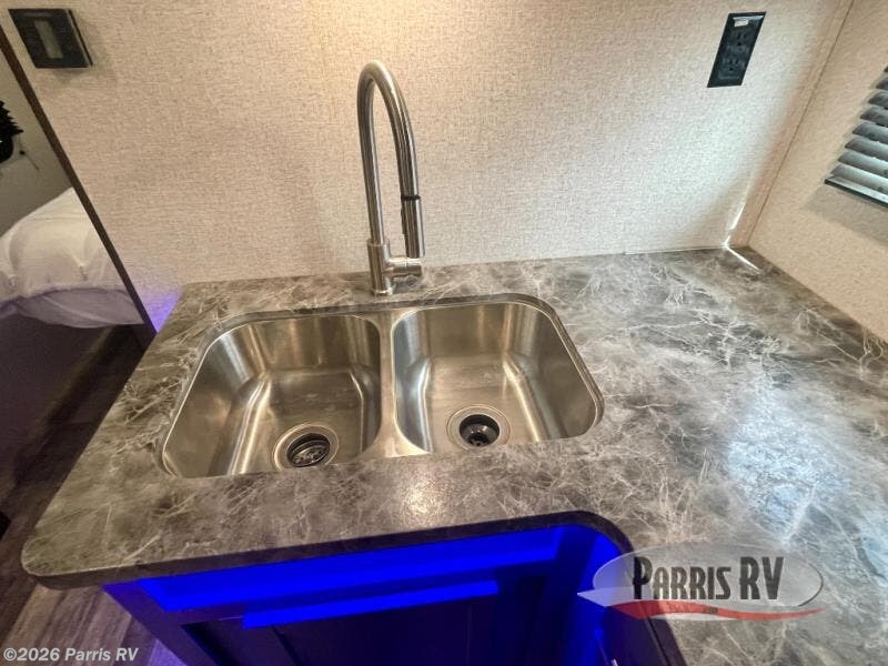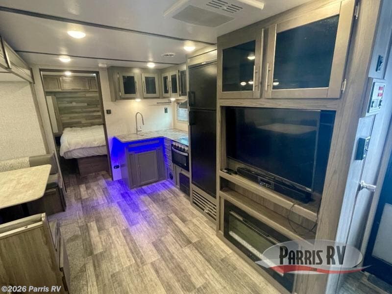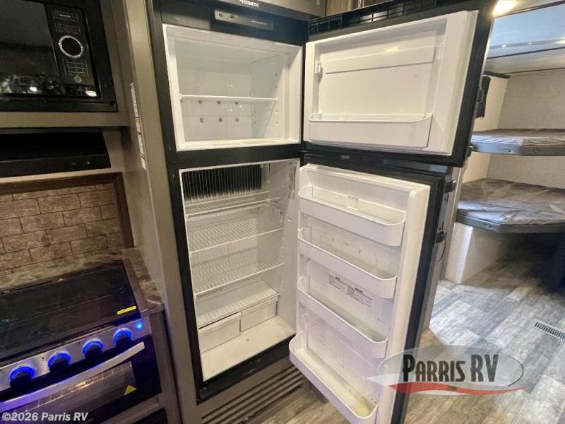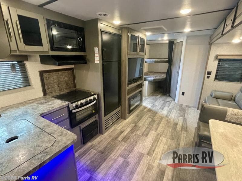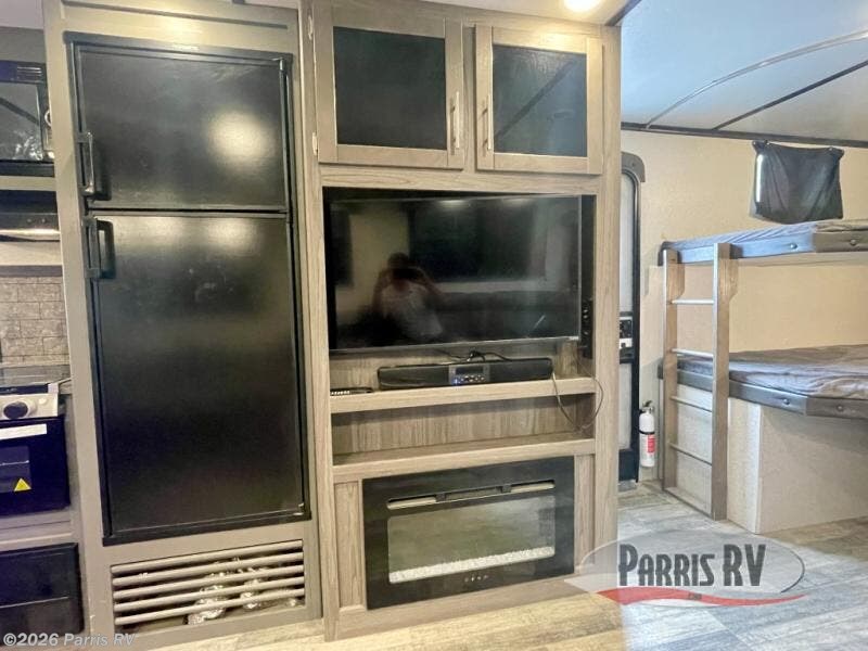 Nothing says fun like camping with your whole family or a larger group. This travel trailer lets you do just that since it can sleep ten people. Your guests will claim the double-size bunks as their own, and you and your spouse will appreciate their own private bedroom up front. You'll find additional sleeping space within the large slide out on the tri-fold sofa and U-shaped dinette. This model includes plenty of storage space, including a large pantry, overhead compartments, plus a medicine cabinet in the bathroom. Whether you're taking a rest on the king bed, relaxing in front of the fireplace, or sitting under the power awning with LED lights, you will fall in love with this travel trailer!