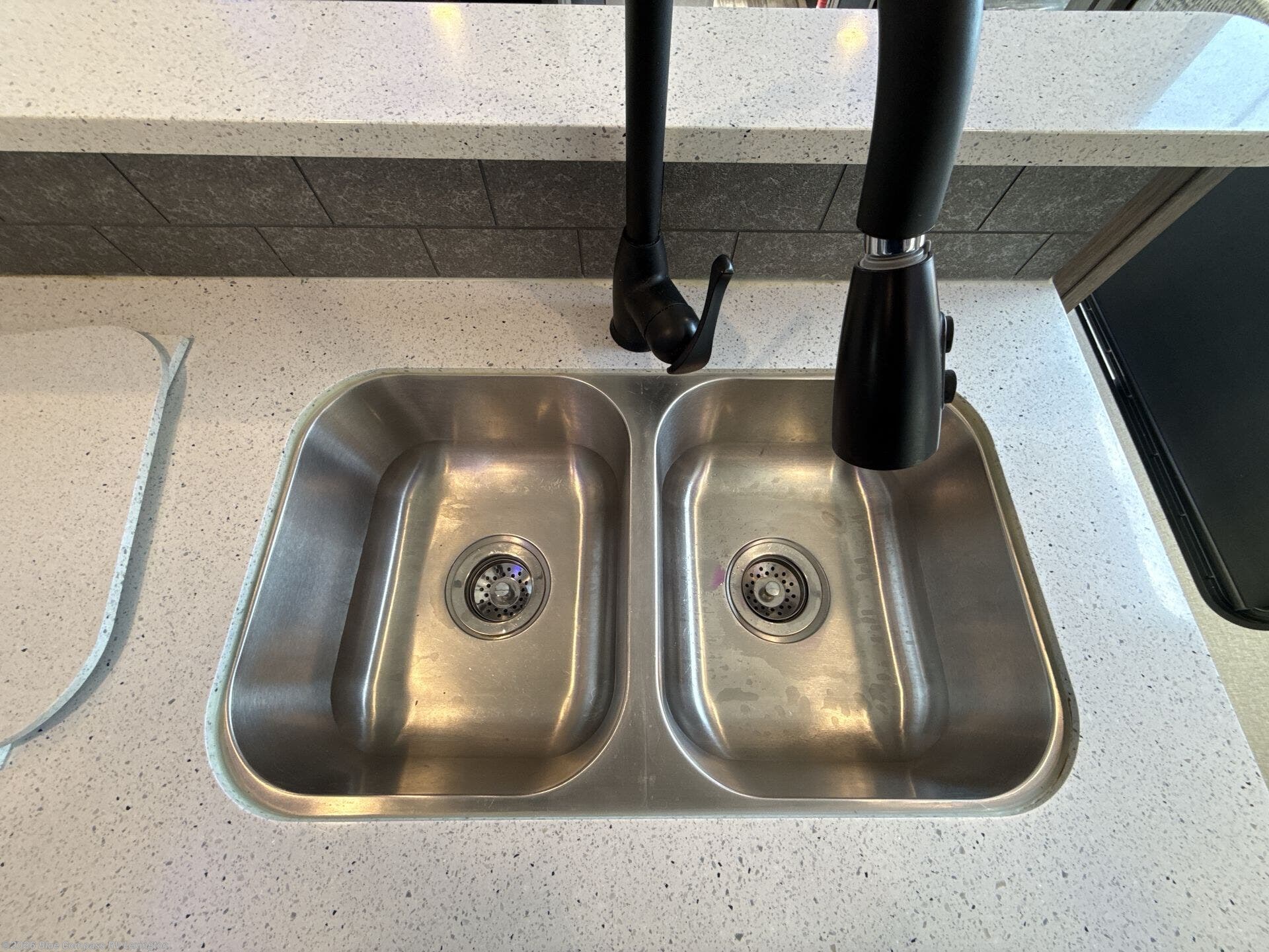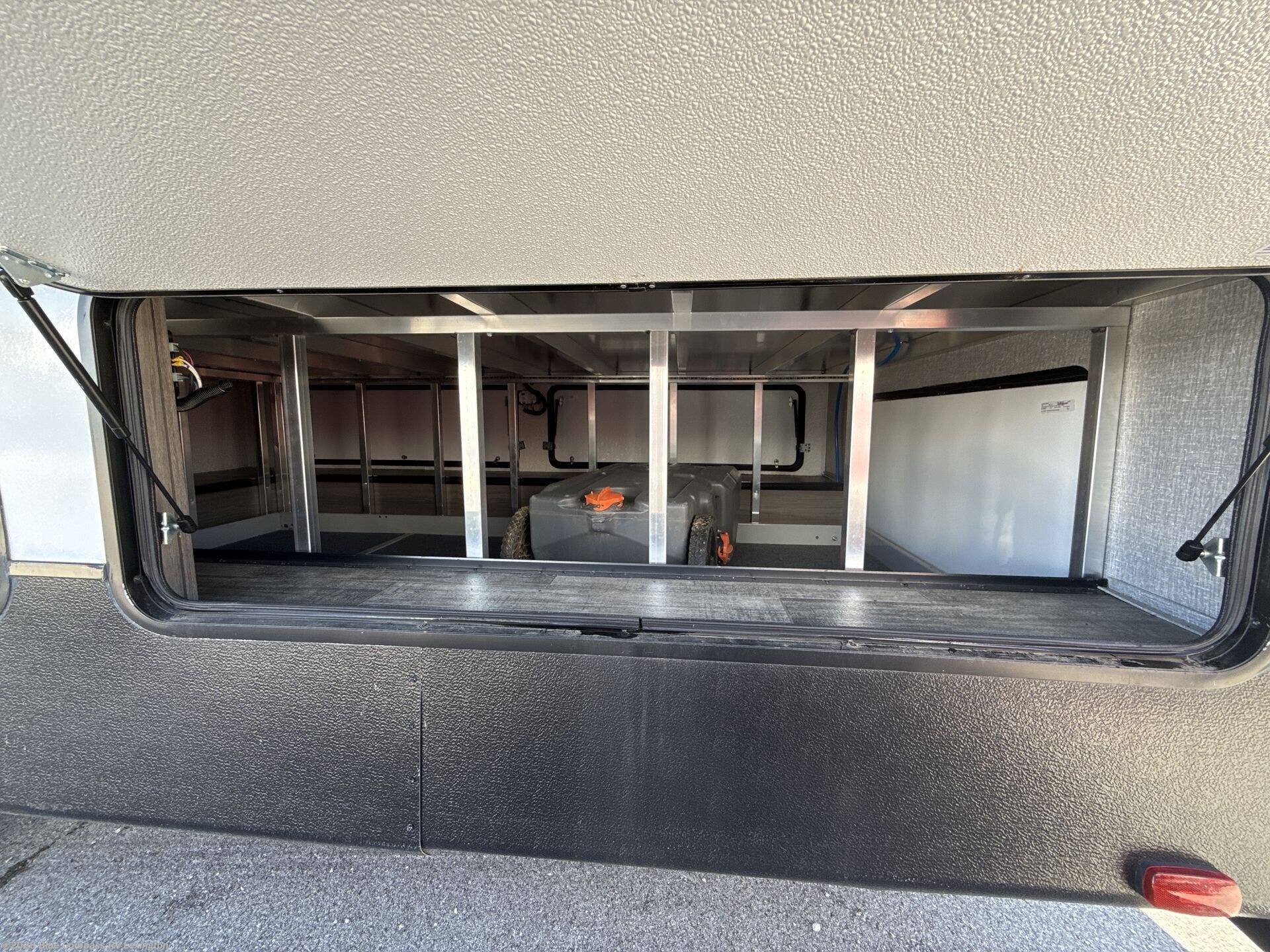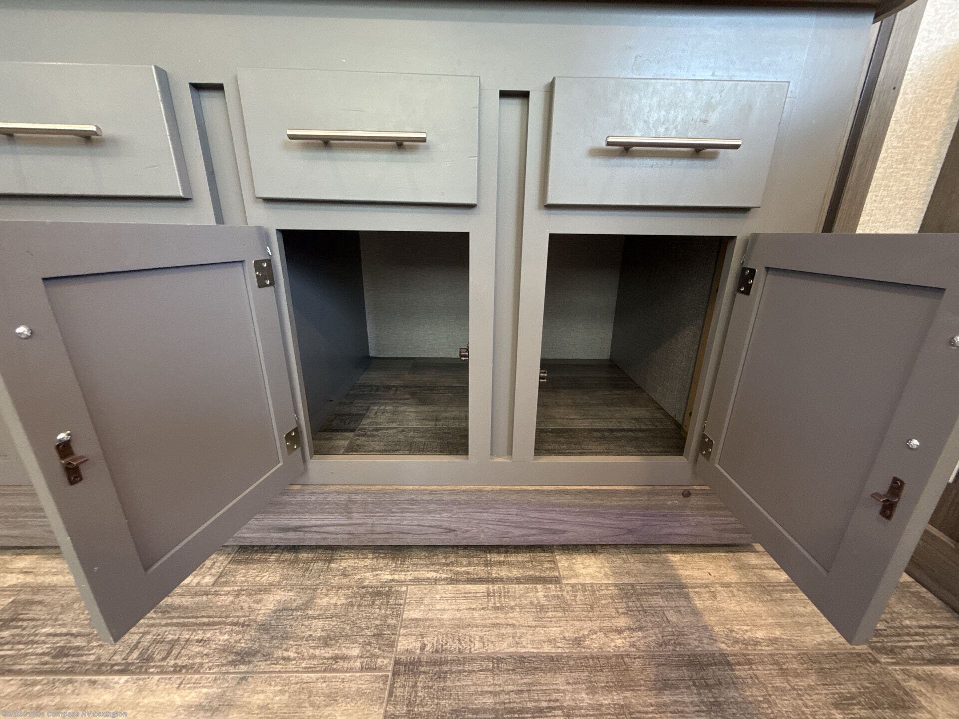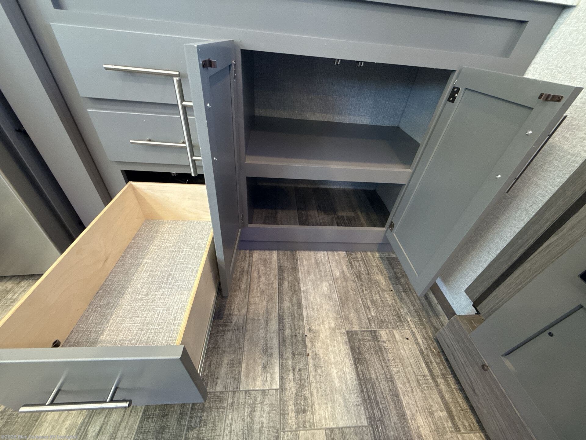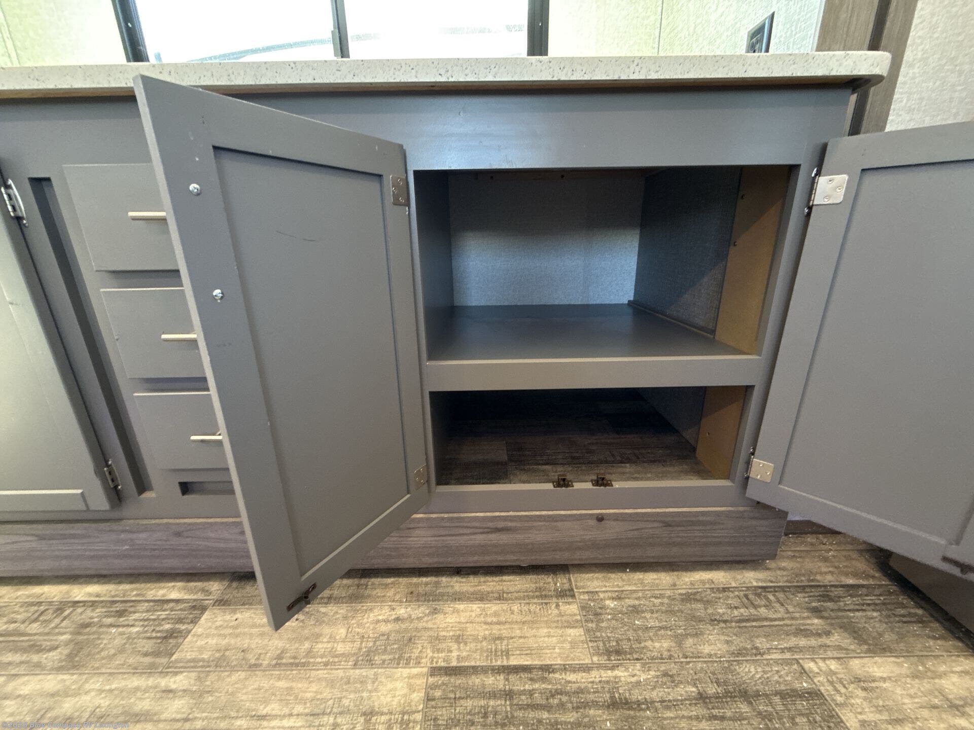 This is a fifth wheel you don't want to pass up! The chef of the family will love the rear kitchen with its dual opposing slides for maximum space and solid-surface countertops. You'll also find dual opposing slides in the main living area, plus theater seating, a tri-fold sofa, and a free-standing table with chairs to dine just like you do at home. The 48" x 115" cargo tray under the rear kitchen will allow you to bring along the kids' scooters, all your luggage, plus fishing poles and lawn chairs. You and your spouse will enjoy the front private bedroom that includes a slide out king bed and a large front wardrobe.