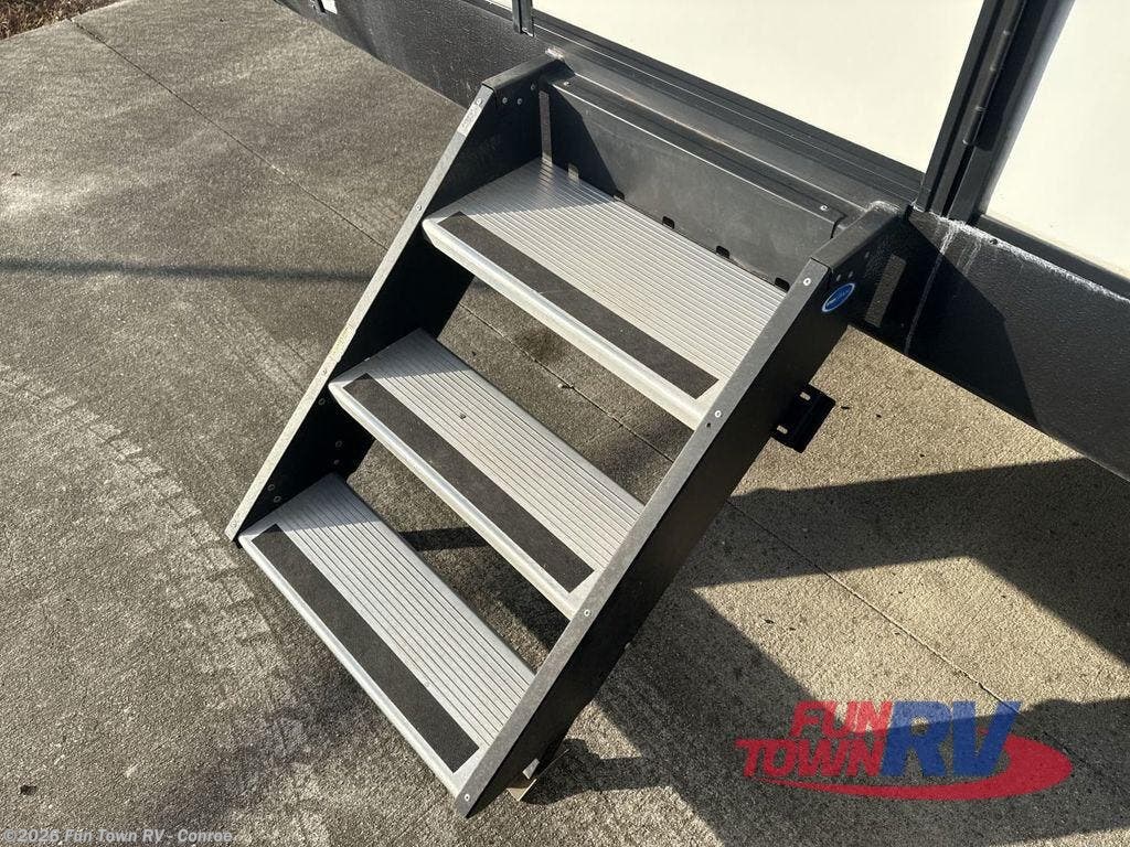 Convenience is found throughout this trailer for you and your spouse, plus your kids or overnight guests. The main entry gives you quick access to the walk-in pantry/wardrobe and living/kitchen area, and the second entry allows you to get into your bedroom and to the walk-through bathroom easily. Once inside you can relax on the sofa and booth dinette, make a meal in the middle kitchen with raised bar, work at the desk with a window for great views, and get clean up in the full bathroom. And you will have a king-size sliding bed at night, two wardrobes to store your clothing, and so much more in this trailer!