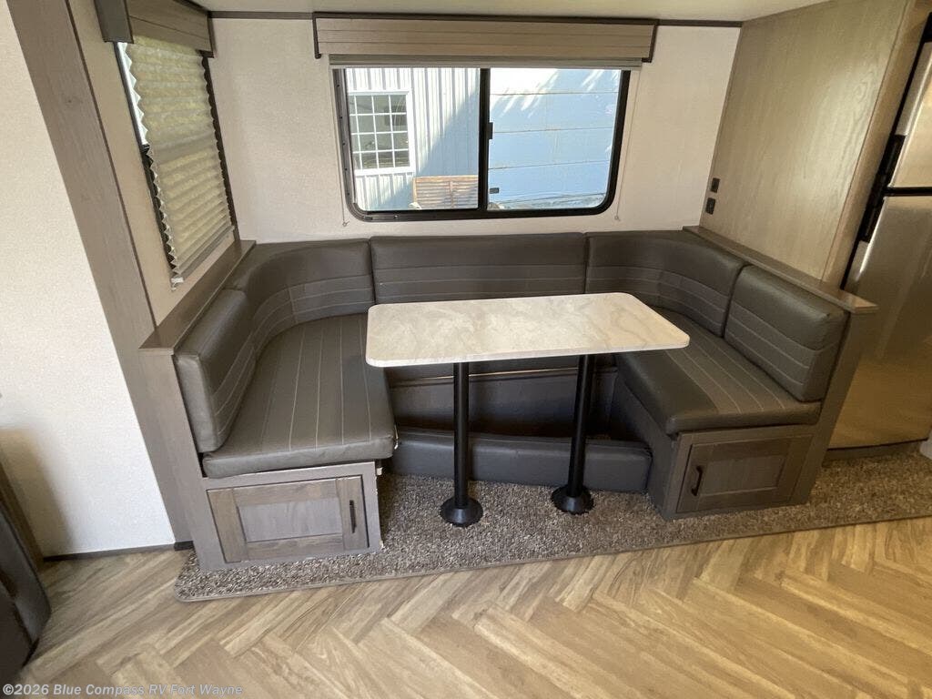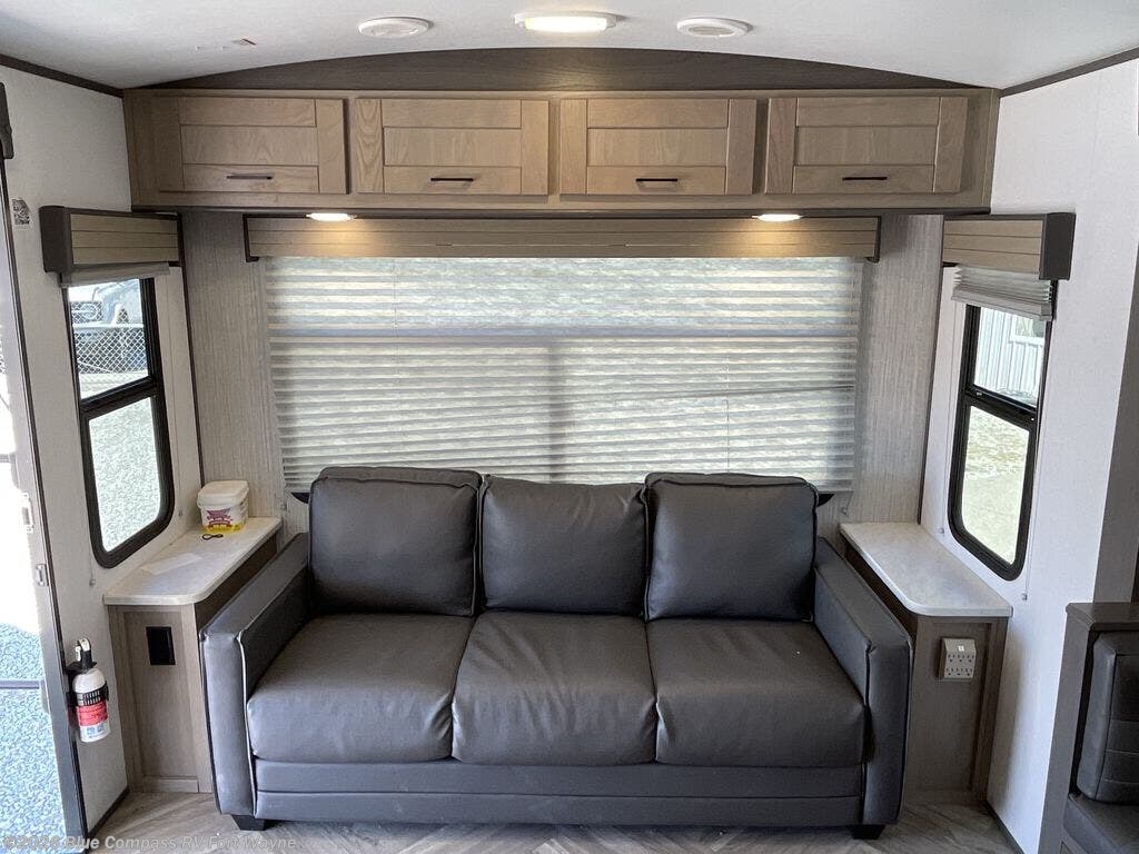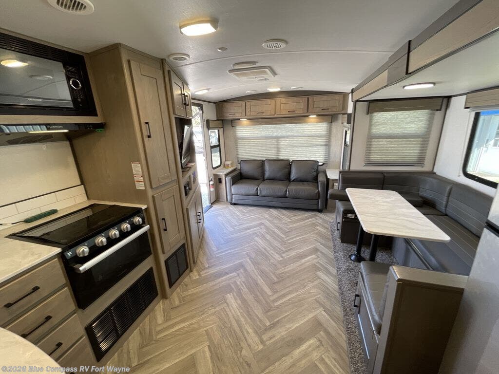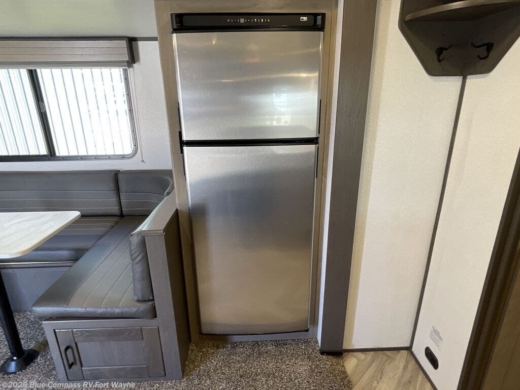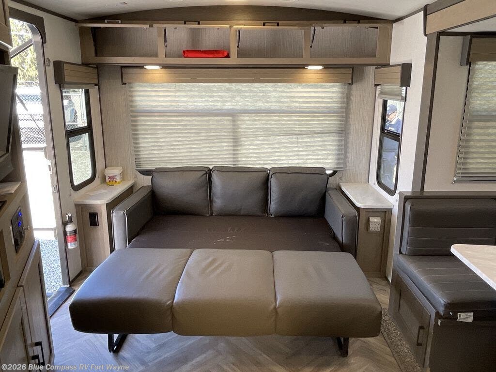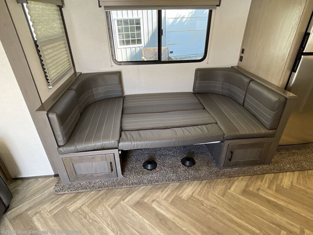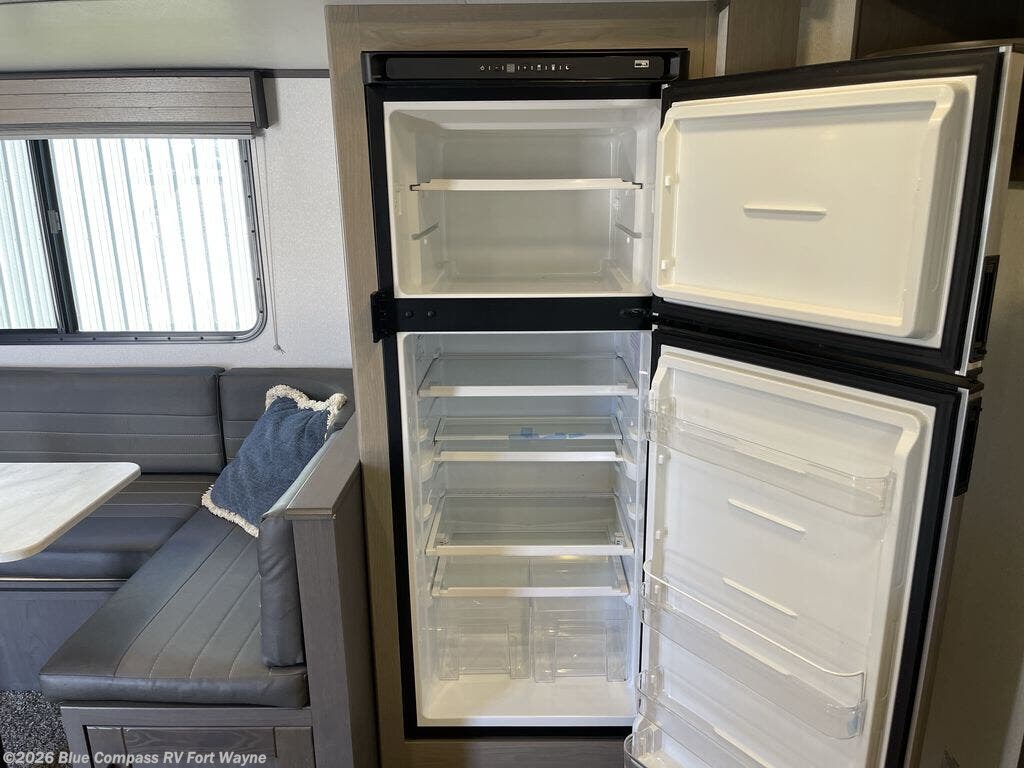 This is the perfect couples trailer with a king-size sliding bed in the front private bedroom with access to the outside through the second entry and to the walk-through bathroom through a space savings sliding door. The L-shaped kitchen offers full amenities, plus there is a pantry to store lots of goodies and a double door refrigerator to store leftovers. Relax on the sofa and U-shaped dinette after a day of hiking, plus both provide extra sleeping space when the grandkids join you. And you can relax under the electric awning while visiting with other RVers while you plan your next adventure.