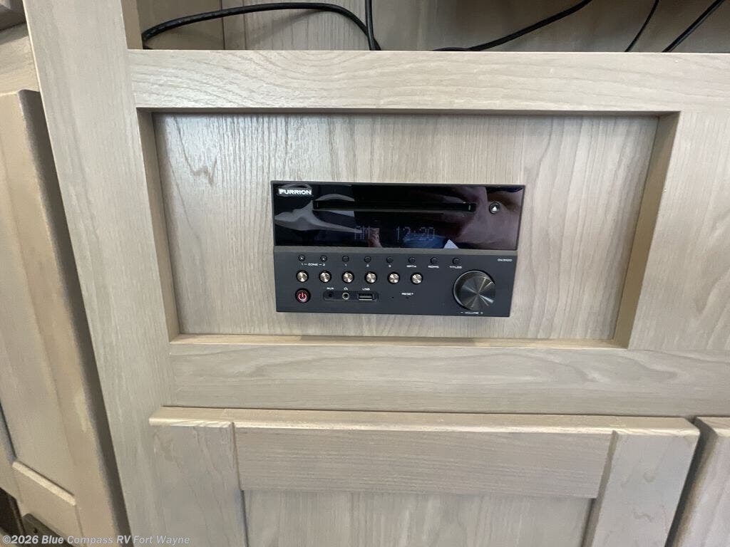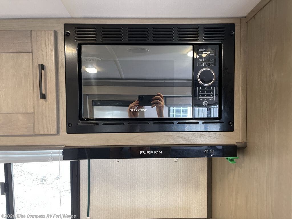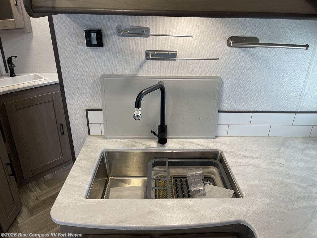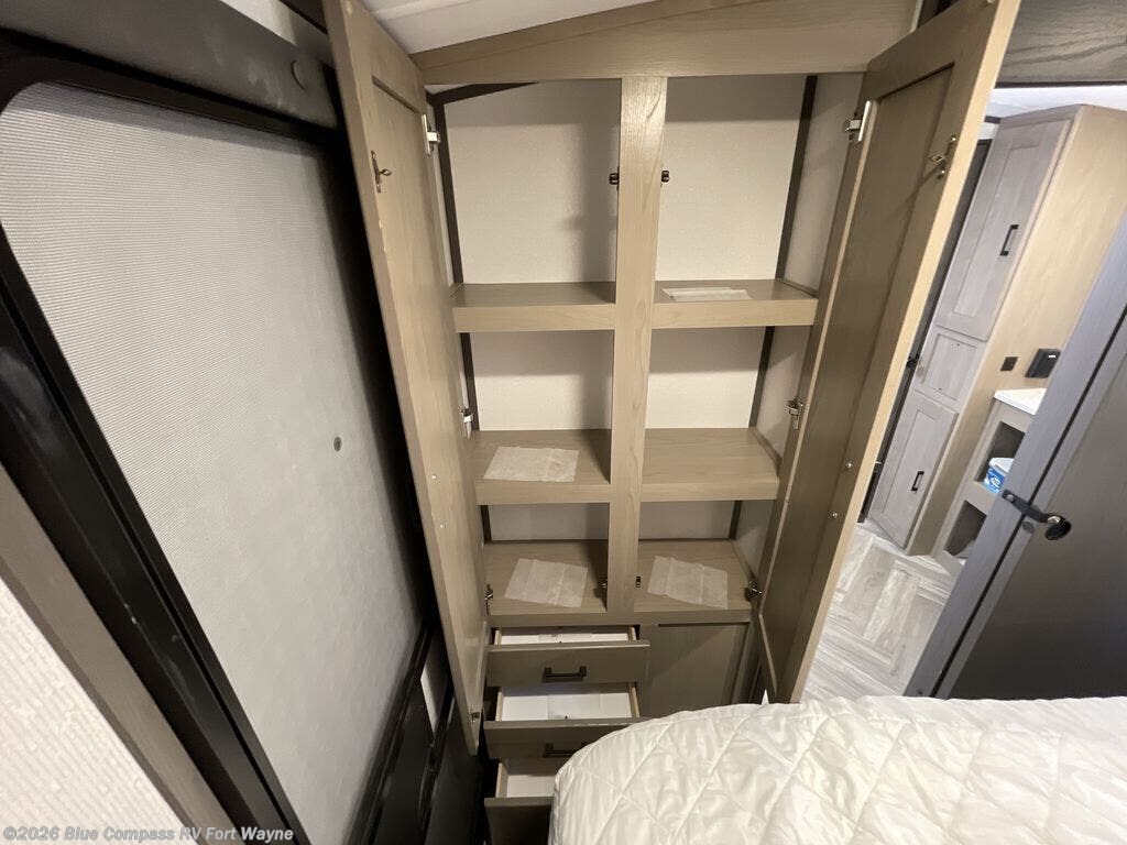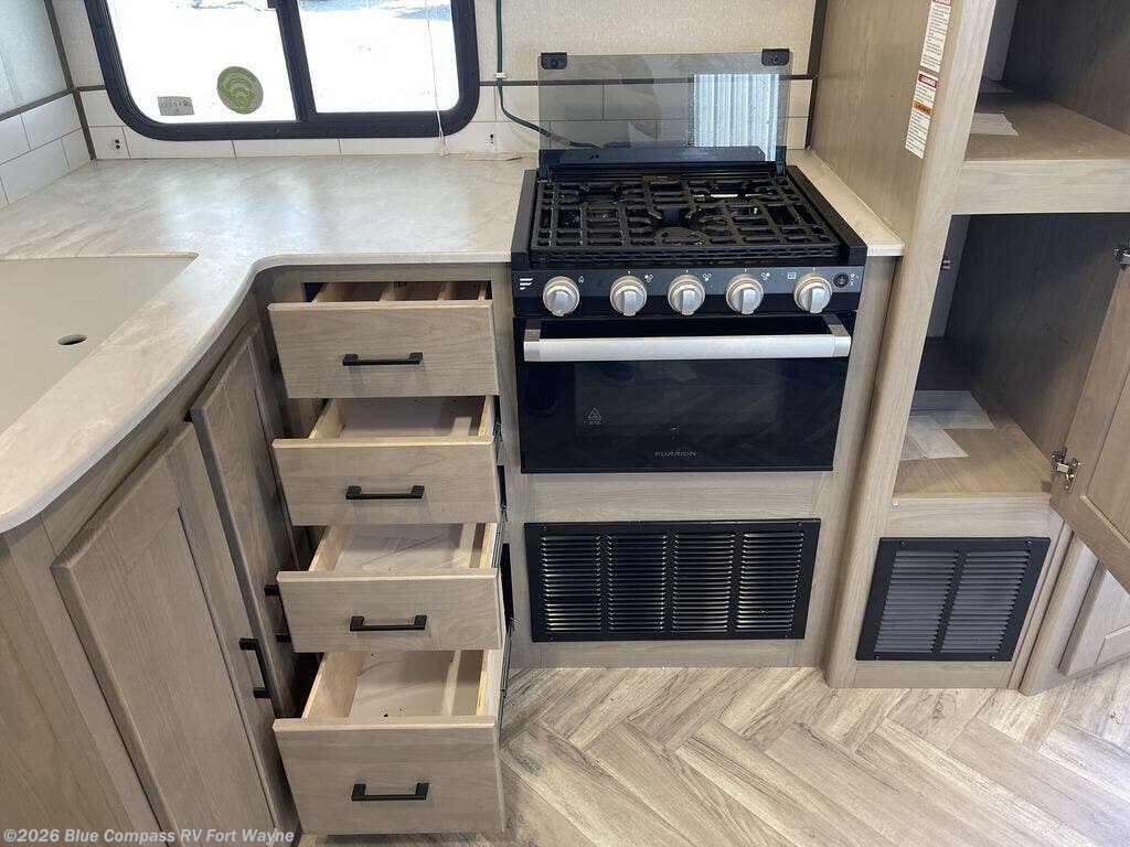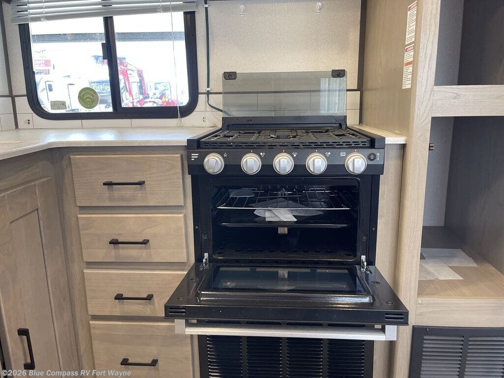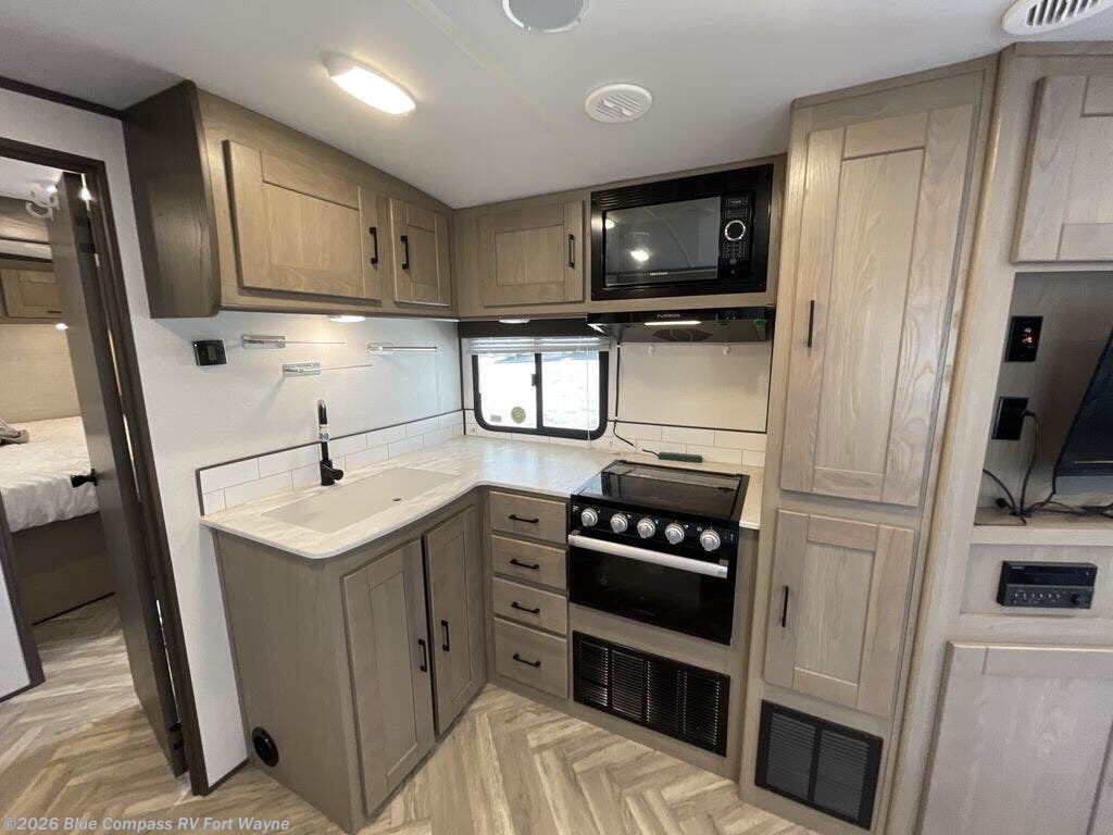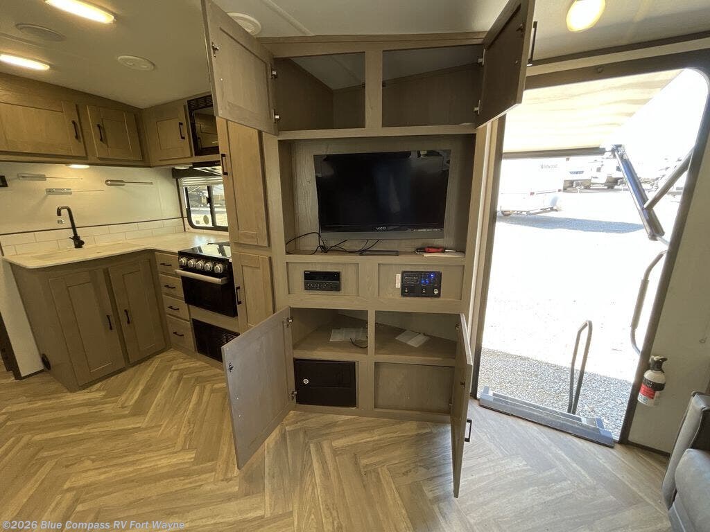This is the perfect couples trailer with a king-size sliding bed in the front private bedroom with access to the outside through the second entry and to the walk-through bathroom through a space savings sliding door. The L-shaped kitchen offers full amenities, plus there is a pantry to store lots of goodies and a double door refrigerator to store leftovers. Relax on the sofa and U-shaped dinette after a day of hiking, plus both provide extra sleeping space when the grandkids join you. And you can relax under the electric awning while visiting with other RVers while you plan your next adventure.