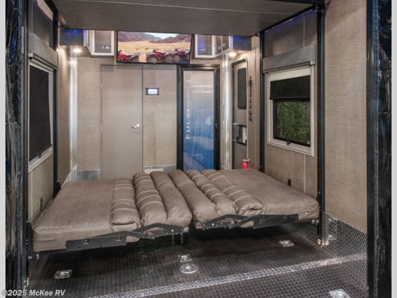 One of the best things about this Full House fifth wheel toy hauler is the fact that it comes with both a full and half bathroom! You'll also find extra convenience in the kitchen with the island that delivers some extra space for meal prep, and additionally, the opposing slides will provide more interior living space in this area as well. Throughout this entire unit, you will find three LED TVs which means that it will be super easy to stay entertained even if the weather outside isn't cooperating, and there is superb storage with the walk-in closet and vanity slide in the front bedroom.