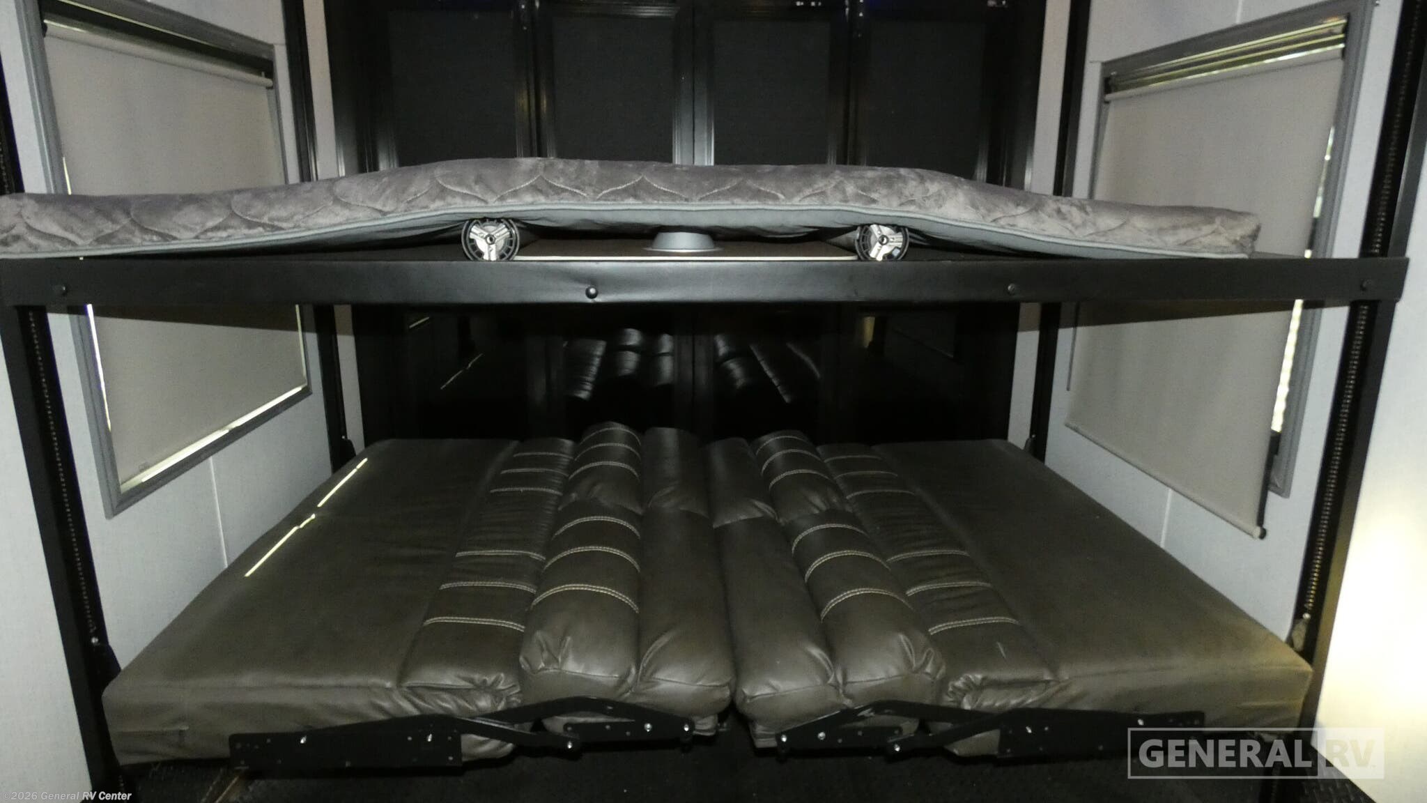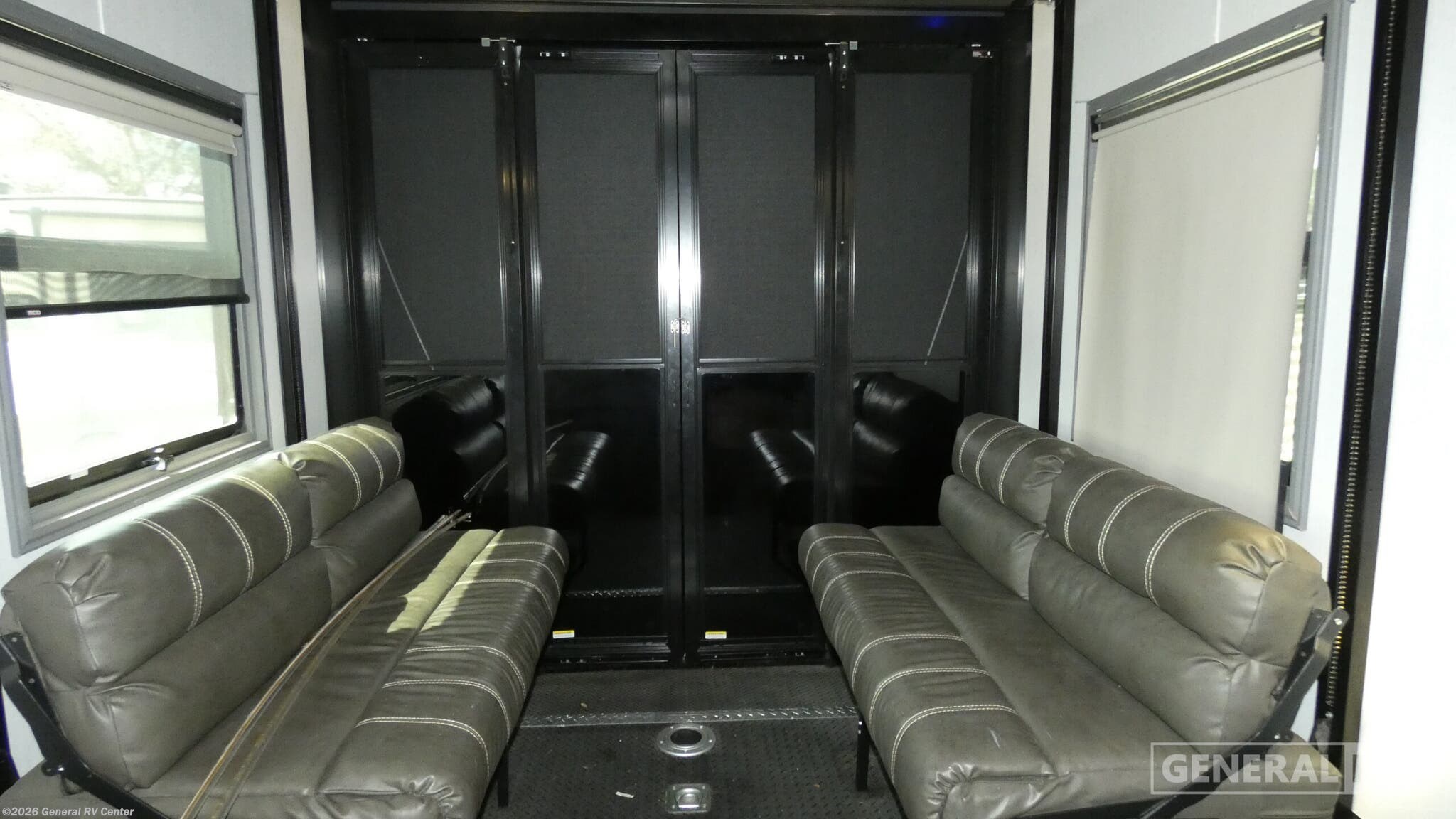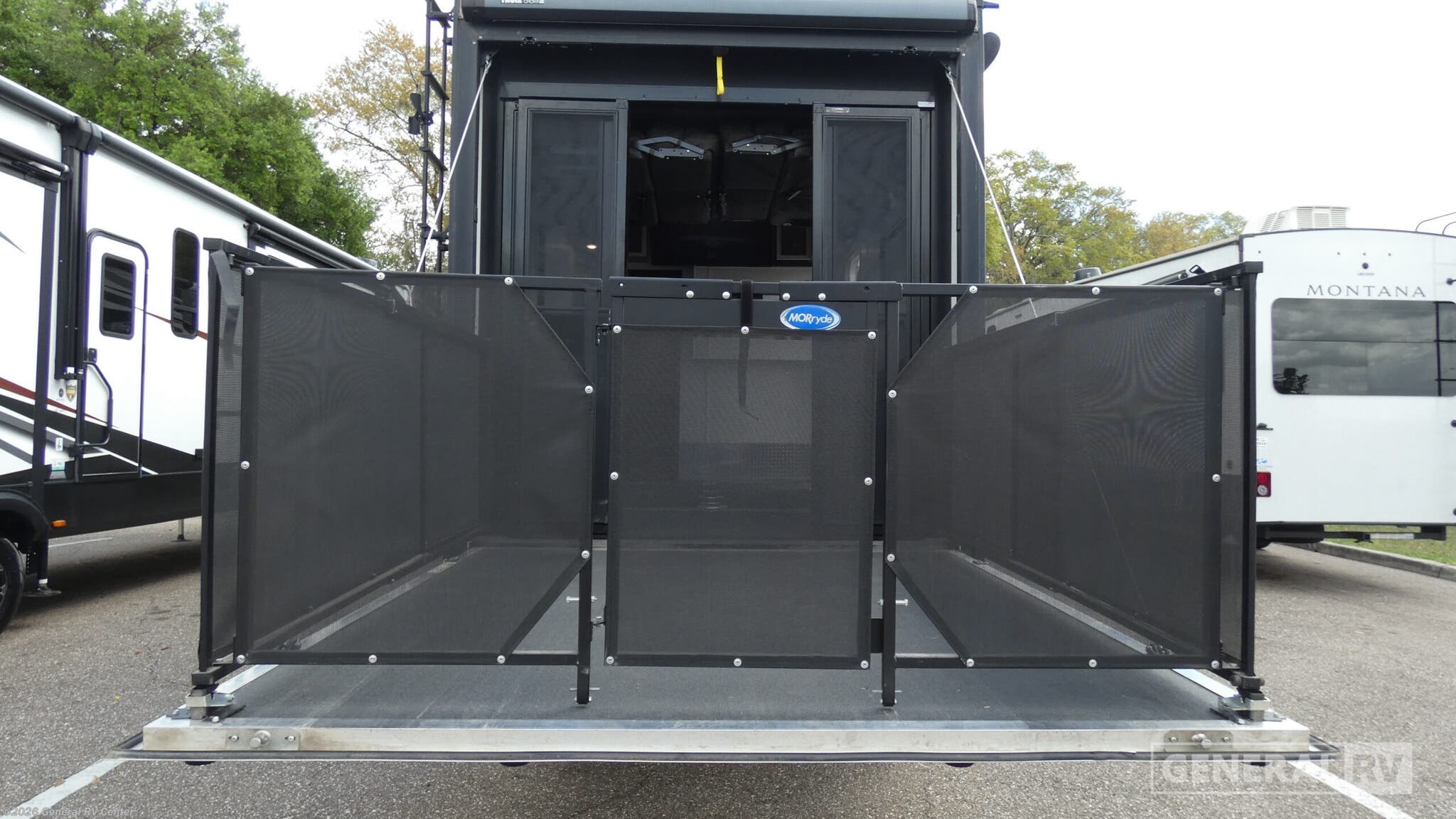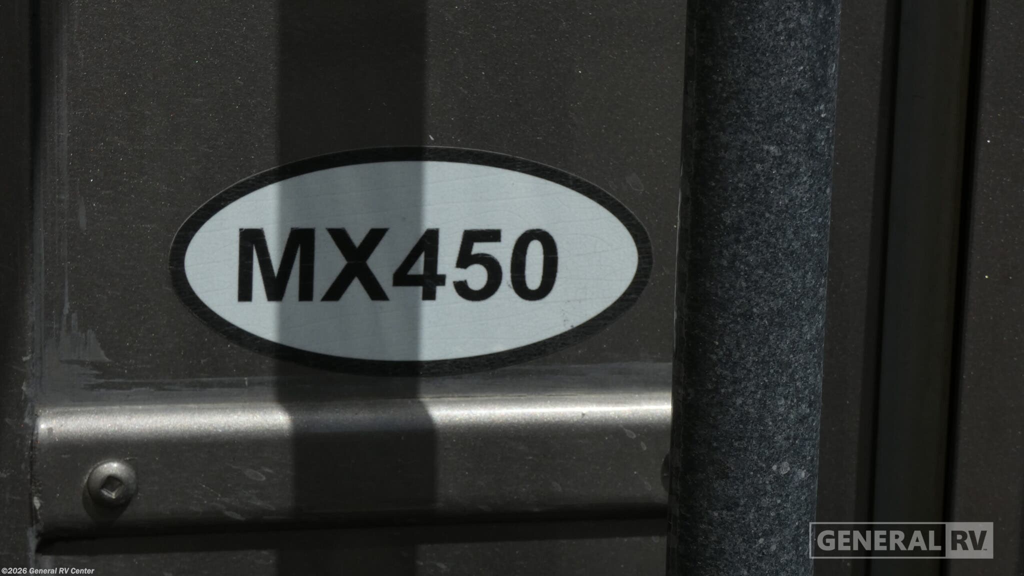 **DRX Luxury Suites Full House toy hauler MX450 highlights:** - Fireplace - Theater Seating - Kitchen Peninsula - 13' Separate Garage - Three LED HDTVs - Walk-In Closet You will absolutely fall in love with this stunning Full House fifth wheel toy hauler! Not only does this unit have beautiful décor, but it also has very accommodating and residential features so that you can truly feel like you've got a full house on wheels. The front private bedroom has a walk-in closet, 32" LED TV, and vanity slide, and the bathroom has a shower with skylight for exceptional lighting in the morning when you're getting ready. You can choose to enter the main living area or the 13' separate garage since this unit has two entry doors, and as you rest upon the theater seating, you'll appreciate the added interior space that comes from the opposing slides. You will find full-time living at its best in the DRV Luxury Suites Full House fifth wheel toy hauler! This luxurious brand features several items that most toy haulers tend to ignore when it comes to residential living, but the Full House toy hauler truly is a full house on wheels! The garage features industrial metal cabinetry, LED lighting, a touchscreen entertainment system, a 50" LED HDTV, and dual 30-gallon fuel tanks. You can even choose to amp up the garage to the next level by adding the optional patio and the electric drop-down bed. A six-point hydraulic leveling system keeps your Full House in place, and the Onan gasoline generator supplies power to your unit. The interior is rather glamorous with its hand-laid vinyl floor tile, its crown molding, its plush residential high-durability carpet, and its ceiling fan, and the residential kitchen is undoubtedly going to be an essential feature for full-time living.