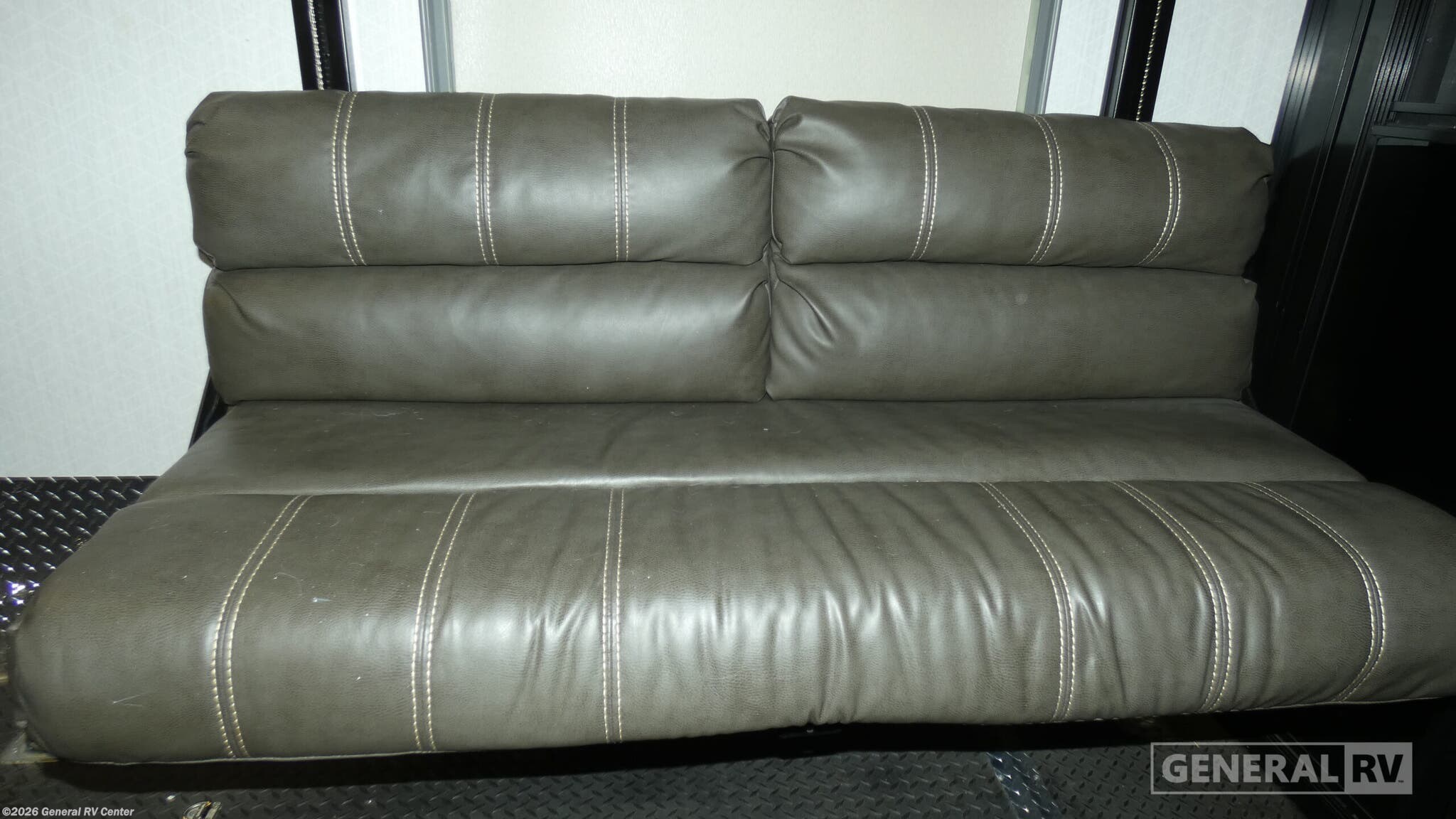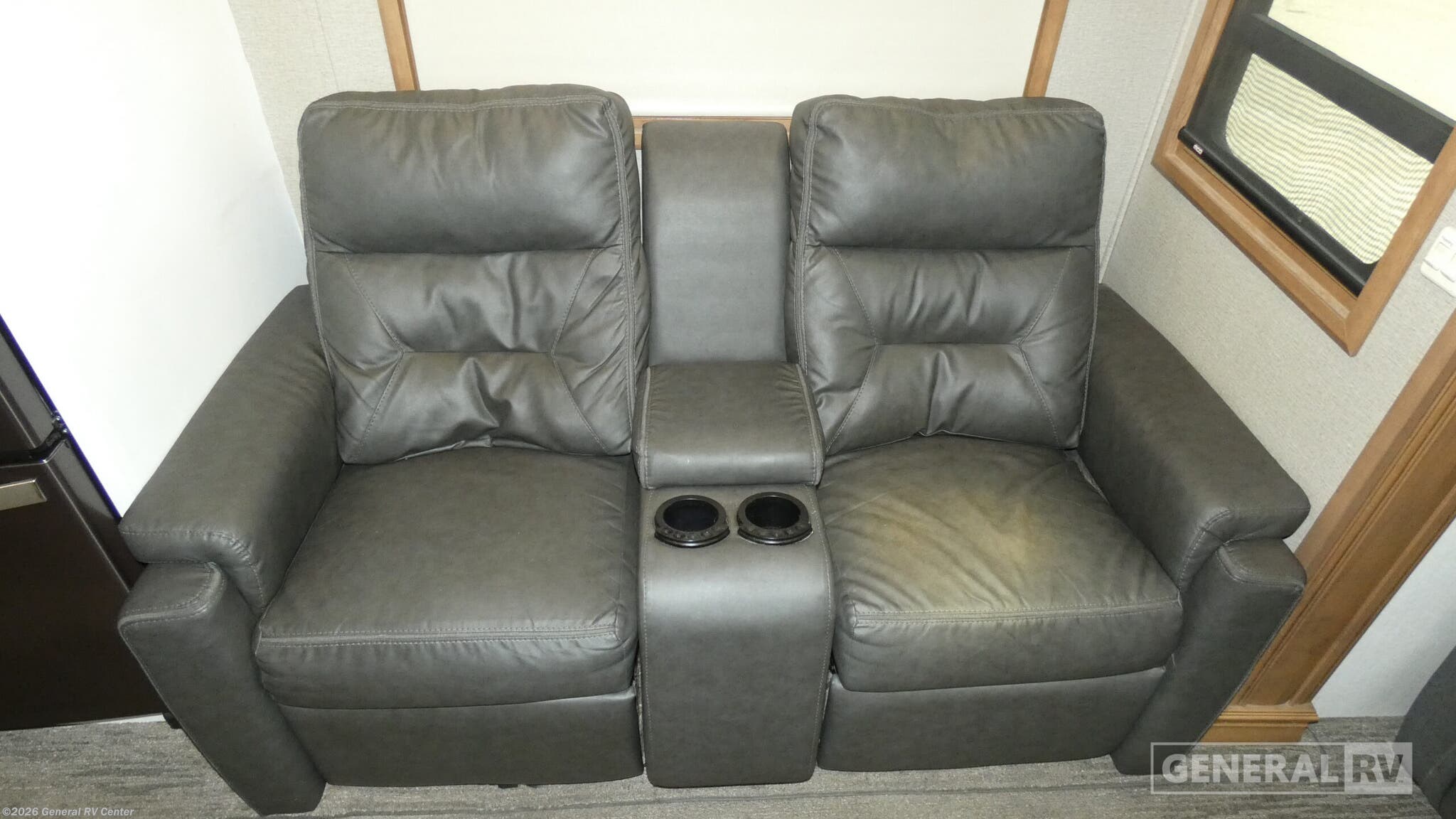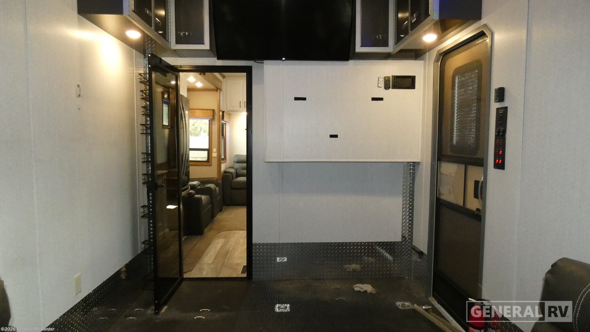 **DRX Luxury Suites Full House toy hauler MX450 highlights:** - Fireplace - Theater Seating - Kitchen Peninsula - 13' Separate Garage - Three LED HDTVs - Walk-In Closet You will absolutely fall in love with this stunning Full House fifth wheel toy hauler! Not only does this unit have beautiful décor, but it also has very accommodating and residential features so that you can truly feel like you've got a full house on wheels. The front private bedroom has a walk-in closet, 32" LED TV, and vanity slide, and the bathroom has a shower with skylight for exceptional lighting in the morning when you're getting ready. You can choose to enter the main living area or the 13' separate garage since this unit has two entry doors, and as you rest upon the theater seating, you'll appreciate the added interior space that comes from the opposing slides. You will find full-time living at its best in the DRV Luxury Suites Full House fifth wheel toy hauler! This luxurious brand features several items that most toy haulers tend to ignore when it comes to residential living, but the Full House toy hauler truly is a full house on wheels! The garage features industrial metal cabinetry, LED lighting, a touchscreen entertainment system, a 50" LED HDTV, and dual 30-gallon fuel tanks. You can even choose to amp up the garage to the next level by adding the optional patio and the electric drop-down bed. A six-point hydraulic leveling system keeps your Full House in place, and the Onan gasoline generator supplies power to your unit. The interior is rather glamorous with its hand-laid vinyl floor tile, its crown molding, its plush residential high-durability carpet, and its ceiling fan, and the residential kitchen is undoubtedly going to be an essential feature for full-time living.