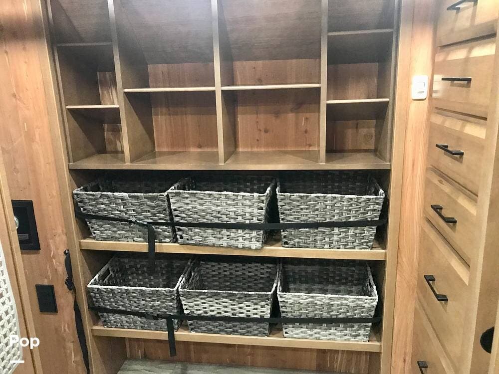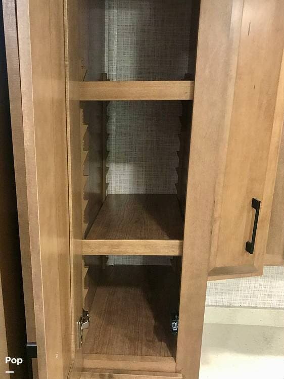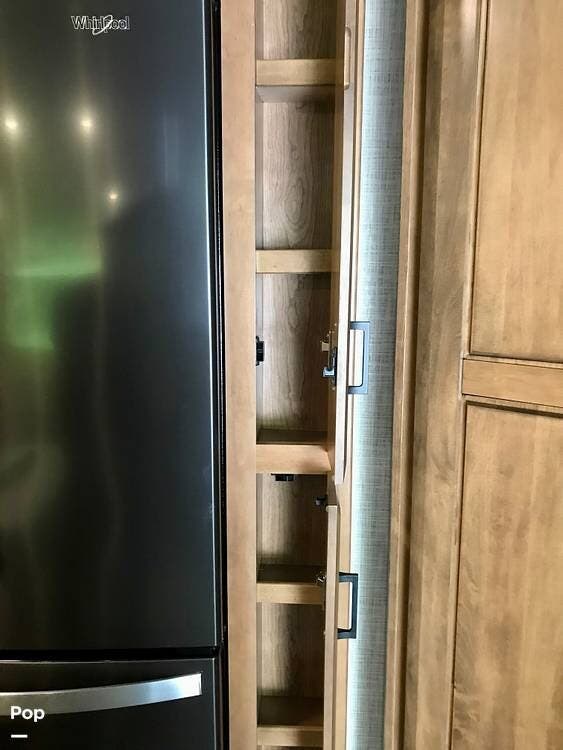 This fifth wheel has been thoughtfully modified from the original floorplan, replacing the standard half bath with a spacious walk-in pantry--perfect for anyone who appreciates extra storage and a more functional kitchen setup and stackable washer/dryer centrally located.
