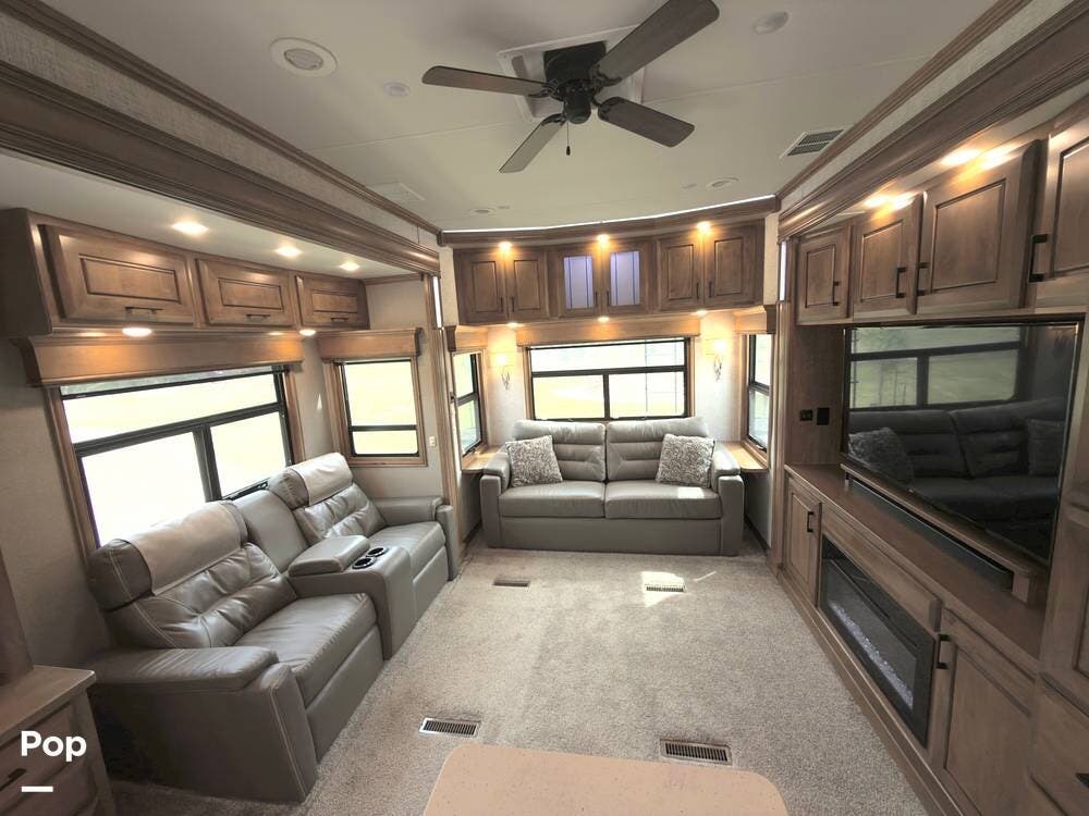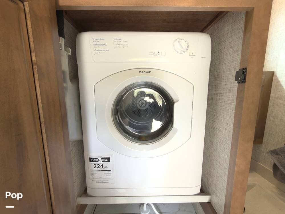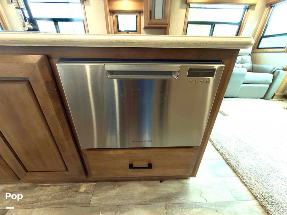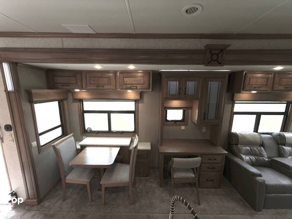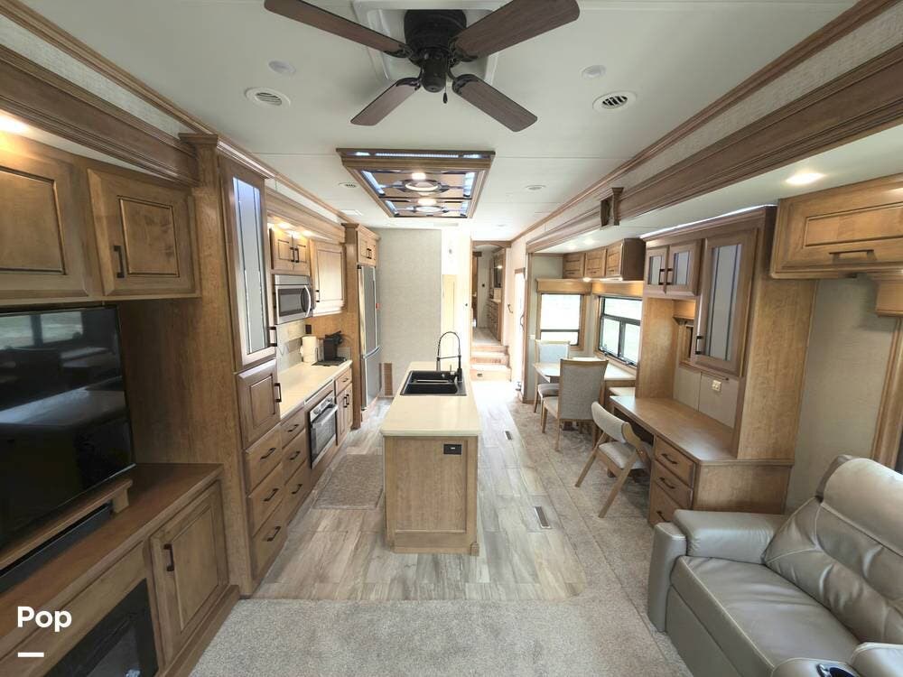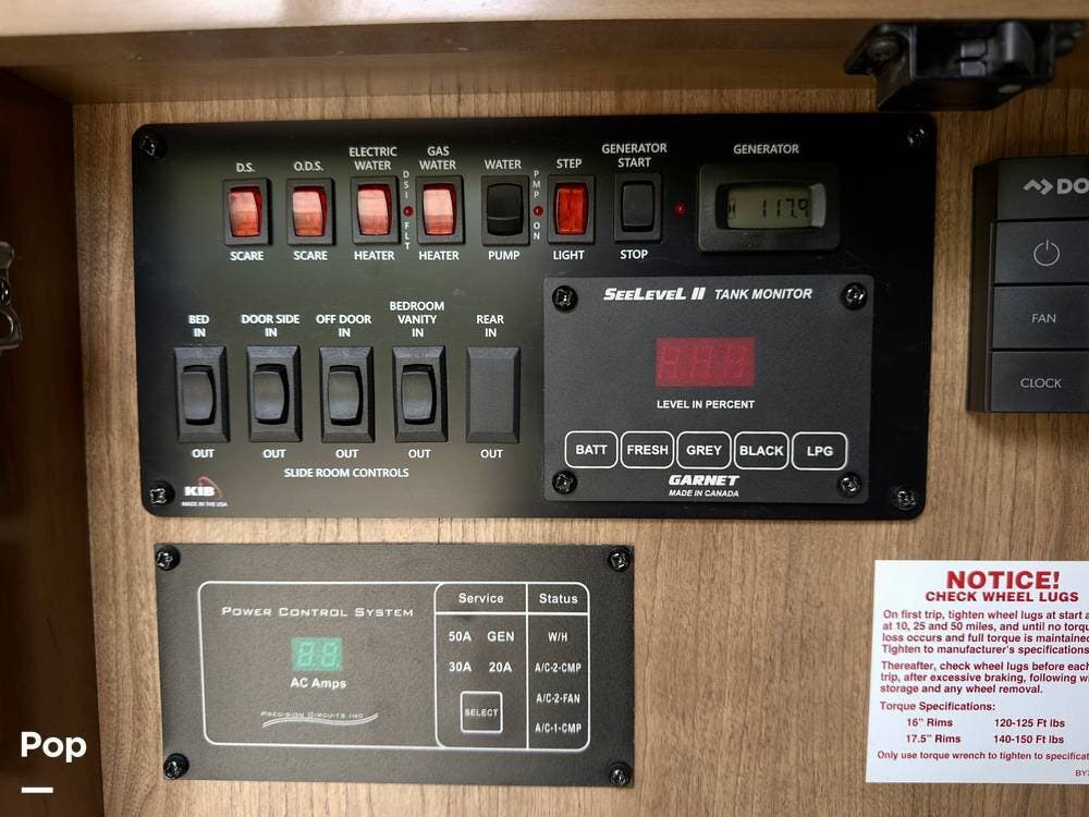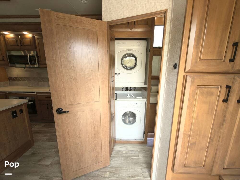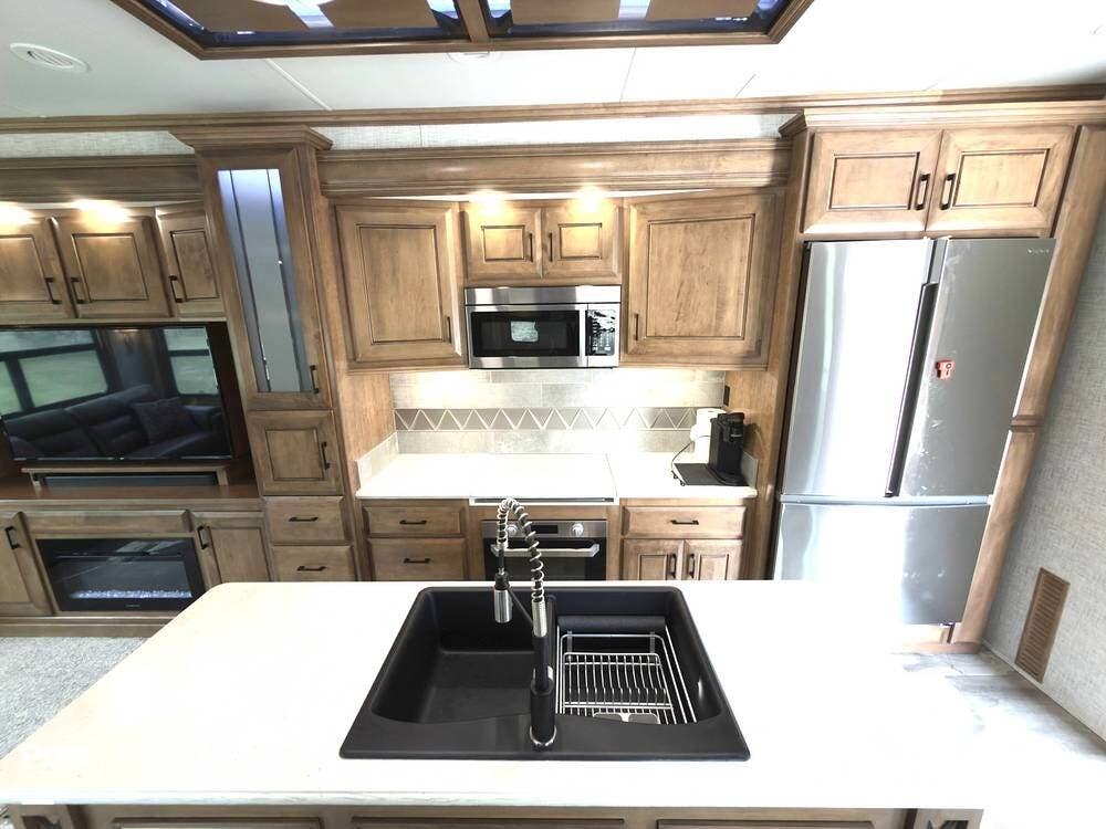 One-piece molded fiberglass roof, added 4th slide option (bedroom vanity), upgraded from 5500 Onan Generator to the 6500, 3rd A/C, Wifi Ranger, Outdoor Entertainment (TV), Winegard Satellite (HD), built-in wardrobe safe, stacked washer & dryer, power cord reel, 2nd power awning, tank heaters, & quartz countertops.