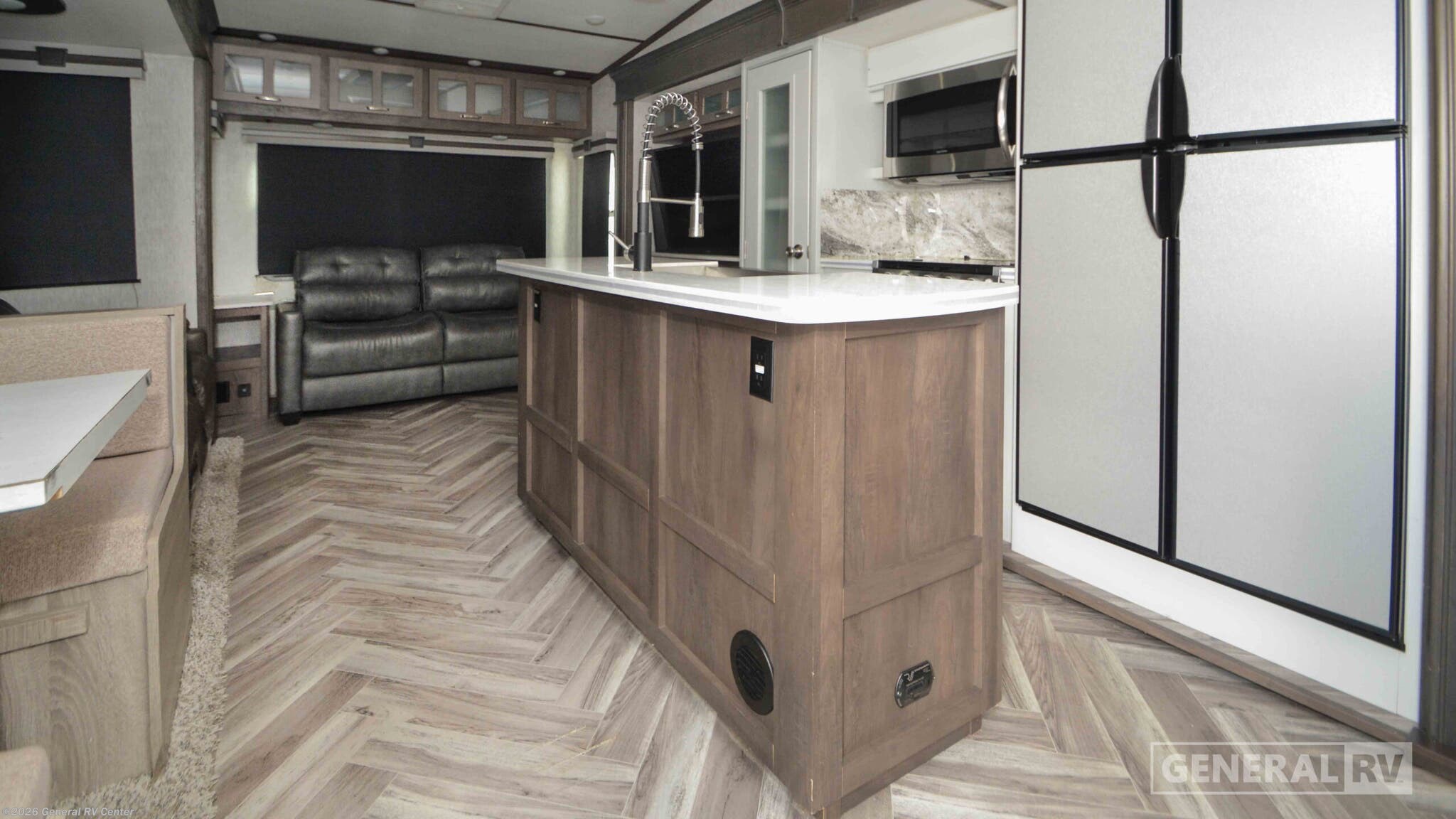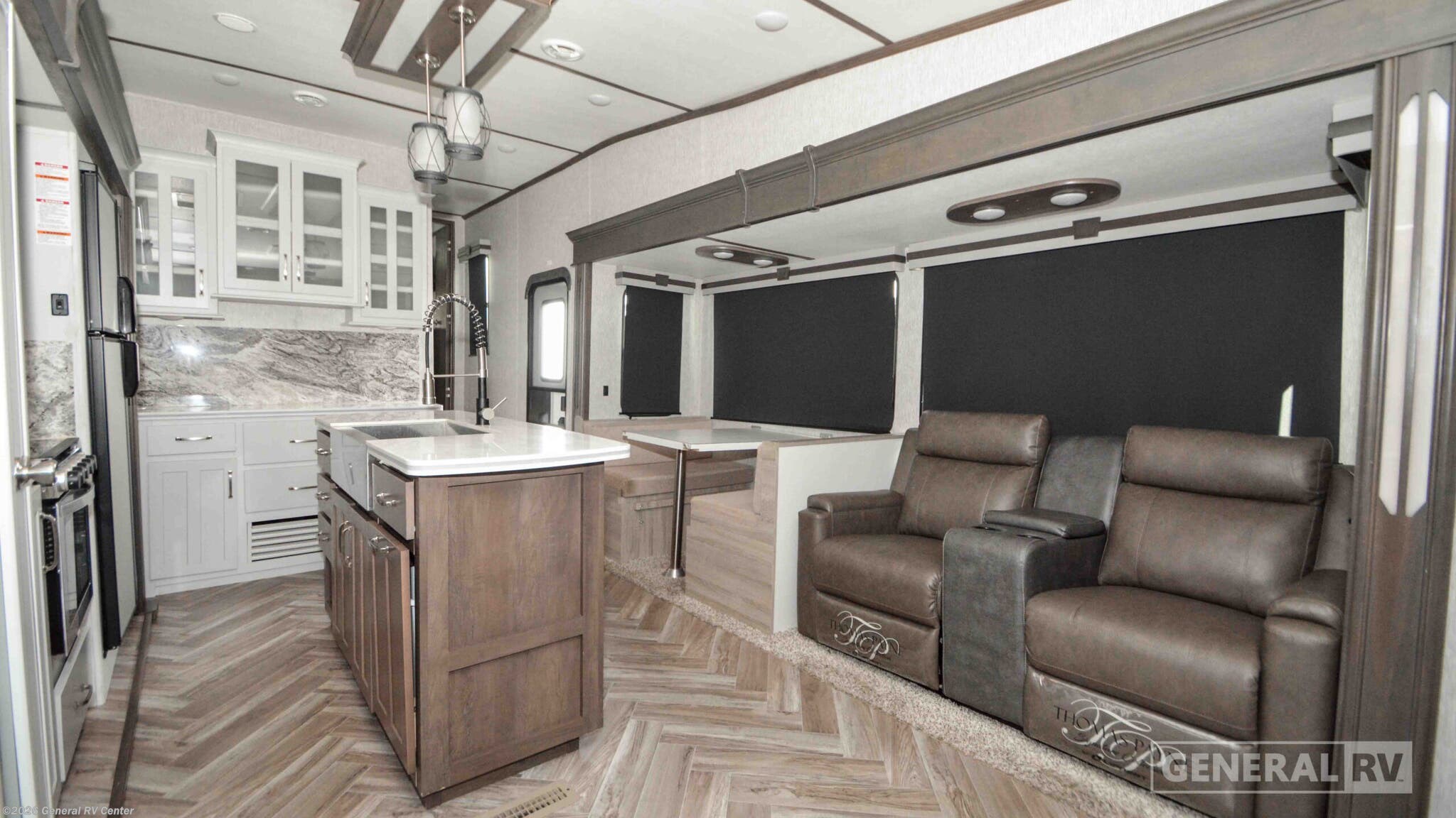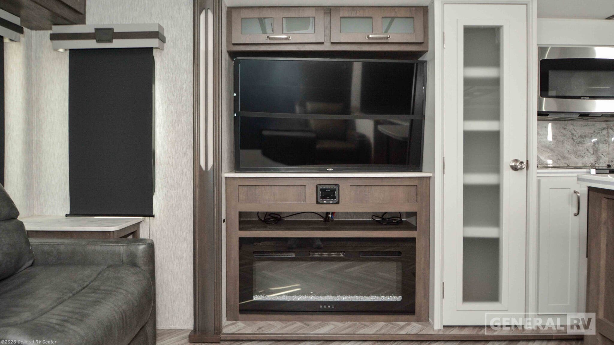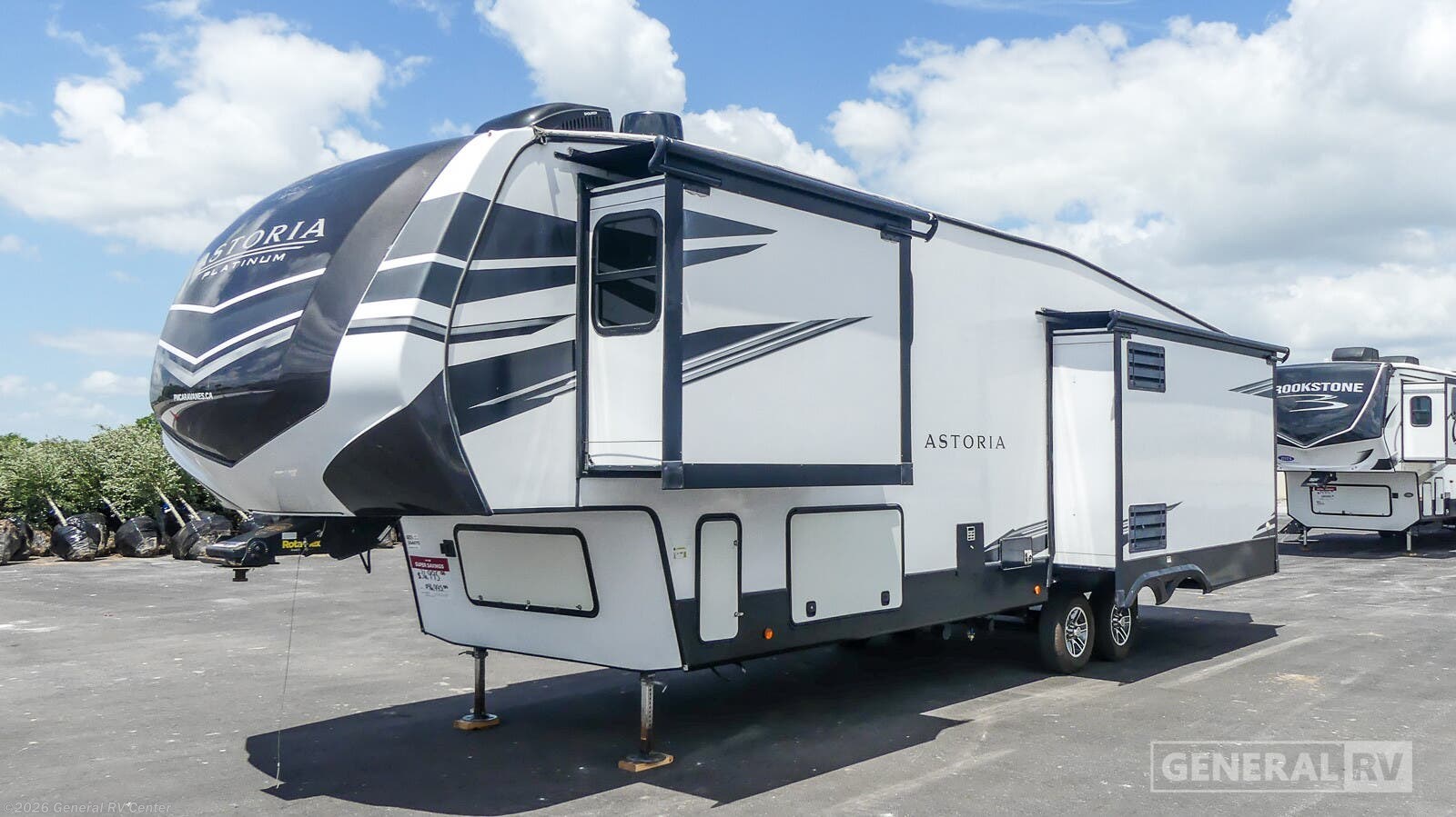 **Dutchmen Astoria Platinum Series fifth wheel 3173RLP highlights:** * Triple Slides * Dual-Sink Vanity * Kitchen Island * Rear Living Area * Free-Standing Dinette * Hutch Whether you travel with your spouse or your family to state parks or RV resorts, this fifth wheel offers enough space and comfort! Enjoy the cozy 40" glass fireplace during chilly months, and the 50" LED TV on rainy days. The dual opposing slides in the rear living/kitchen area open up the whole space, and the kitchen island with solid surface countertop makes it feel more like home. You'll appreciate all the storage space you have, including a pantry and a 12 cu. ft. refrigerator for all your food for the week. This unit features a front private bedroom with a king-size bed slide and a large front wardrobe. With any Astoria fifth wheel, you'll get the Dutchmen construction advantage with features such as HyperDeck floor construction which includes linoleum flooring, a steel powder coated main frame, and a fully enclosed underbelly, plus a painted fiberglass cap with LED lights. Some standard features that will impress you include the patio and hitch lights, USB ports to keep all the electronics charged, dual 30 lb. propane tanks, automatic leveling system, dark-tinted safety glass windows, and stainless steel appliances so you can keep your bellies full with home cooked meals. Choose your favorite today!