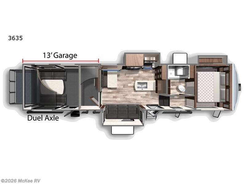 You will be extremely impressed by the amount of luxury found on the Dutchmen Voltage fifth wheel toy hauler! Some of the premium features that you will find on the Voltage are the Zero-Gravity ramp door that lets you access your toys with very little effort and the king-size bed which offers you extra space for sleeping comfortably. The Voltage also has industry-leading 7'-tall slides so that you can feel free to stretch your legs while inside. The ramp door patio system is certainly going to be an appealing factor because it provides you with an extra party space, and the dedicated heat ducts for the underbelly and the All-Weather Package with additional insulation will ensure that your Voltage is protected and prepared for all sorts of weather.