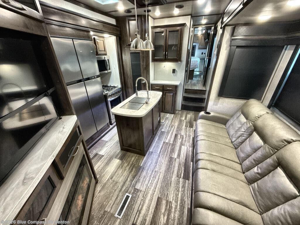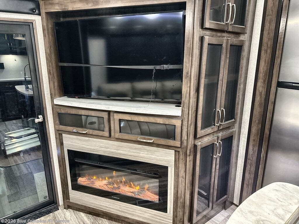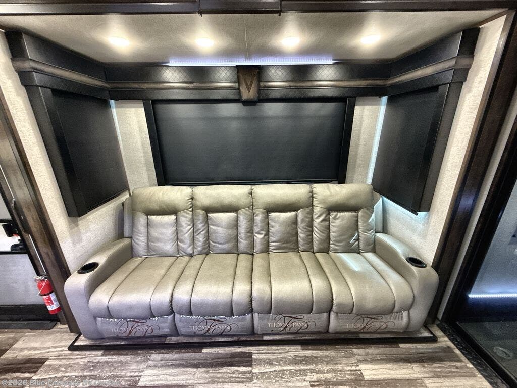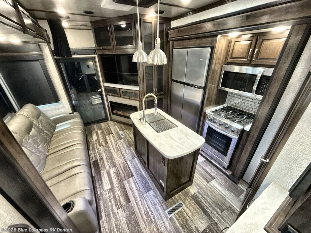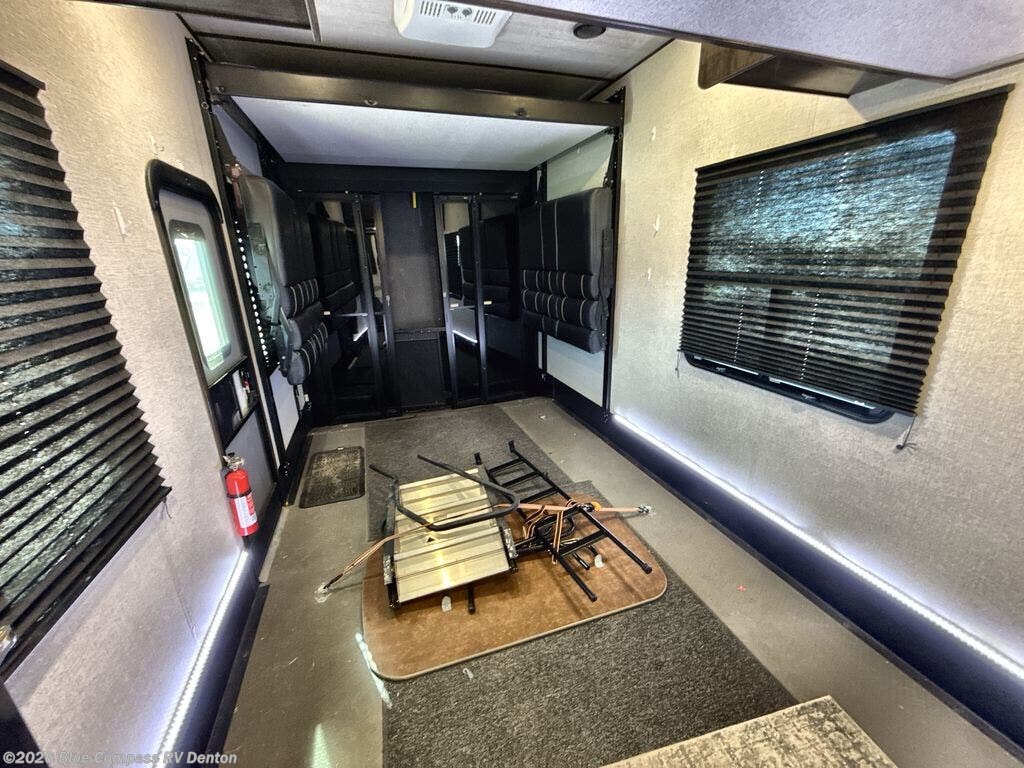 There is so much convenience packed into this Voltage toy hauler! The 15' separate garage comes equipped with a half bathroom, a garage TV, the second exterior entry door, and sleeping accommodations which will provide you with an excellent guest suite. You will actually have your own master suite with a king-size bed up at the front of this unit, and everyone will benefit from the exterior entertainment center. The main kitchen/living area has two opposing slides so that you can sit back on the residential sofa with heat and massage as you take in the warmth of the fireplace, and the pendant lighting above the kitchen island is a stunning addition to the fully equipped kitchen.