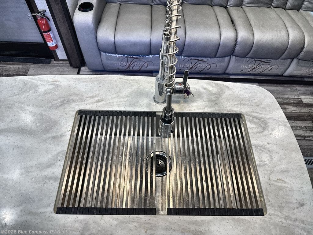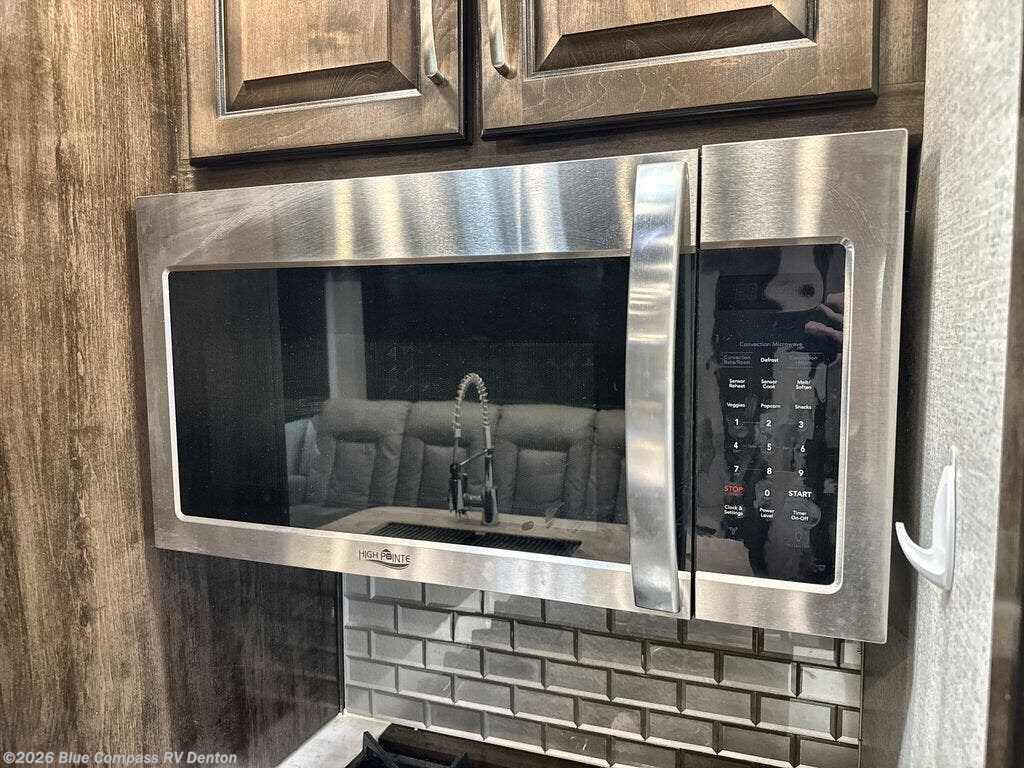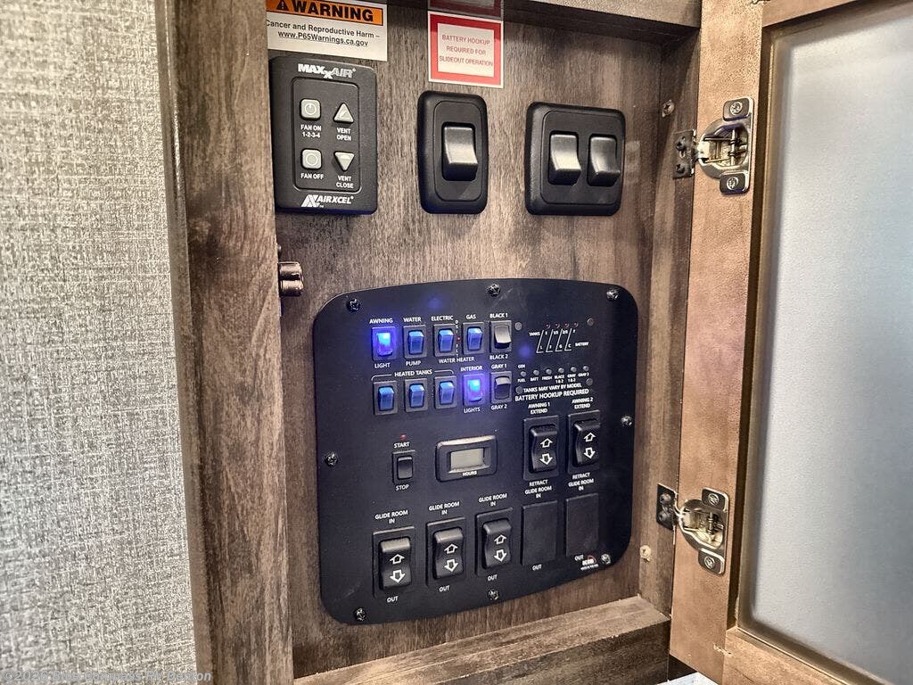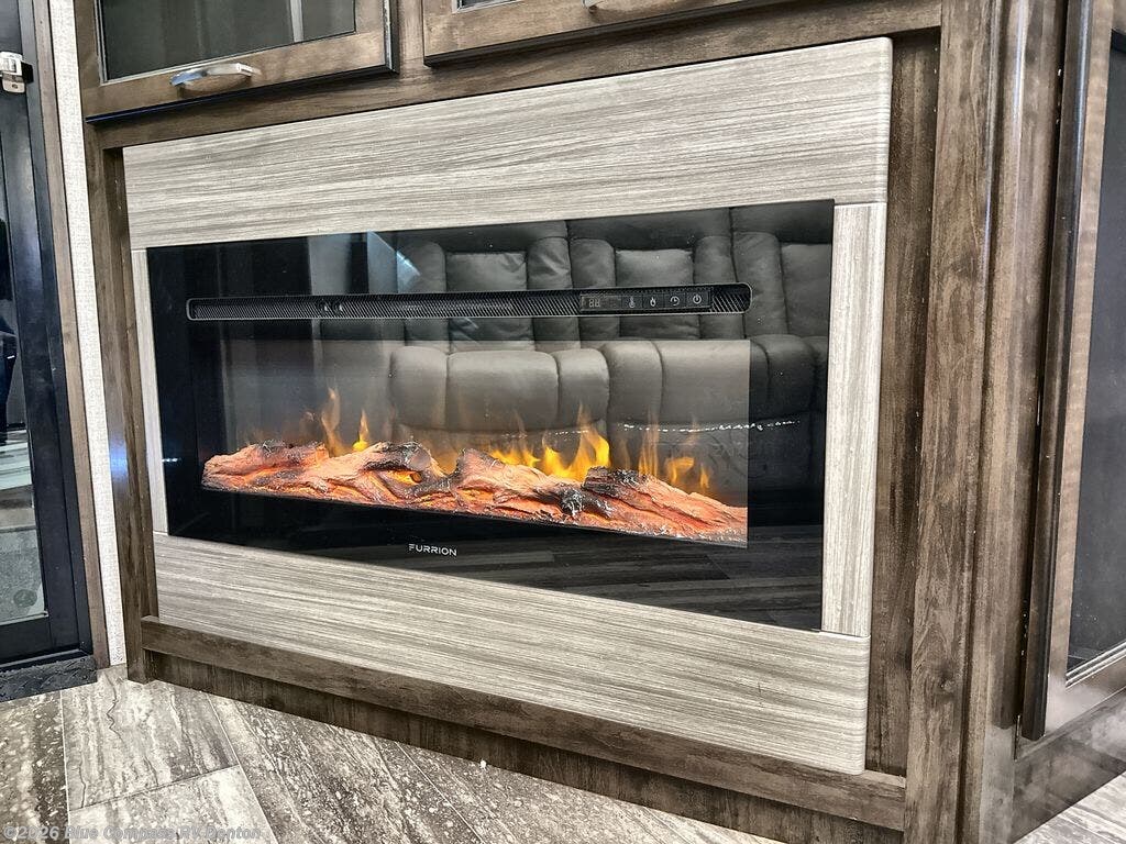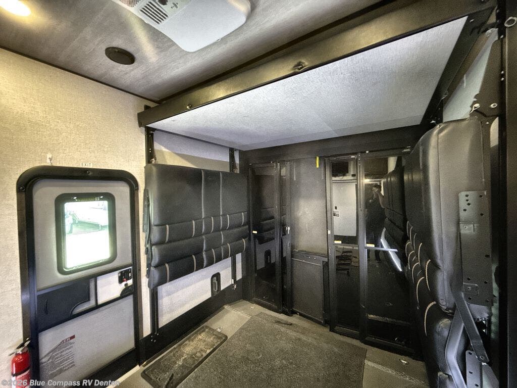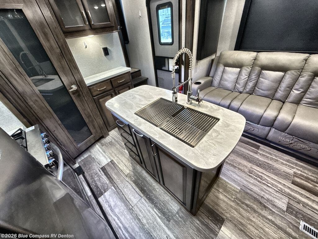 There is so much convenience packed into this Voltage toy hauler! The 15' separate garage comes equipped with a half bathroom, a garage TV, the second exterior entry door, and sleeping accommodations which will provide you with an excellent guest suite. You will actually have your own master suite with a king-size bed up at the front of this unit, and everyone will benefit from the exterior entertainment center. The main kitchen/living area has two opposing slides so that you can sit back on the residential sofa with heat and massage as you take in the warmth of the fireplace, and the pendant lighting above the kitchen island is a stunning addition to the fully equipped kitchen.