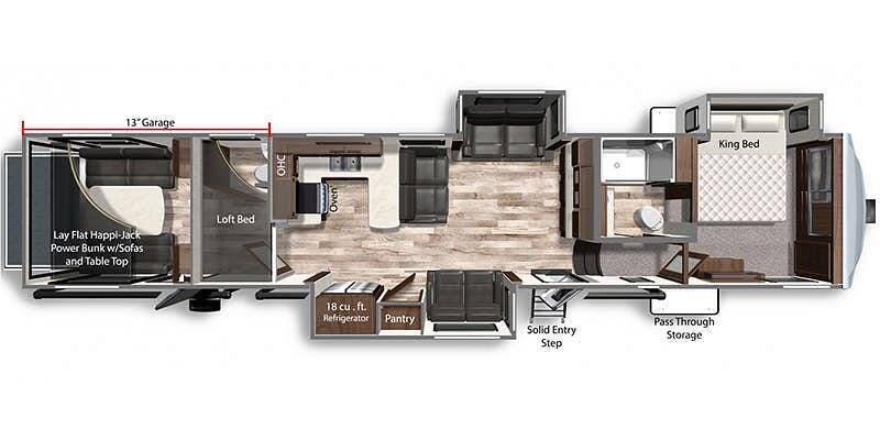 A Lay-Flat Happi-Jac Power Bunk with Sofa and Tabletop provides additional sleeping space in the garage, which also features a half-bath and washer-dryer hookups for added convenience.