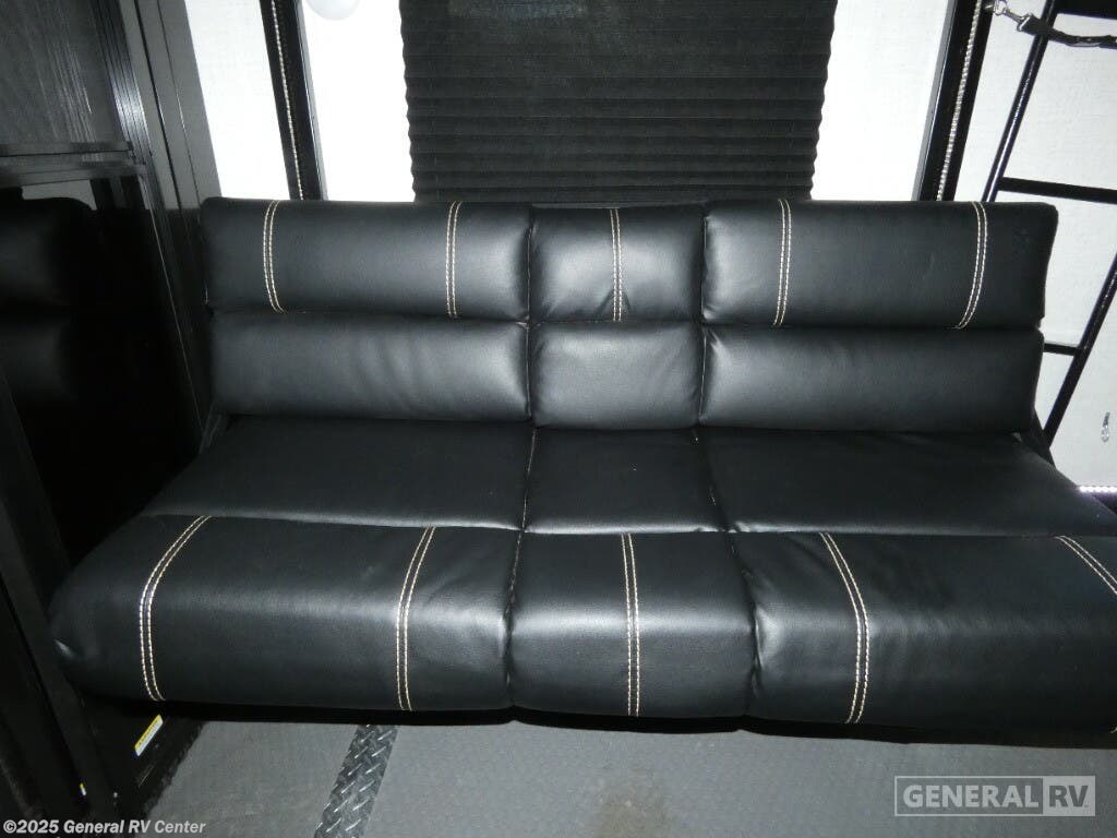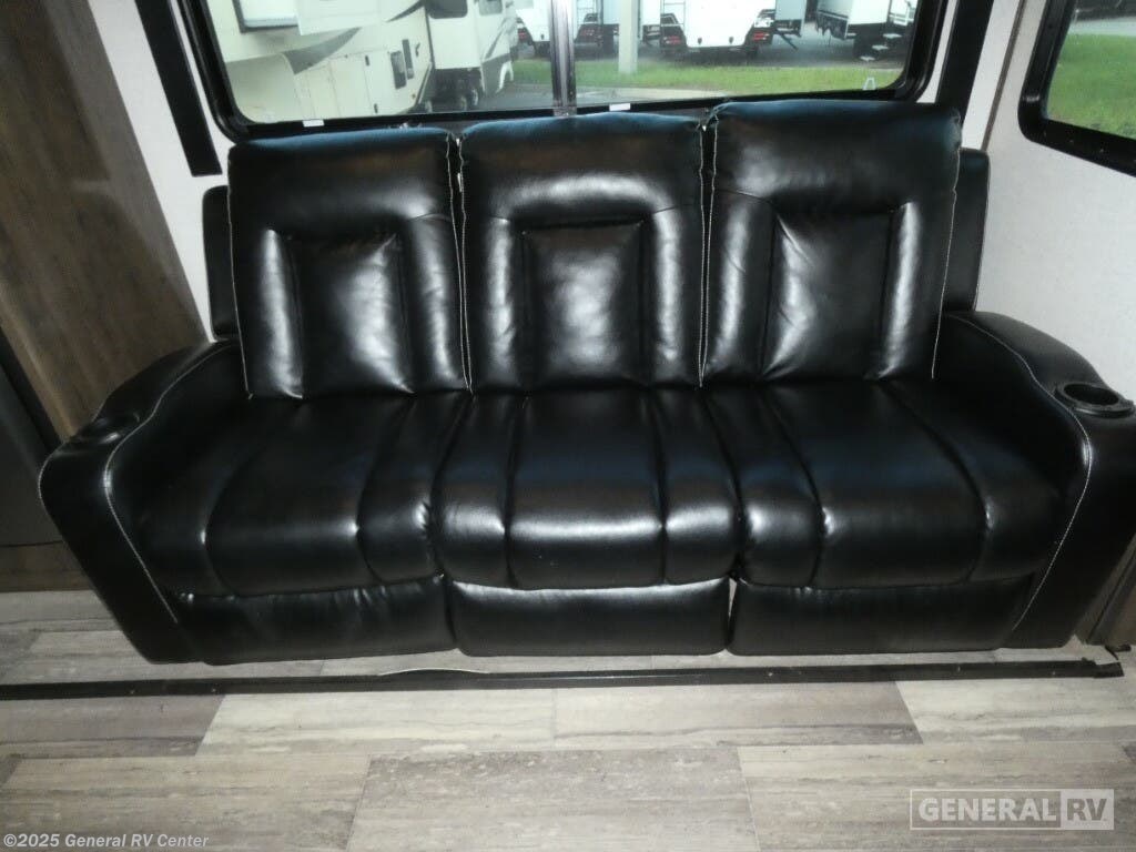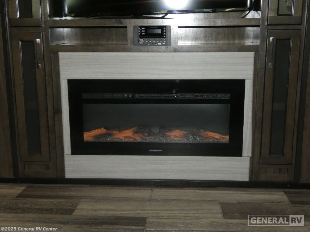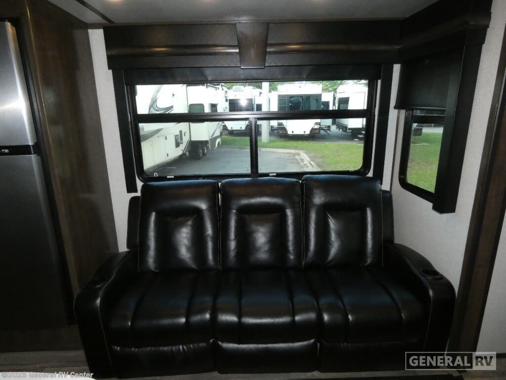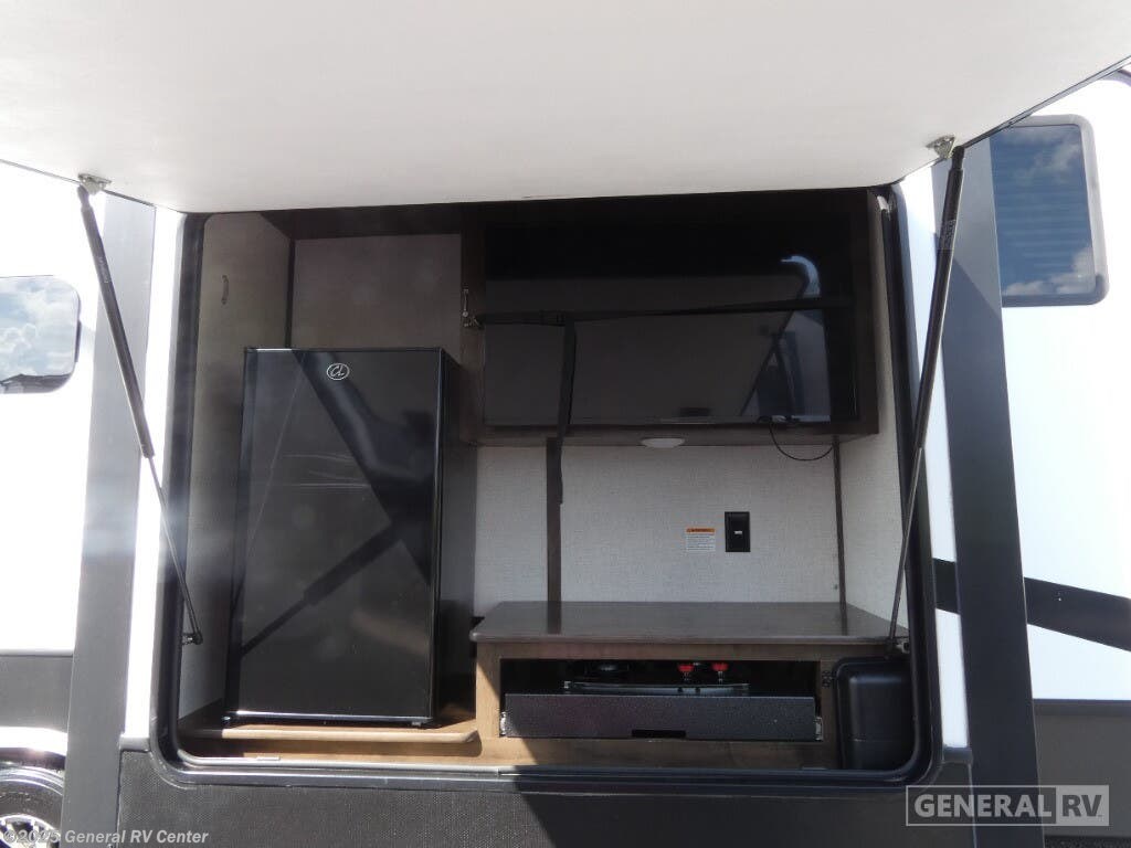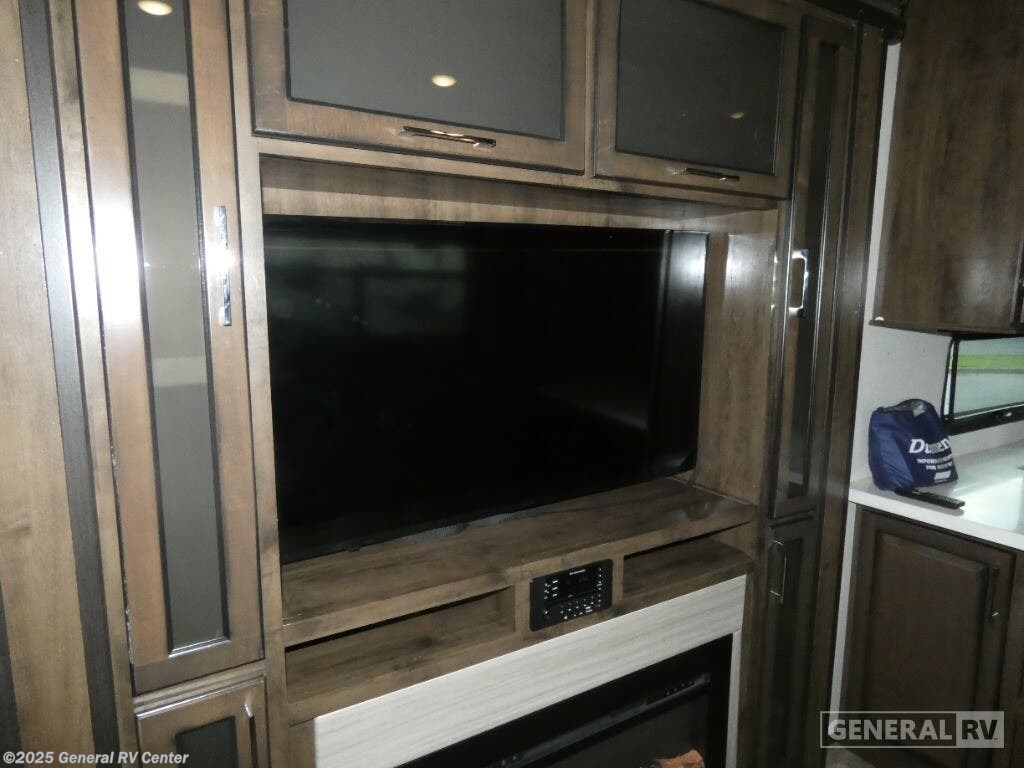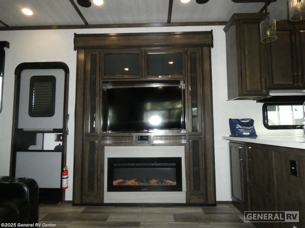 Experience luxury and adventure with the 2021 Dutchmen Voltage 4145. This stunning fifth wheel is designed to elevate your travel lifestyle with its spacious and thoughtfully crafted layout. The centerpiece of this RV is a 13-foot garage, perfect for bringing along your favorite outdoor toys. Inside, you'll find a harmonious blend of comfort and functionality. The center kitchen is equipped with a full-size refrigerator and a three-burner cooktop, making meal prep a breeze. With a cozy fireplace in the living area, relaxation comes easy after a day of exploration. The Voltage 4145 boasts ample sleeping accommodations for up to seven guests, featuring a king bed in the front bedroom, a queen bed, and a convertible bed. The twin bed loft adds an extra touch of versatility. Enjoy the convenience of a washer and dryer prep area, ensuring you're always ready for the next adventure. With three slides, this RV provides plenty of room to spread out, while the powered retractable awning creates the perfect outdoor living space. Whether you're on a weekend getaway or an extended road trip, this RV offers the perfect blend of luxury and practicality. For more details, visit your nearest General RV dealership.