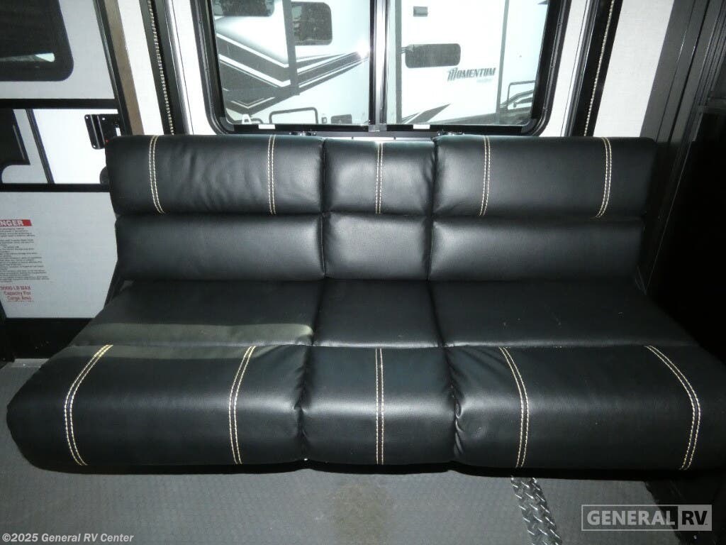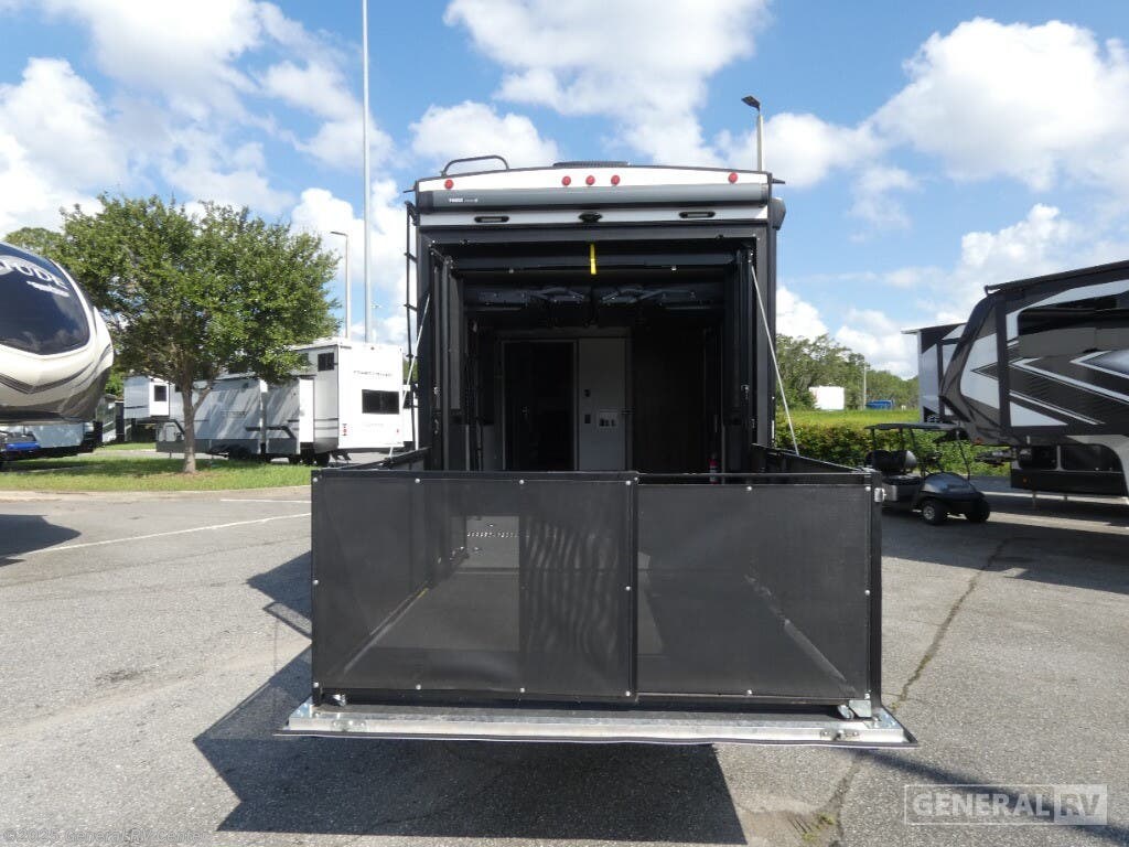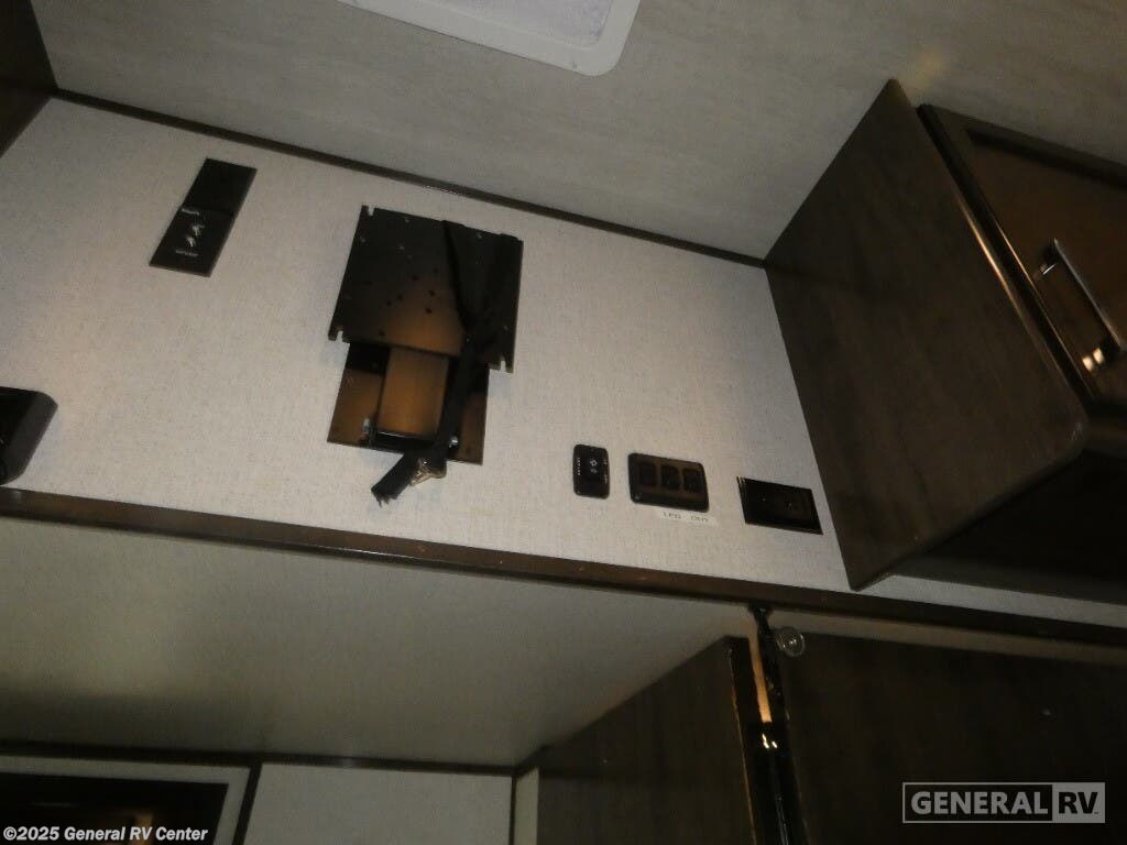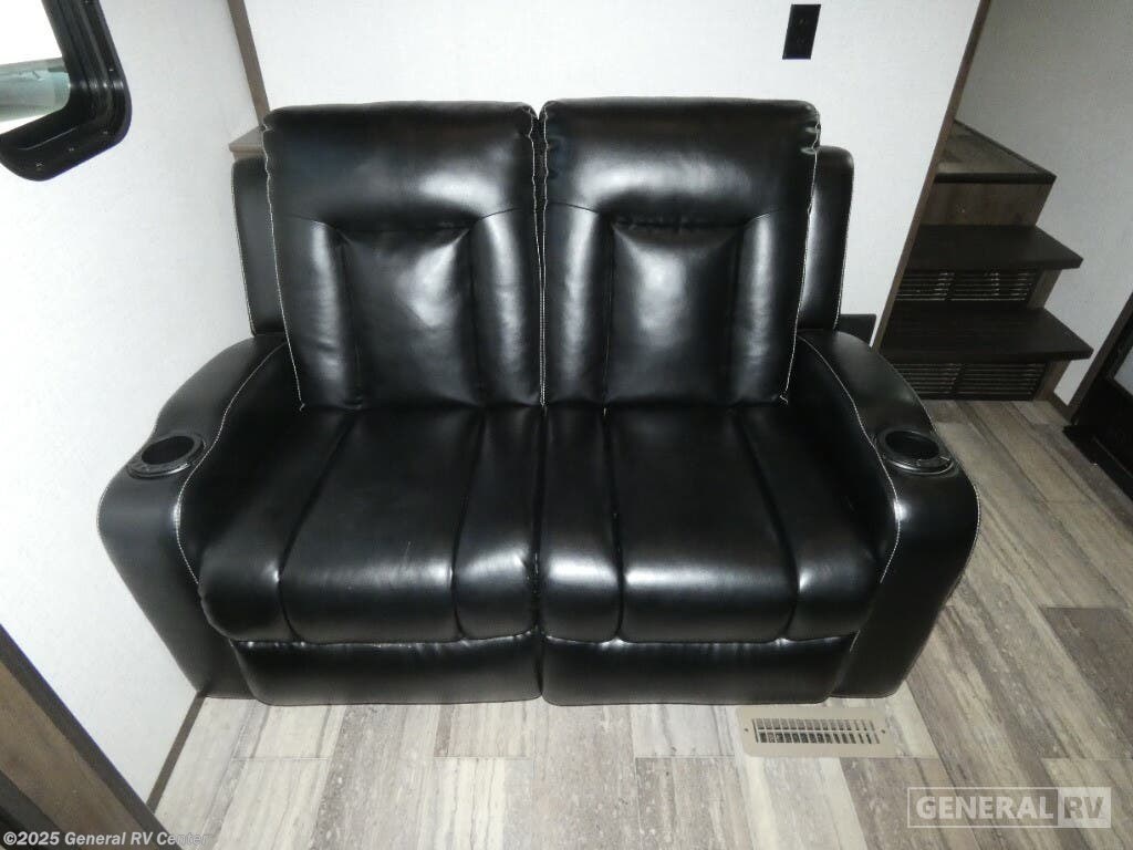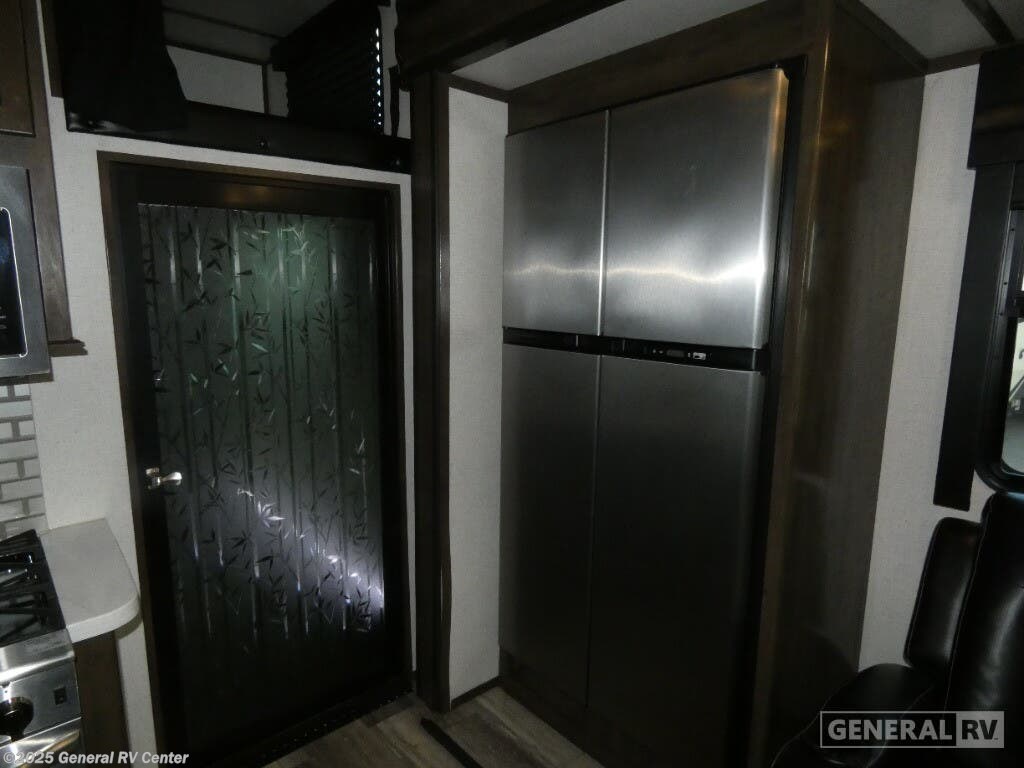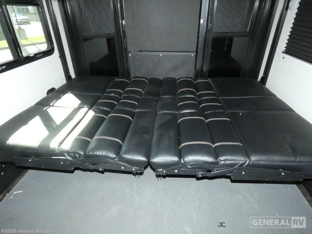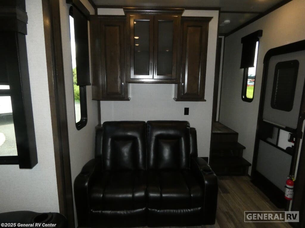 Experience luxury and adventure with the 2021 Dutchmen Voltage 4145. This stunning fifth wheel is designed to elevate your travel lifestyle with its spacious and thoughtfully crafted layout. The centerpiece of this RV is a 13-foot garage, perfect for bringing along your favorite outdoor toys. Inside, you'll find a harmonious blend of comfort and functionality. The center kitchen is equipped with a full-size refrigerator and a three-burner cooktop, making meal prep a breeze. With a cozy fireplace in the living area, relaxation comes easy after a day of exploration. The Voltage 4145 boasts ample sleeping accommodations for up to seven guests, featuring a king bed in the front bedroom, a queen bed, and a convertible bed. The twin bed loft adds an extra touch of versatility. Enjoy the convenience of a washer and dryer prep area, ensuring you're always ready for the next adventure. With three slides, this RV provides plenty of room to spread out, while the powered retractable awning creates the perfect outdoor living space. Whether you're on a weekend getaway or an extended road trip, this RV offers the perfect blend of luxury and practicality. For more details, visit your nearest General RV dealership.