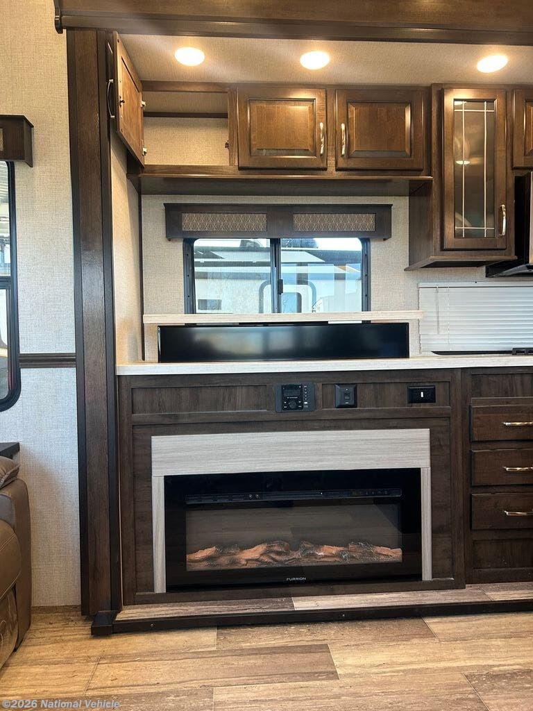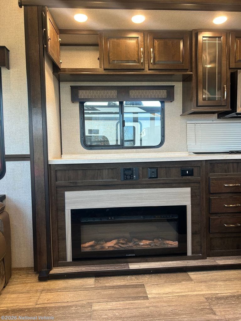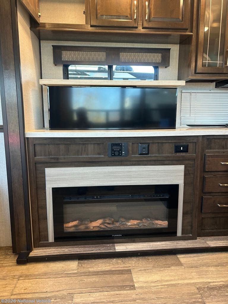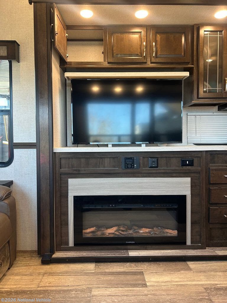 The wide-open rear lounge features opposing slide-outs that create a generous living space ideal for relaxing or entertaining. Large panoramic windows provide exceptional natural light and campsite views. Enjoy theater seating, a tri-fold sleeper sofa for guests, and a full entertainment center complete with a large LED TV and fireplace.