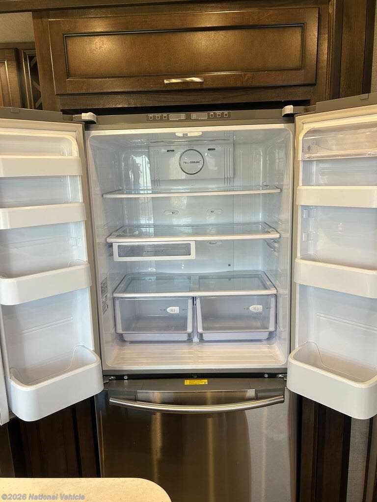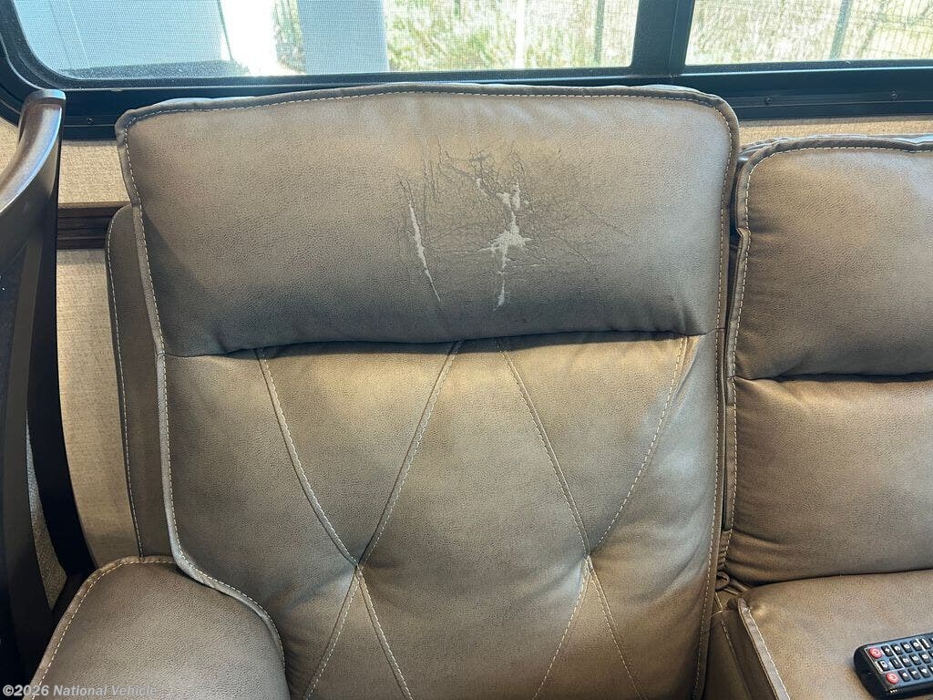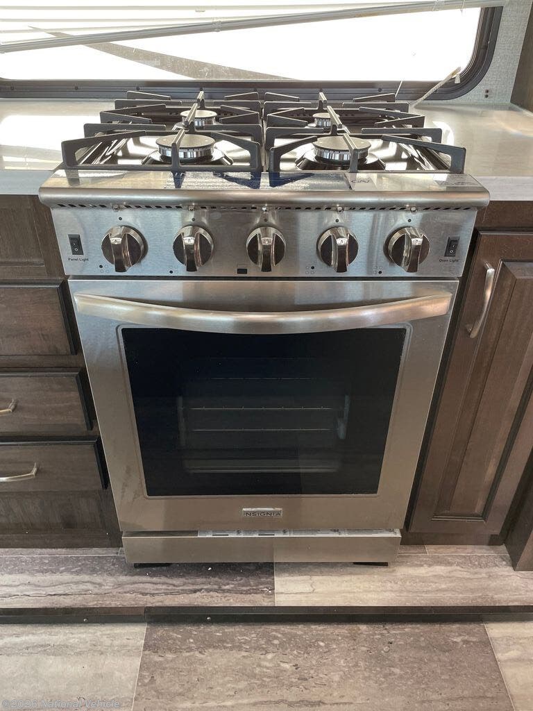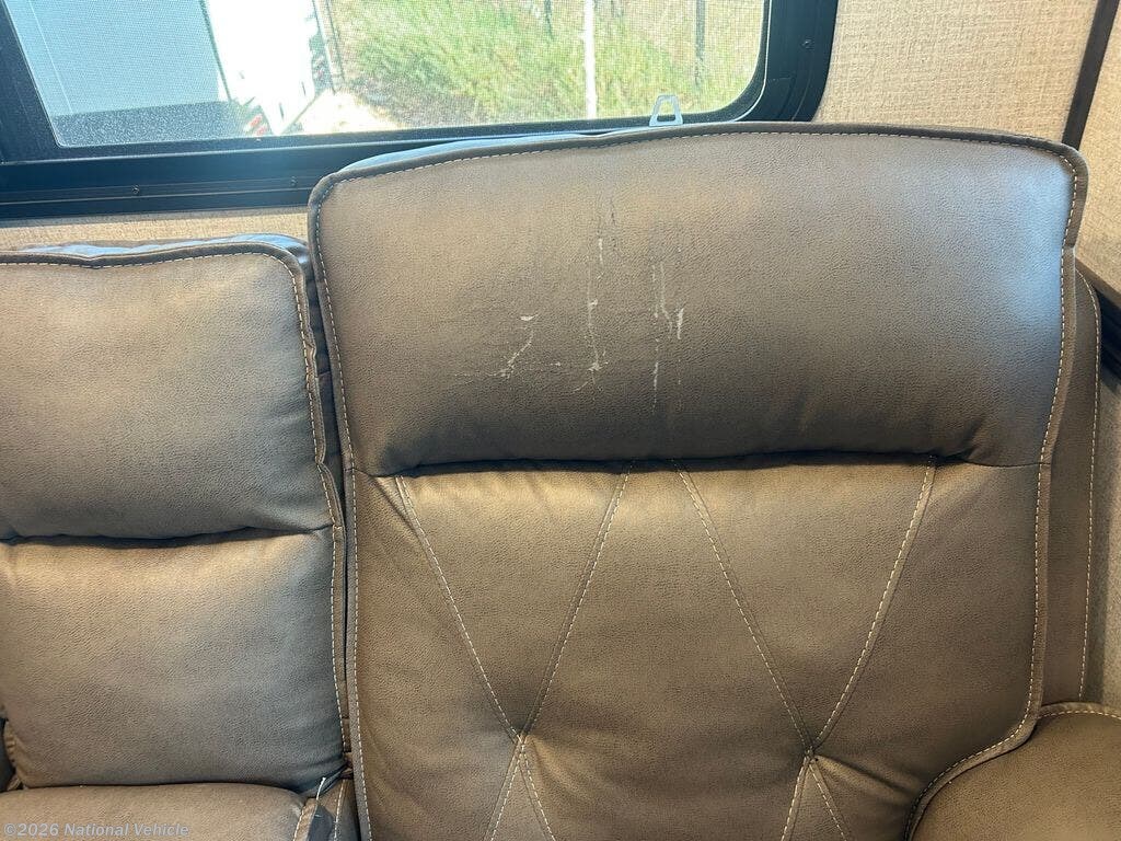 The wide-open rear lounge features opposing slide-outs that create a generous living space ideal for relaxing or entertaining. Large panoramic windows provide exceptional natural light and campsite views. Enjoy theater seating, a tri-fold sleeper sofa for guests, and a full entertainment center complete with a large LED TV and fireplace.