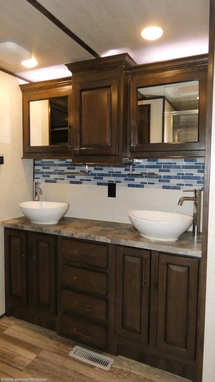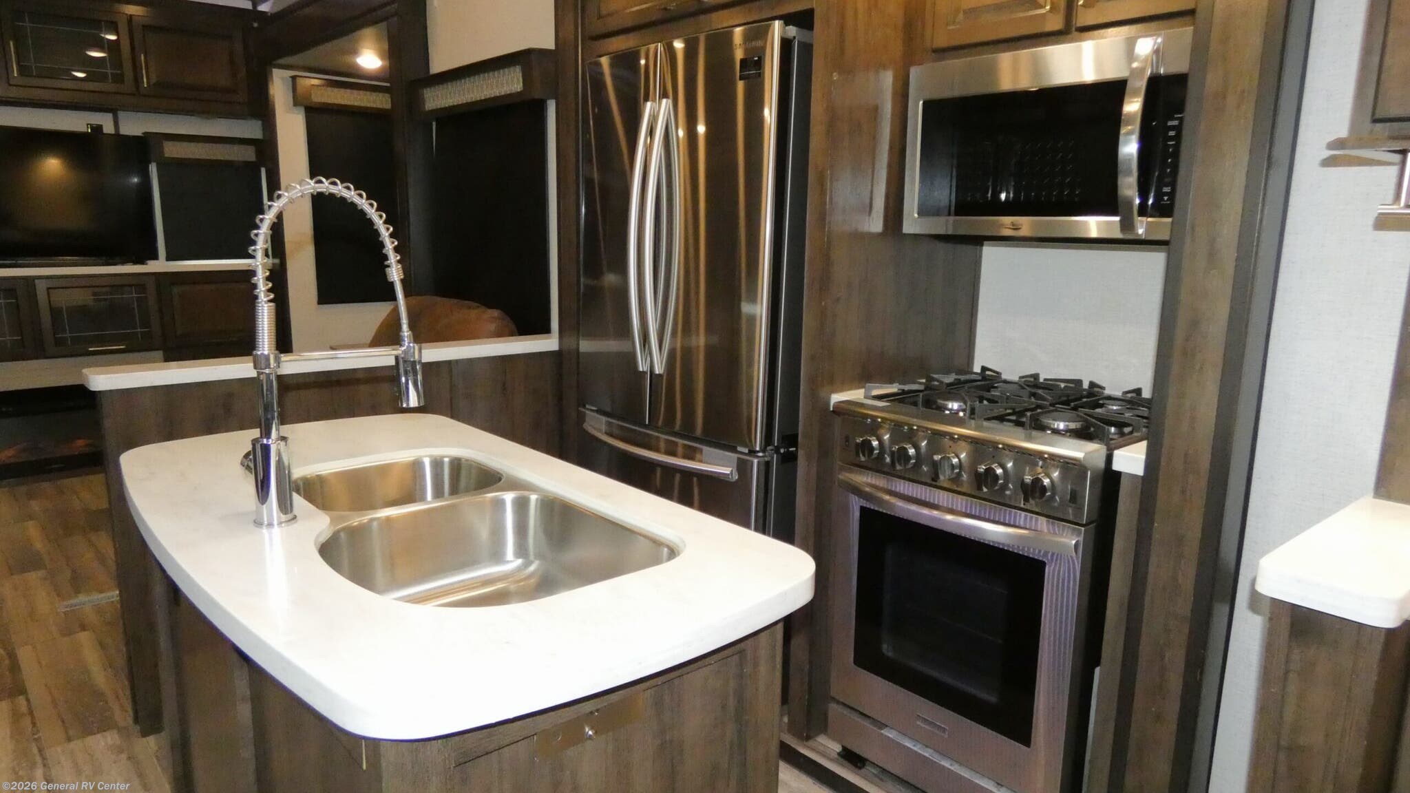 **Dutchmen Yukon fifth wheel 410RD highlights:** * Master Suite * Dual-Sink Vanity * Kitchen Island * Separate Living Room * Two Fireplaces * Exterior Storage For those who want to know what it's like to enjoy glamorous camping, this Yukon fifth wheel is just the ticket! There is so much luxury in this unit with the king-size bed and fireplace in the private master suite up front, and since the bedroom has a private entrance into the dual-entry bathroom with two sinks at the vanity, you will actually look forward to getting ready in the morning. The kitchen is filled with extremely helpful and stylish amenities, like the high-rise faucet in the stainless steel double-bowl sink, the Samsung French door refrigerator, the four-burner cooktop, and the oversized convection microwave. Plus, after all of your day's tiresome adventures, spend the evening relaxing in front of the second fireplace in the rear living room on one of the electric residential recliner sofas. Discover residential camping at its finest with the Dutchmen Yukon fifth wheels! The entire Yukon is spectacular and accommodating and will make every journey feel like home. The upgraded RotaFlex pin box will make towing on tougher roads smooth as ever, and you'll enjoy hassle-free set up with the 6-point auto-leveling. Each Yukon features the All Weather Package that includes additional insulation with 12V tank pads, and the 100" wide body construction will provide your family will more space to walk around, relax, and store your belongings. Inside, you will enjoy the panoramic windows for beautiful outdoor views, the electric powered theater seating for your comfort, and the custom wardrobe with a large closet and drawers for all your items. The industry-leading 7' slide out ceiling height will give you plenty of headroom to stretch out in luxury, and the chef of your family will appreciate the largest counterspace in the industry. Your home away from home is a Yukon fifth wheel by Dutchmen. Choose your favorite layout today!