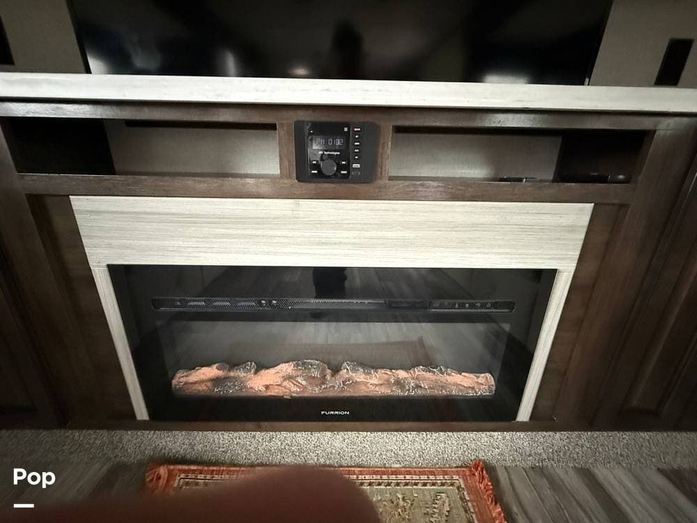The elevated front living area is designed for socializing, featuring two opposing tri-fold sofas and a front entertainment center with a built-in fireplace. Large windows in the front cap provide a wide view and plenty of natural light, keeping the lounge bright and open.
