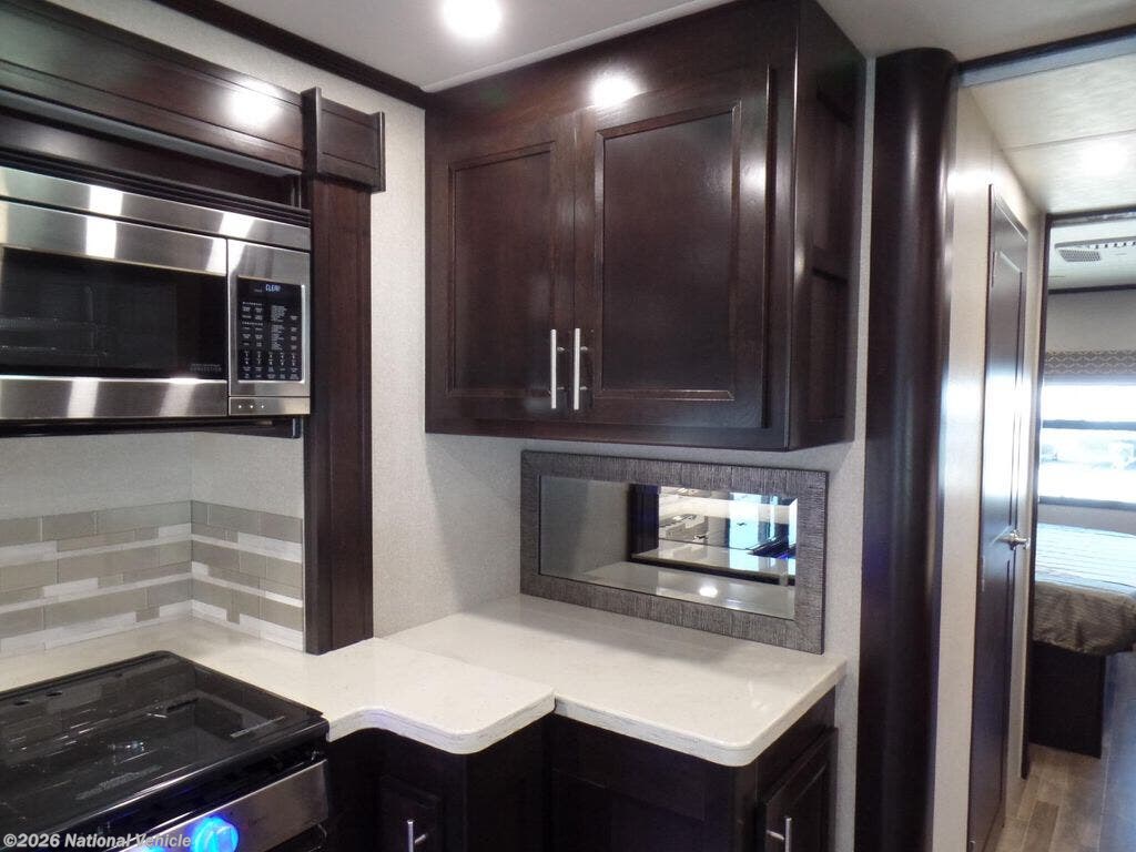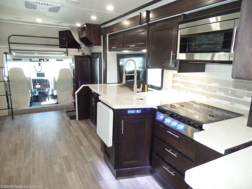 The living area is equipped for entertainment and relaxation with a 39" LED Smart TV on a swivel bracket and premium sound options, while the well-appointed galley features solid-surface countertops and high-end appliances to make meal prep a breeze.