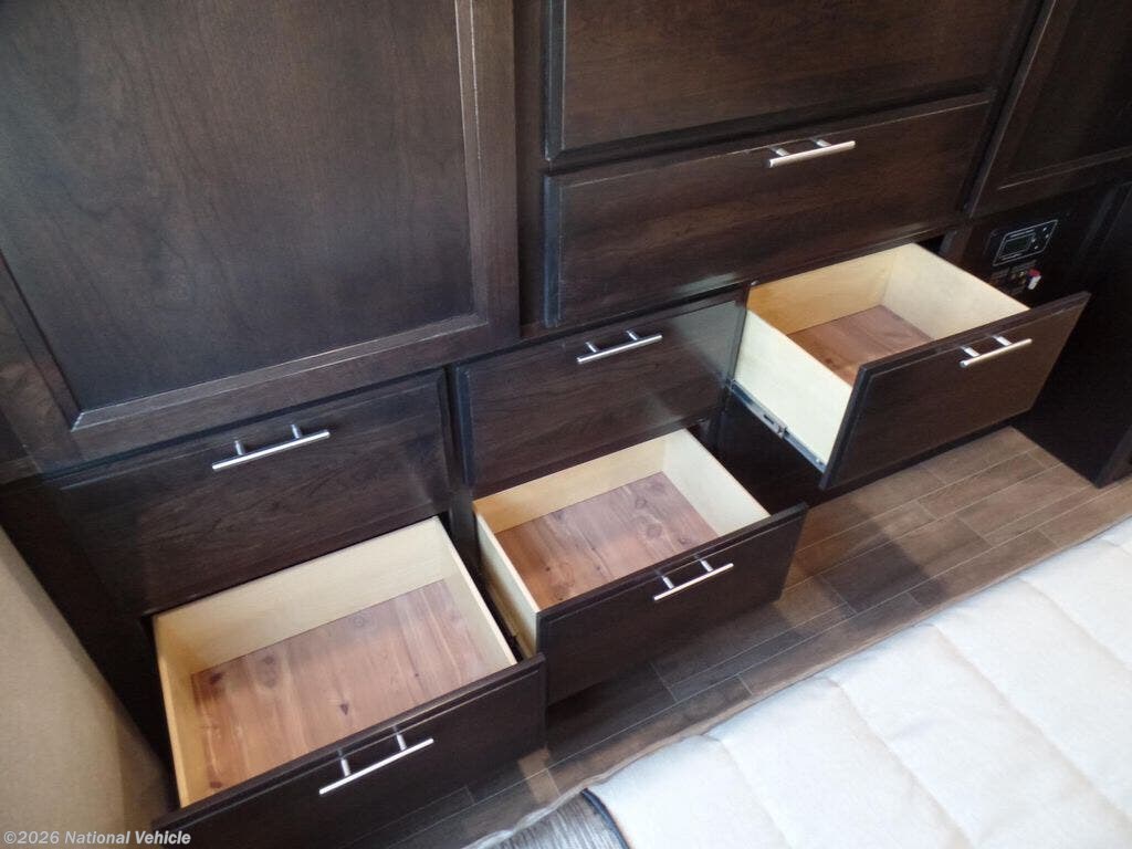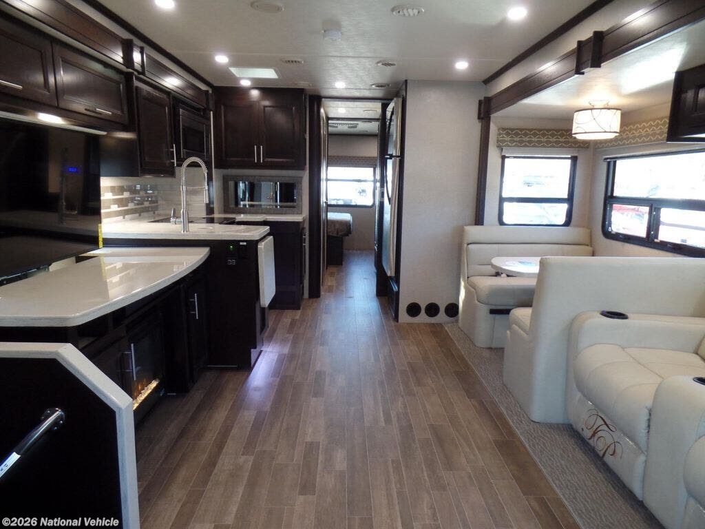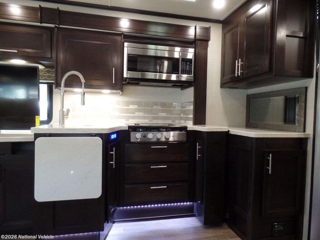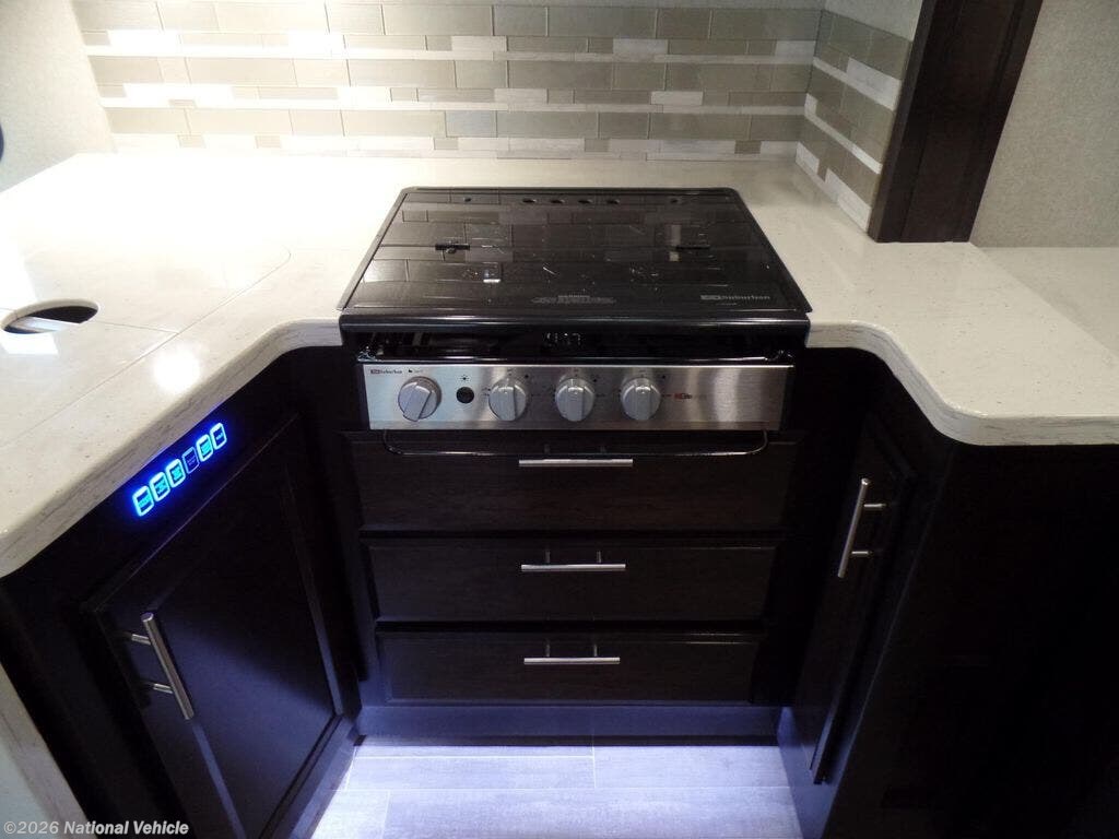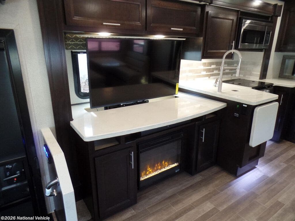 The living area is equipped for entertainment and relaxation with a 55" LED Smart TV that retracts behind fireplace when not in use and premium sound options, while the well-appointed galley features solid-surface countertops and high-end appliances to make meal prep a breeze.