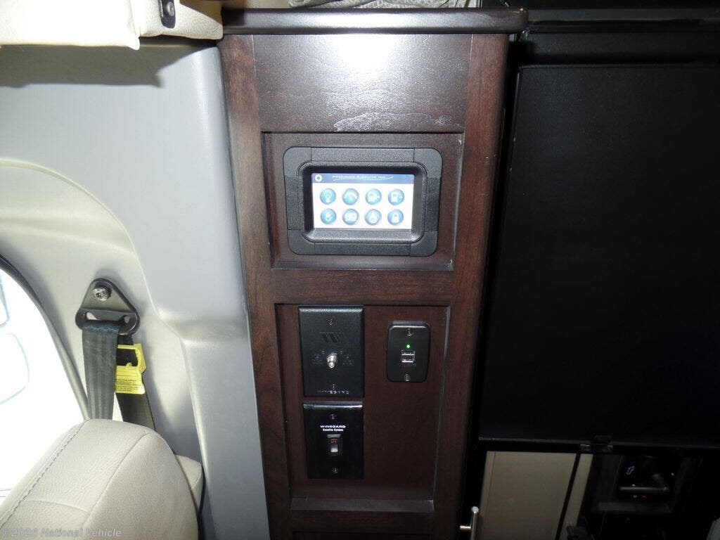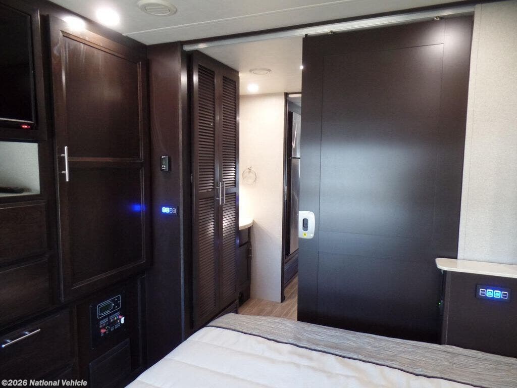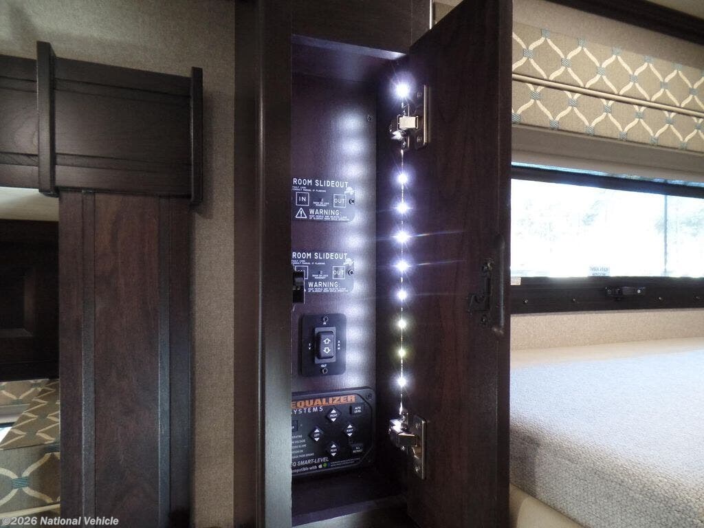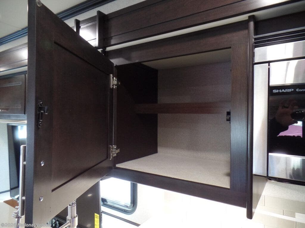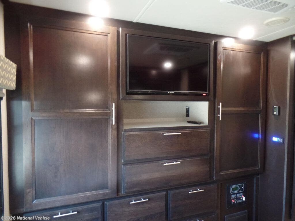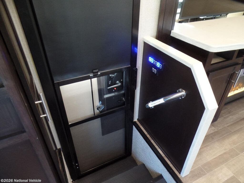 The living area is equipped for entertainment and relaxation with a 55" LED Smart TV that retracts behind fireplace when not in use and premium sound options, while the well-appointed galley features solid-surface countertops and high-end appliances to make meal prep a breeze.