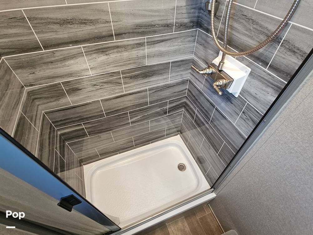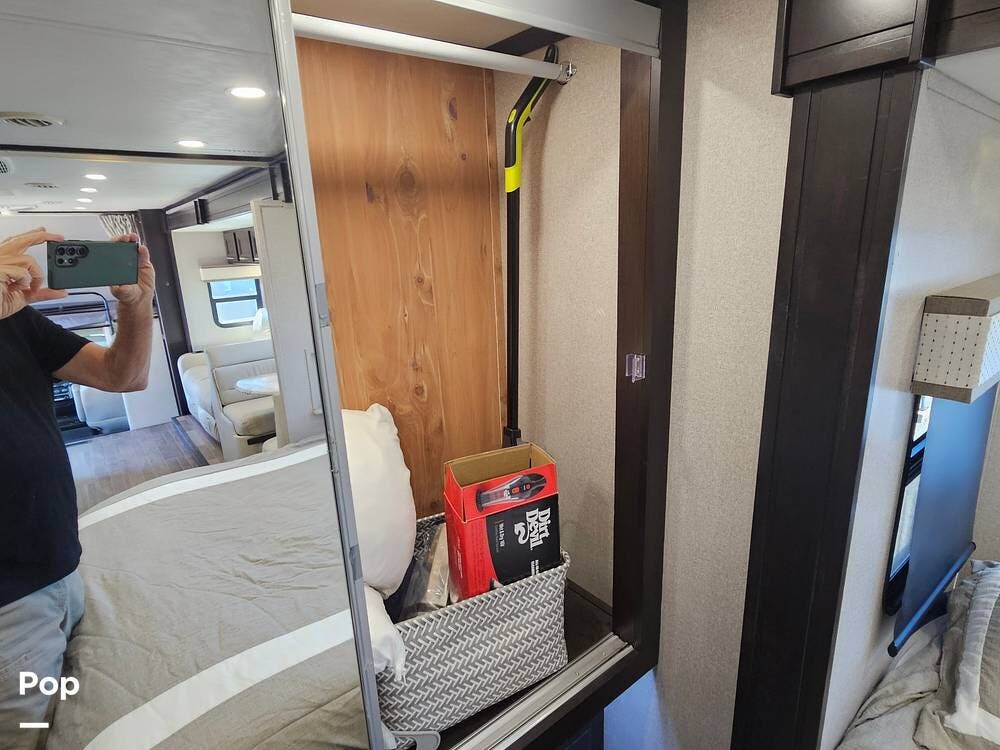 The roomy corner bath has a nice-sized shower. The full-size queen bed, spacious wardrobe, and dresser drawers complete this unique Class C.
