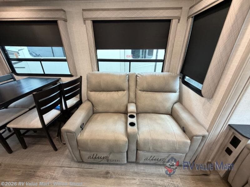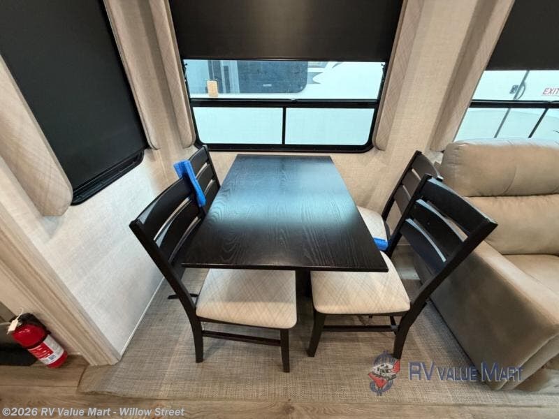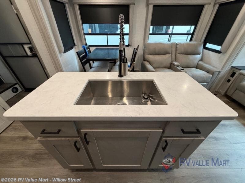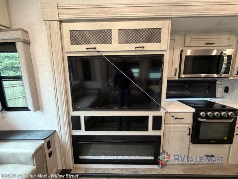 Get ready to find adventure when you take this Tandara camping or glamping! Inside, you can sleep on your own walk-around king bed, get cleaned up in the full bathroom with a seamless fiberglass shower, and watch the 50" TV on a swing arm with a fireplace below for those chilly nights. The residential microwave and refrigerator allow you to cook like at home, and the double-door pantry and coat closet gives you extra room for all the snacks. The kitchen island provides a deep-seated stainless steel sink with roll-up drying rack and residential high-rise faucet with pull-down sprayer making cleaning the dishes super easy. You can relax on the hide-a-bed sofa or theater seating and dine at the wall-mounted free-standing table with four chairs. And don't forget about the two power awnings offering a nice living space outside protected from the elements.