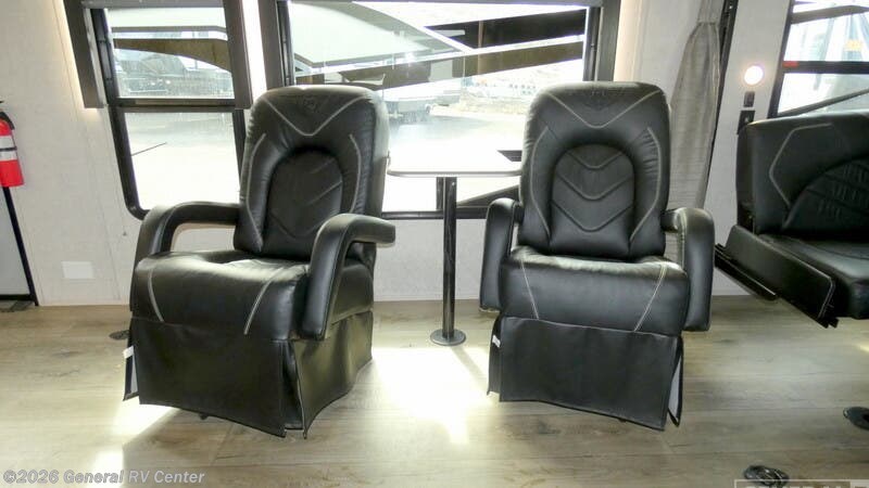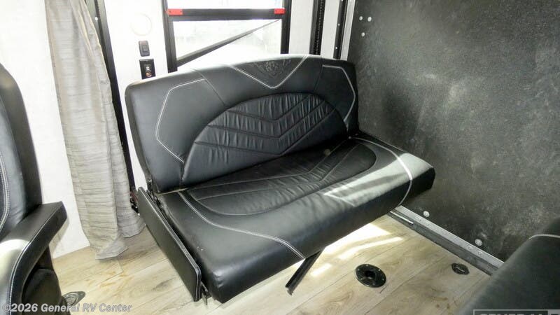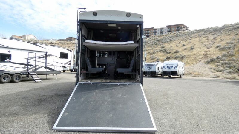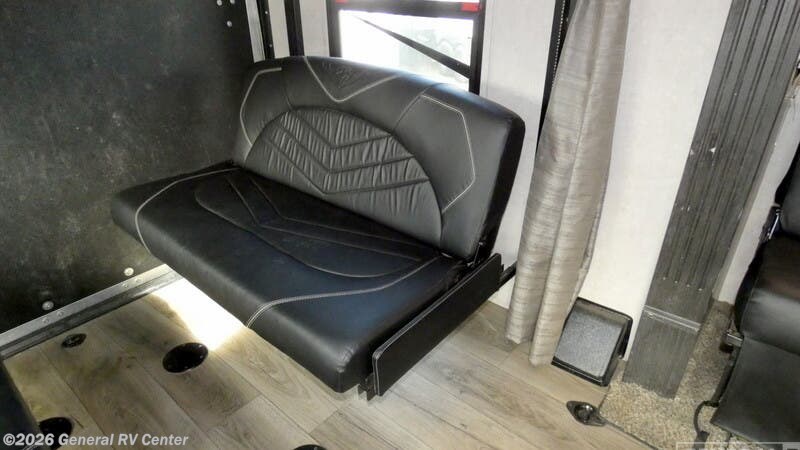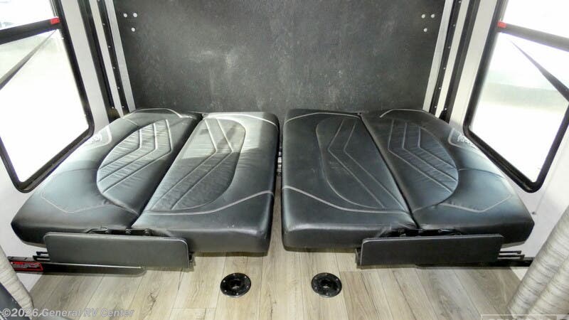 **Eclipse Attitude Wide Lite toy hauler 2814SS highlights:** - Two Lounge Chairs - Peninsula Counter - Electric Bed/Dinette - Double Entry Bath - Private Bedroom Easily find comfort and lots of legroom in this fifth wheel with a large slide out in the main living and kitchen area that is created after unloading from the cargo area. You can sleep seven family members between the queen bed in the front private bedroom with lots of storage for clothes and such, plus the electric bed and dinette seats in the cargo area, and the sofa next to the refrigerator. Make warm meals using the kitchen amenities, and the peninsula counter offers more space to serve food and wash the dishes. You will find storage throughout in overhead cabinets, and the front bedroom even offers a wardrobe slide option. And don't forget about the 14' to 17'7" of cargo space for your toys! With each Eclipse Attitude Wide Lite toy hauler you begin with a powder coated chassis with laminated, aluminum framed fiberglass sidewalls and fiberglass caps with the front cap having an LED light, and a decked walk-on roof. The 100 AMP lithium LiFePO4 battery/210 watt solar panel, the 40 gallon fuel station, and the 4.0K Onan generator with transfer switch will keep everything up and running when you venture off-grid. The interior offers several colors to choose from to customize your toy hauler, LED lights with a dimmer, versatile sleeping accommodations, and a lighted solid surface galley top. The Hi Rez LED lights, the curbside under glow LED lighting and the Hi Def exterior graphics offer the attitude you are looking for! Make your selection today!