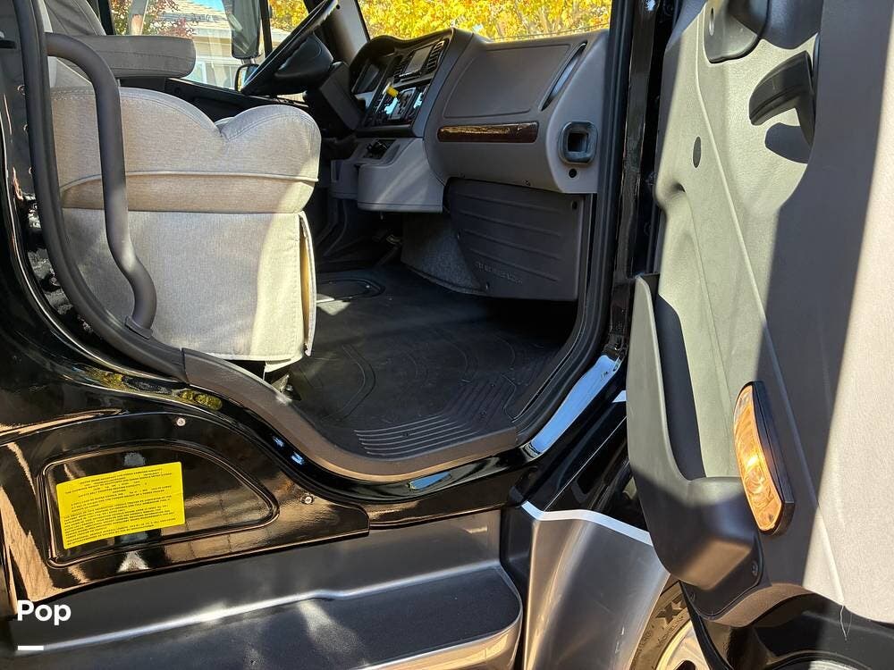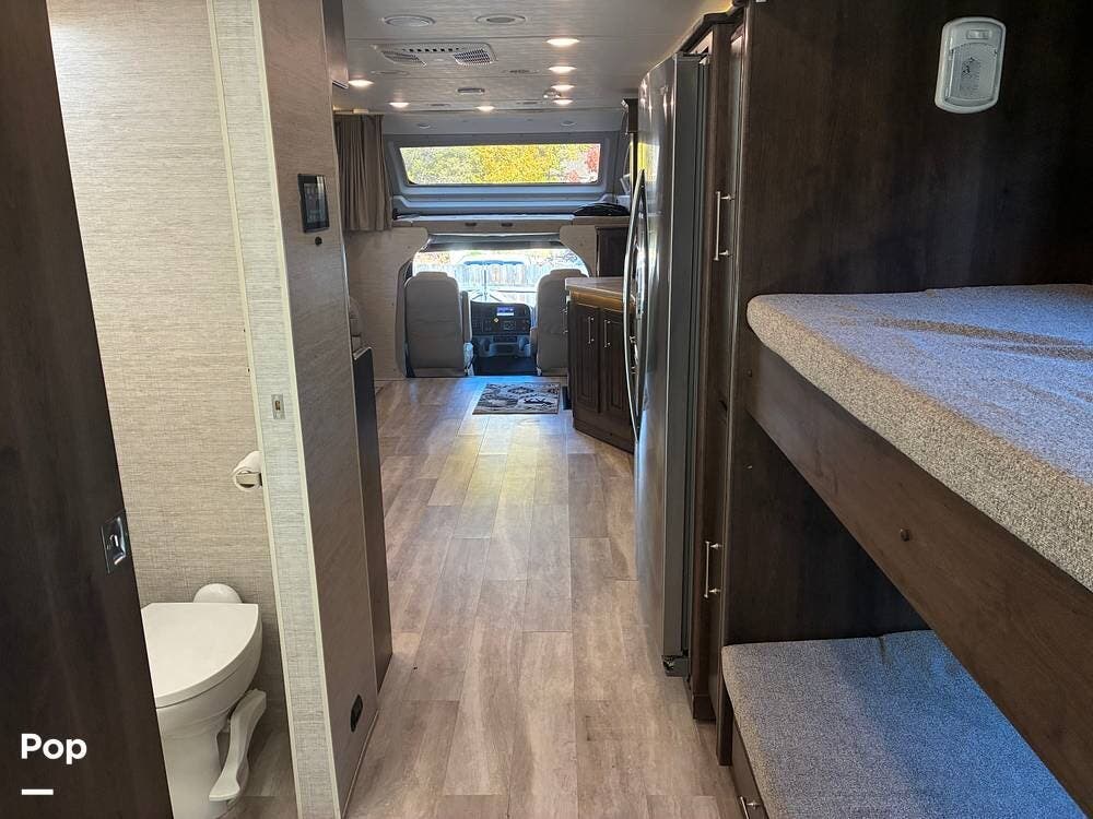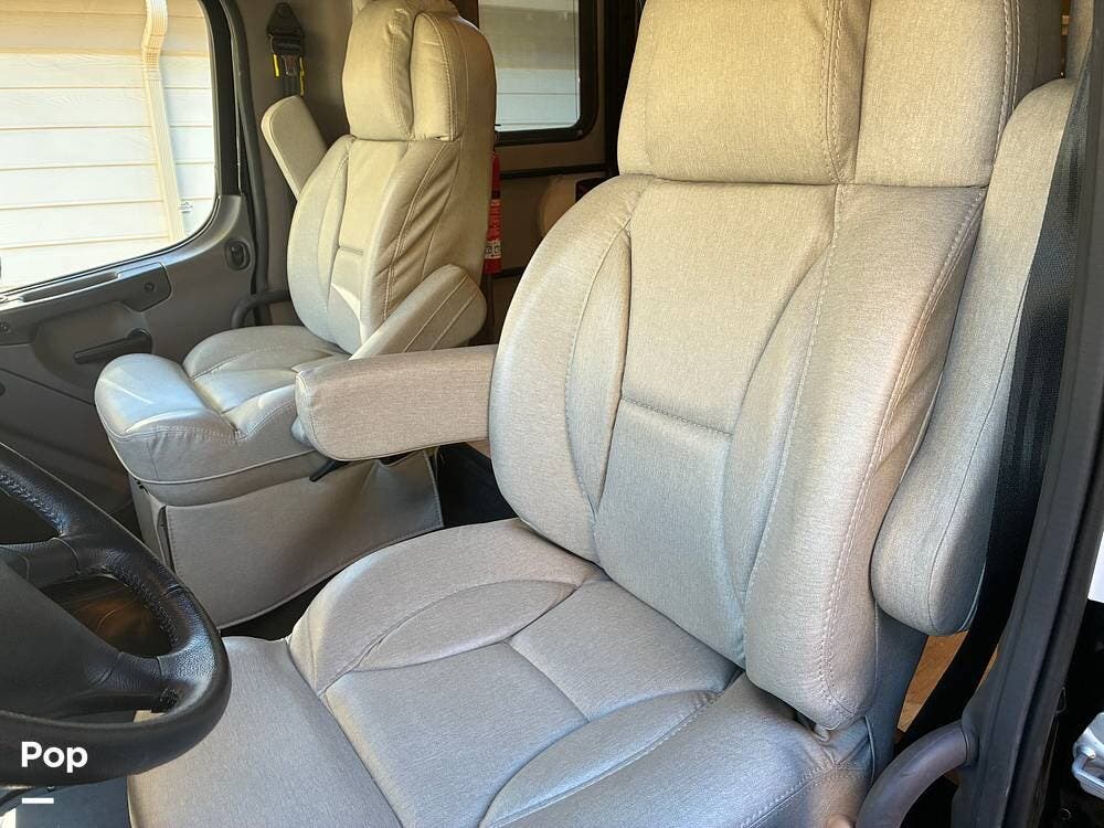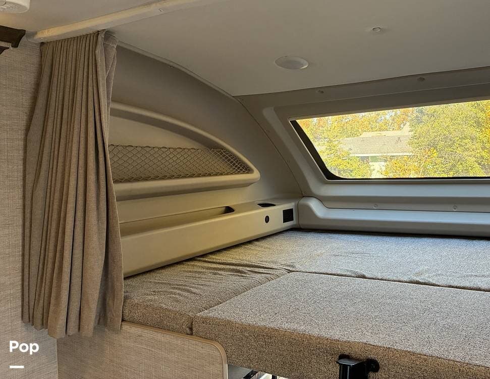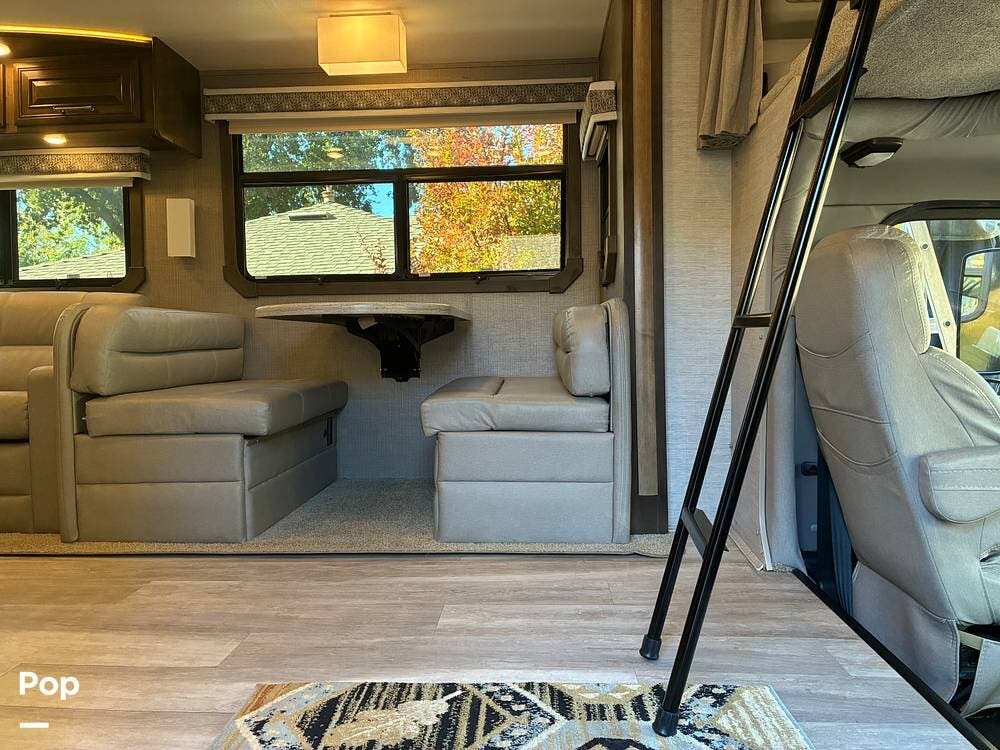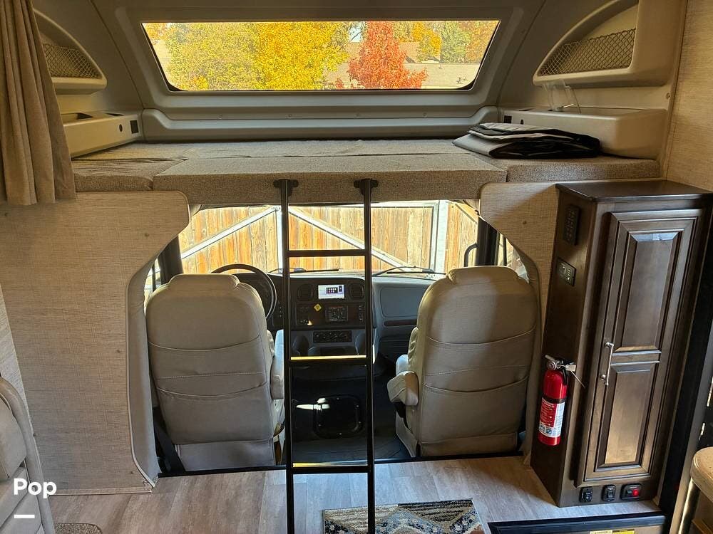 The cab area is designed for comfort on long trips, featuring plush captain's chairs, a panoramic front window, and a full suite of driving conveniences including backup and side-view cameras. Above the cab sits a spacious overhead bunk, providing a versatile sleeping or lounging area ideal for guests or family.