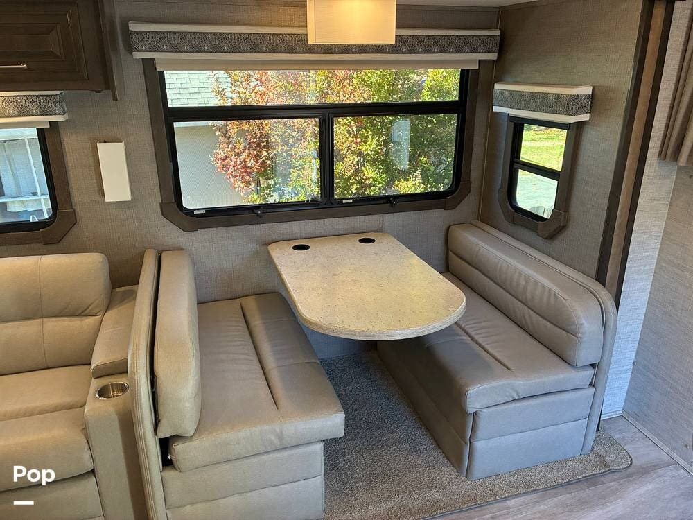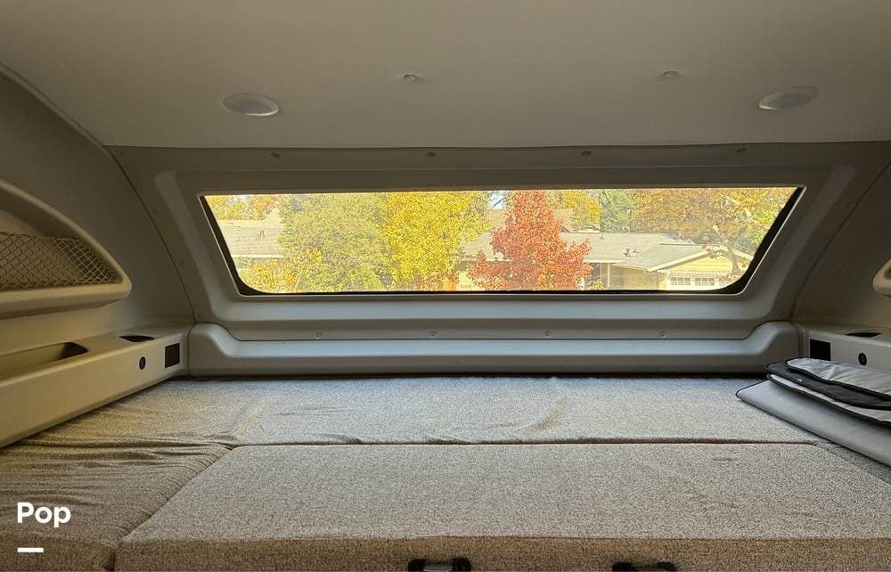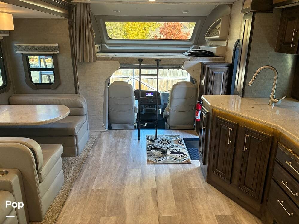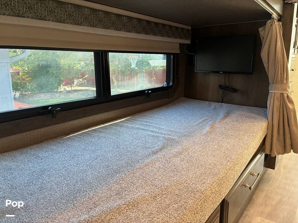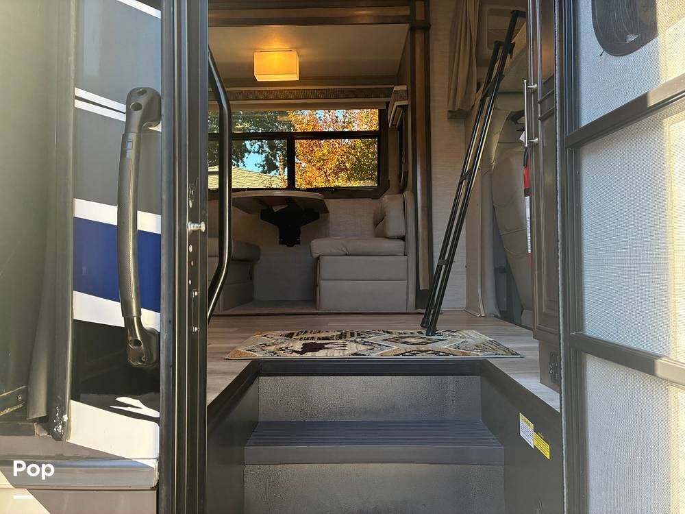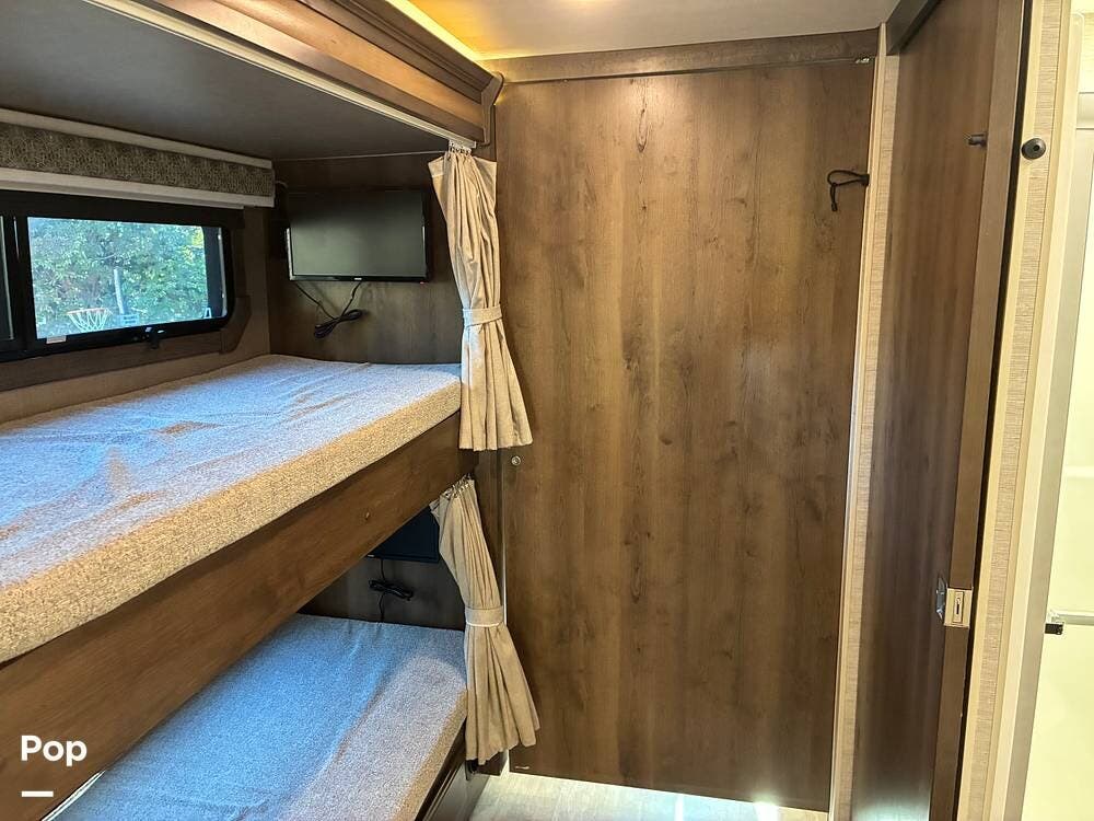 The cab area is designed for comfort on long trips, featuring plush captain's chairs, a panoramic front window, and a full suite of driving conveniences including backup and side-view cameras. Above the cab sits a spacious overhead bunk, providing a versatile sleeping or lounging area ideal for guests or family.